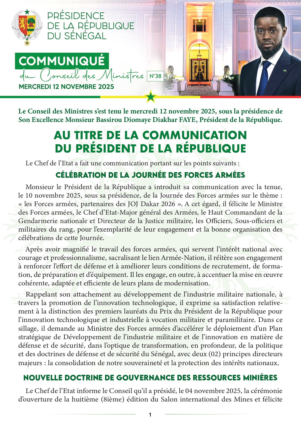Conseil des ministres : nous vous partageons le communiqué de la réunion hebdomadaire de ce mercredi 12 novembre tenue au Palais, sous la présidence de Son Excellence le Chef de l’Etat Bassirou Diomaye Faye.
