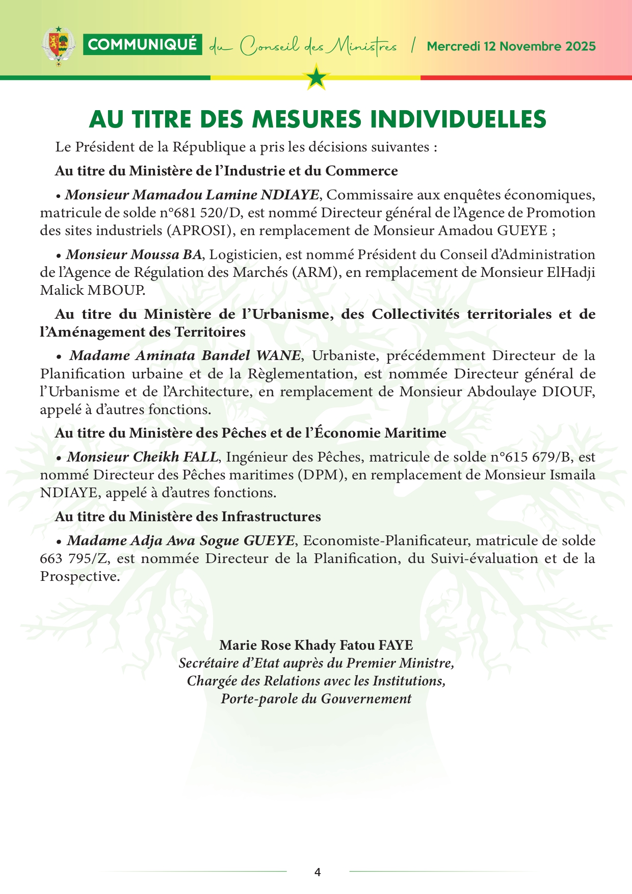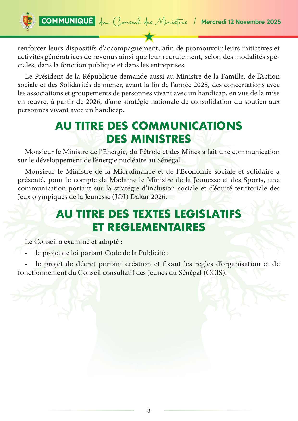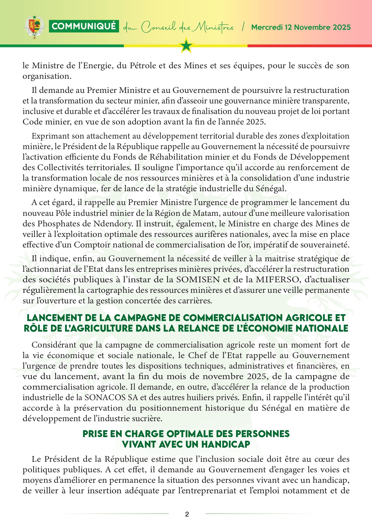 Le communiqué du Conseil des ministres, du mercredi 12 novembre 2025