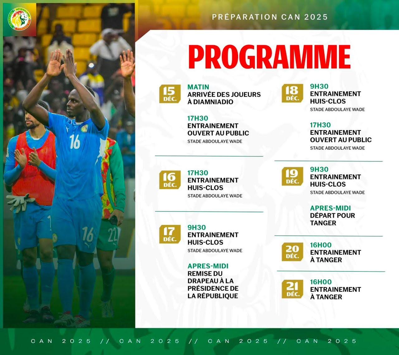 CAN 2025 : les Lions débutent leur préparation ce lundi 15 décembre et la fédération sénégalaise de football a publié l’agenda de leurs activités jusqu’au départ pour Tanger, ville marocaine où ils vont disputer leurs matchs de poule.