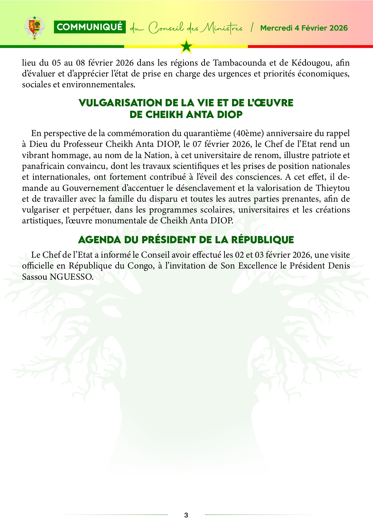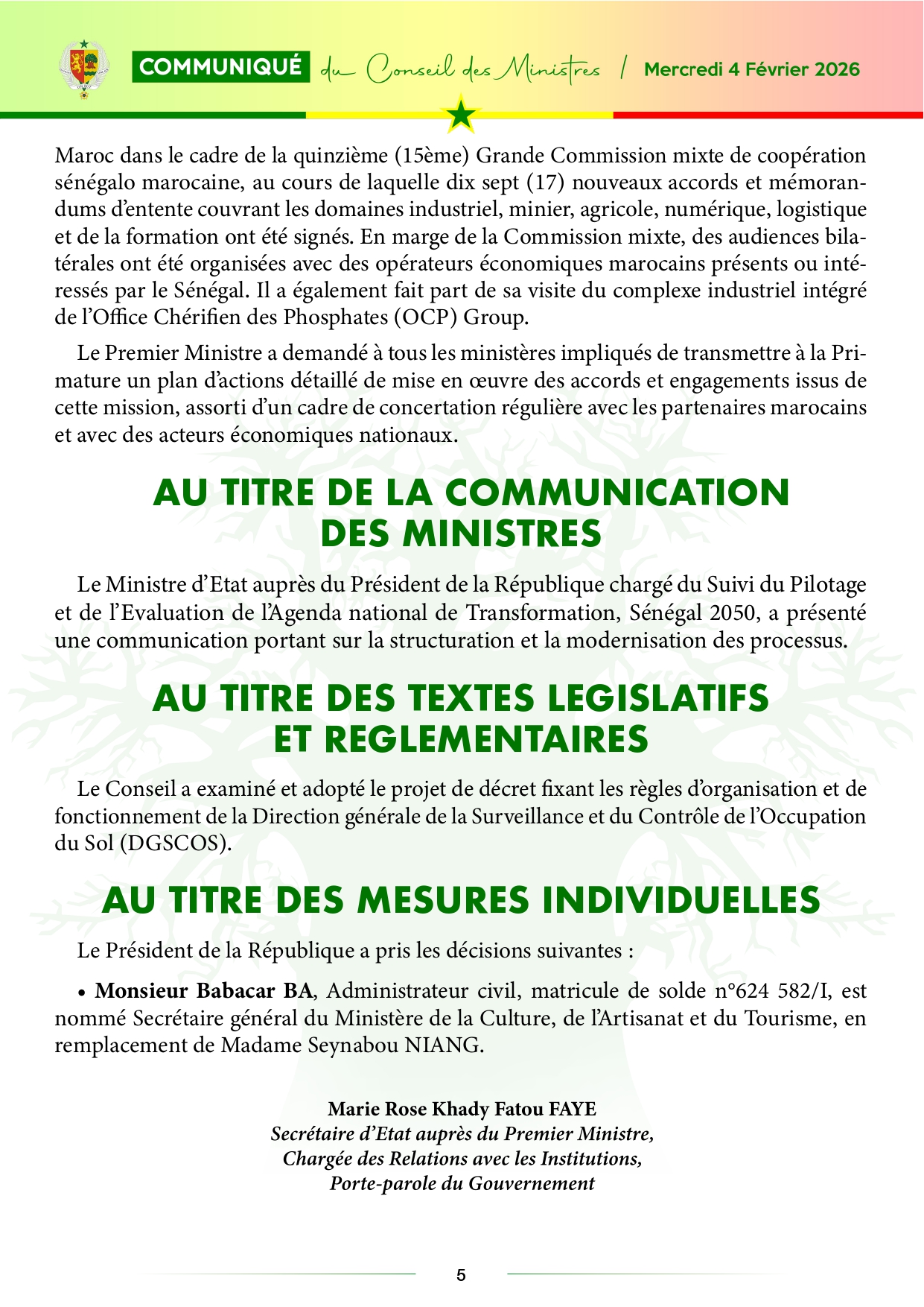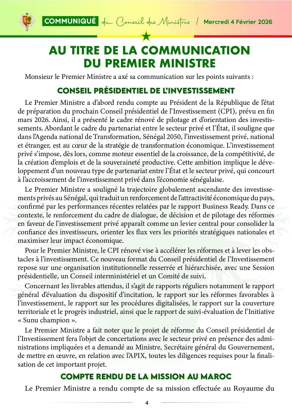 Le communiqué du Conseil des ministres, du 04 février 2026