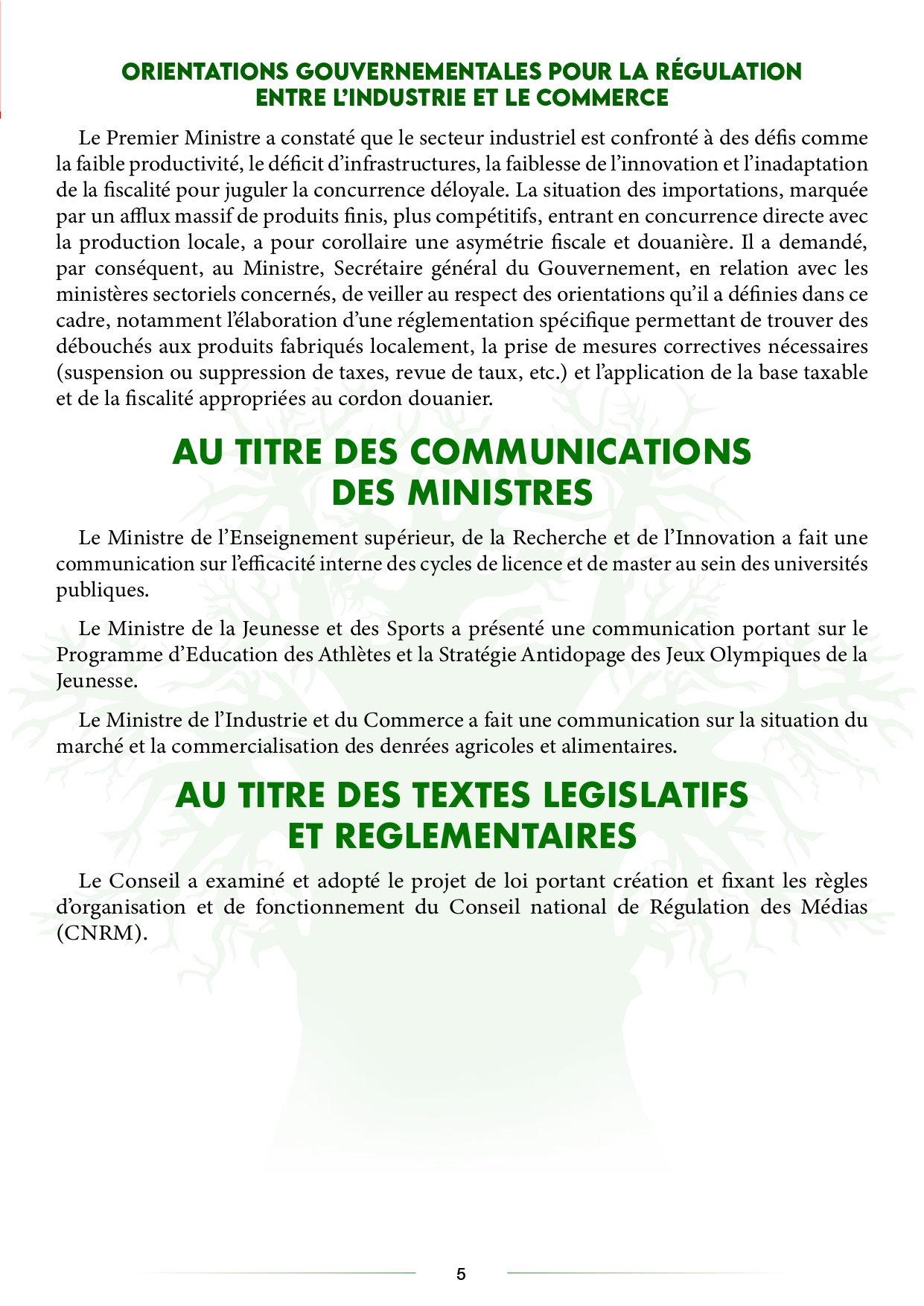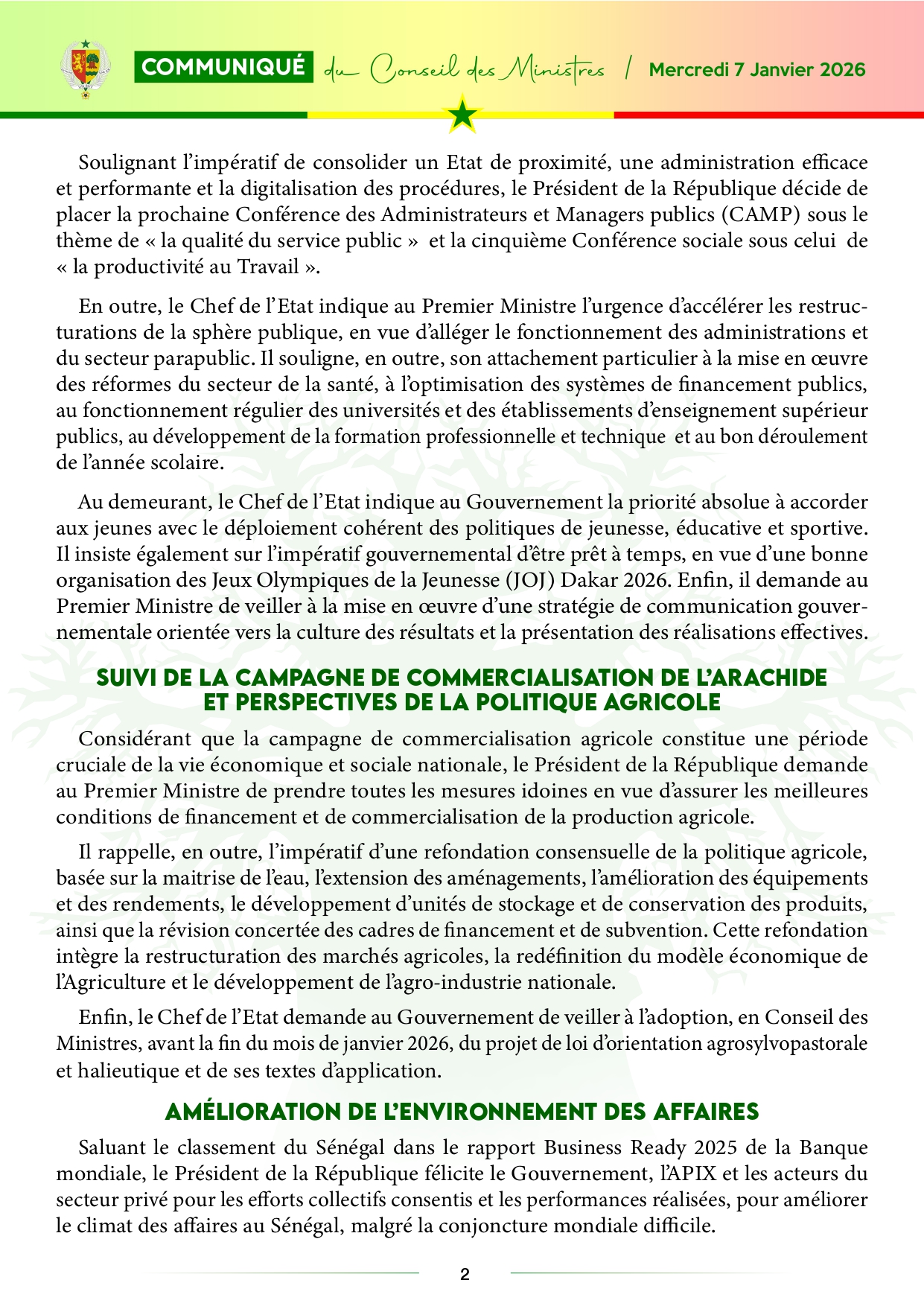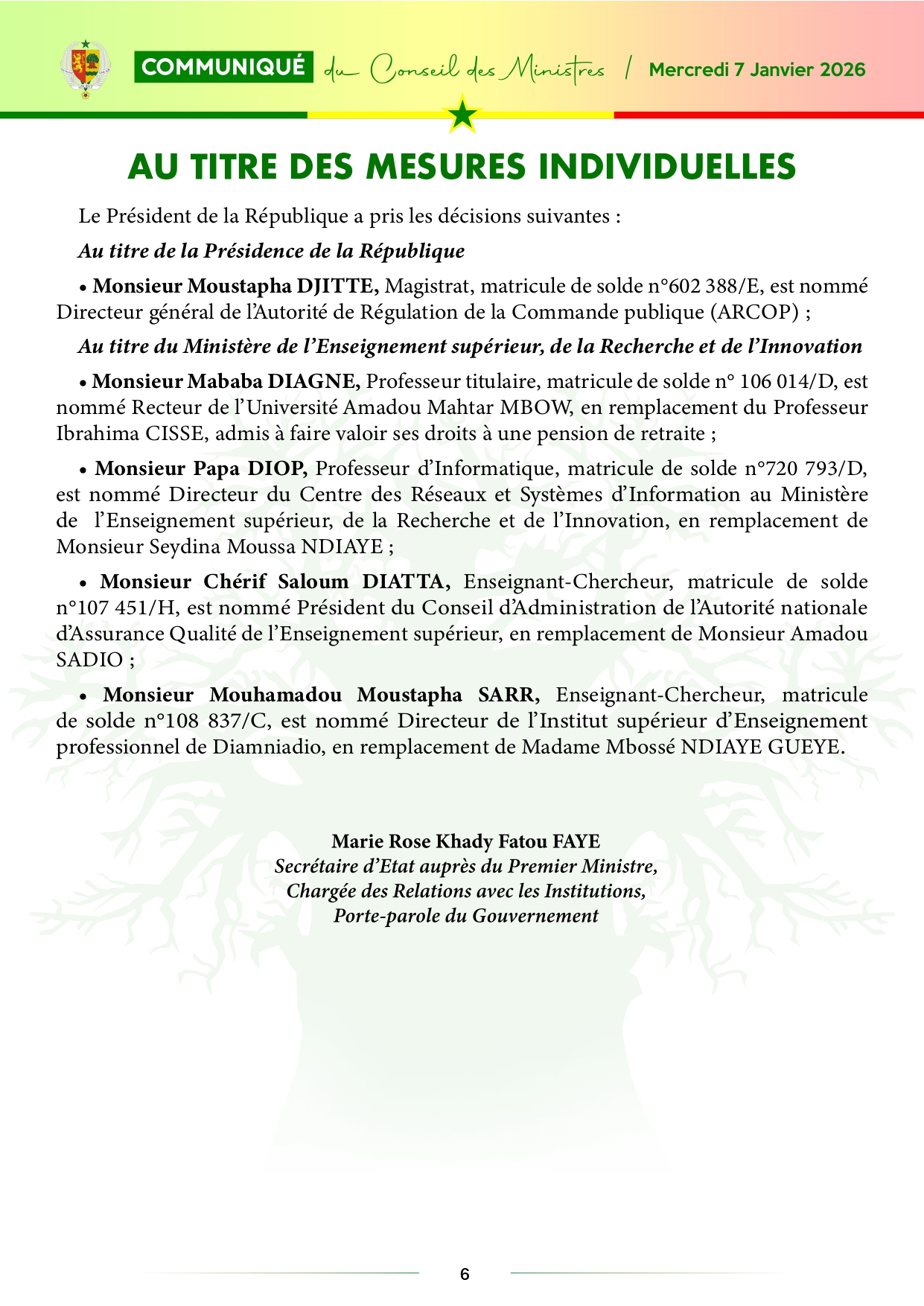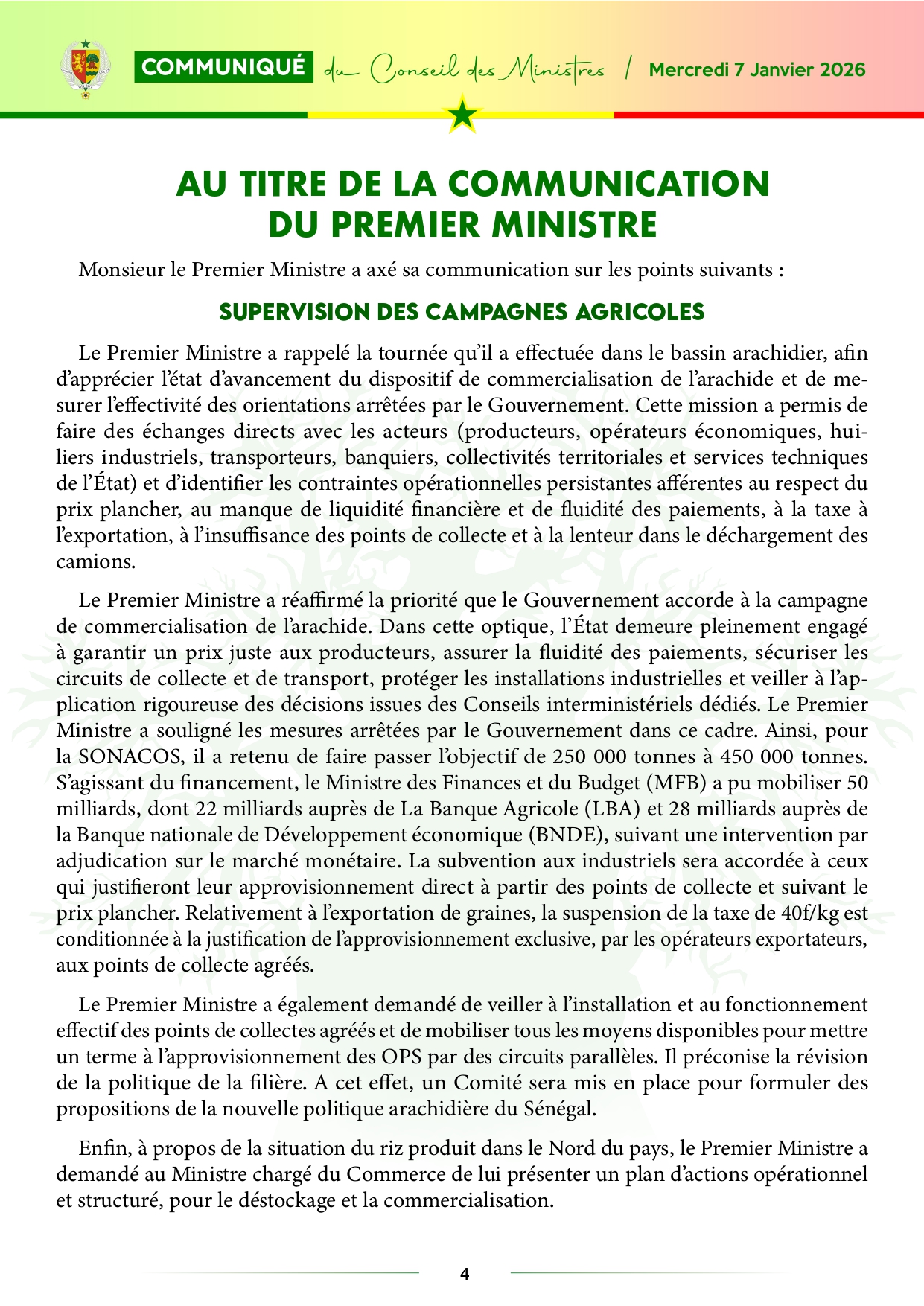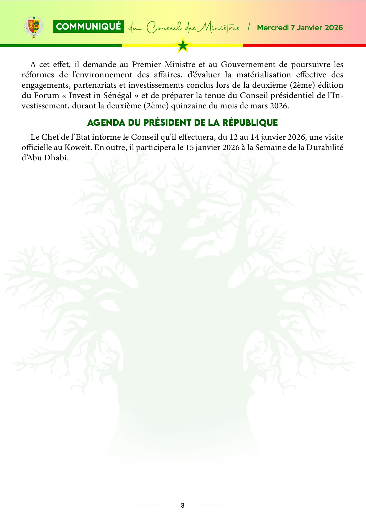 Le communiqué du Conseil des ministres, du mercredi 07 janvier 2026
