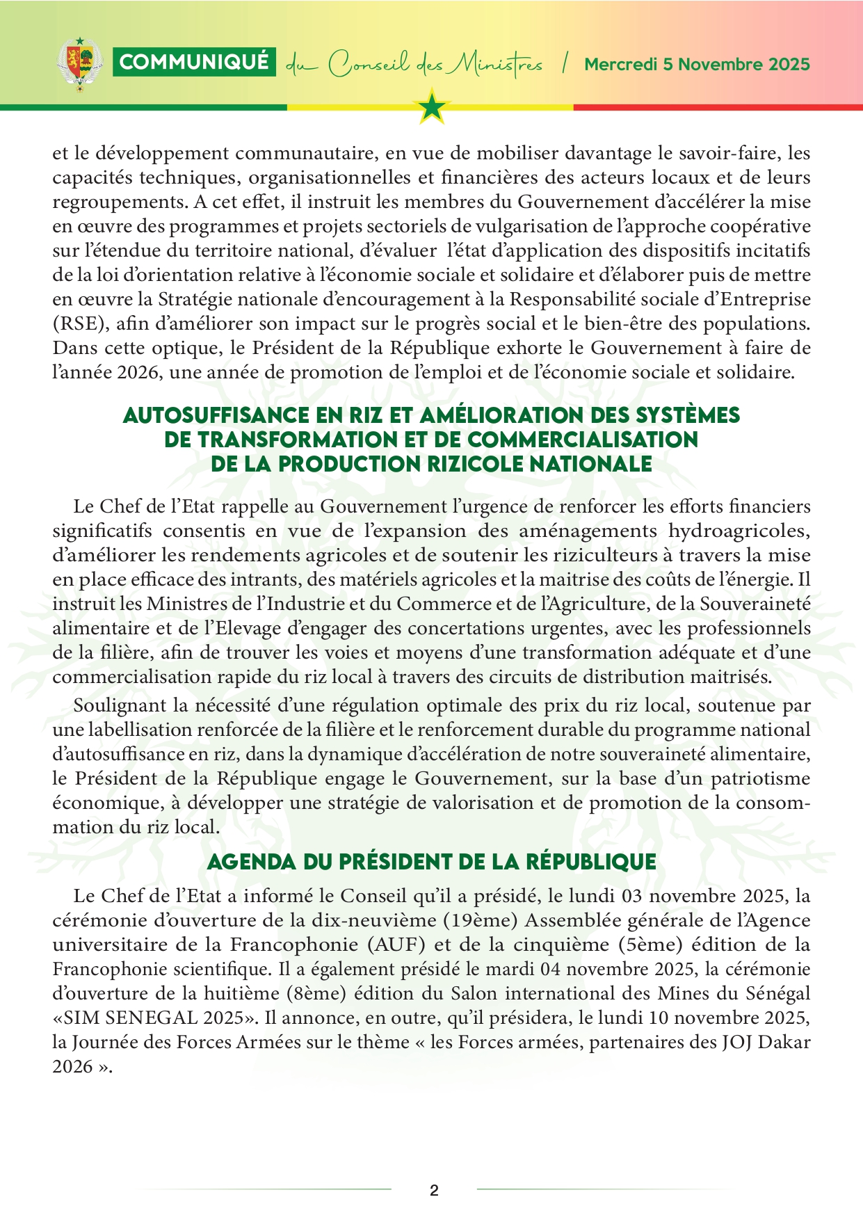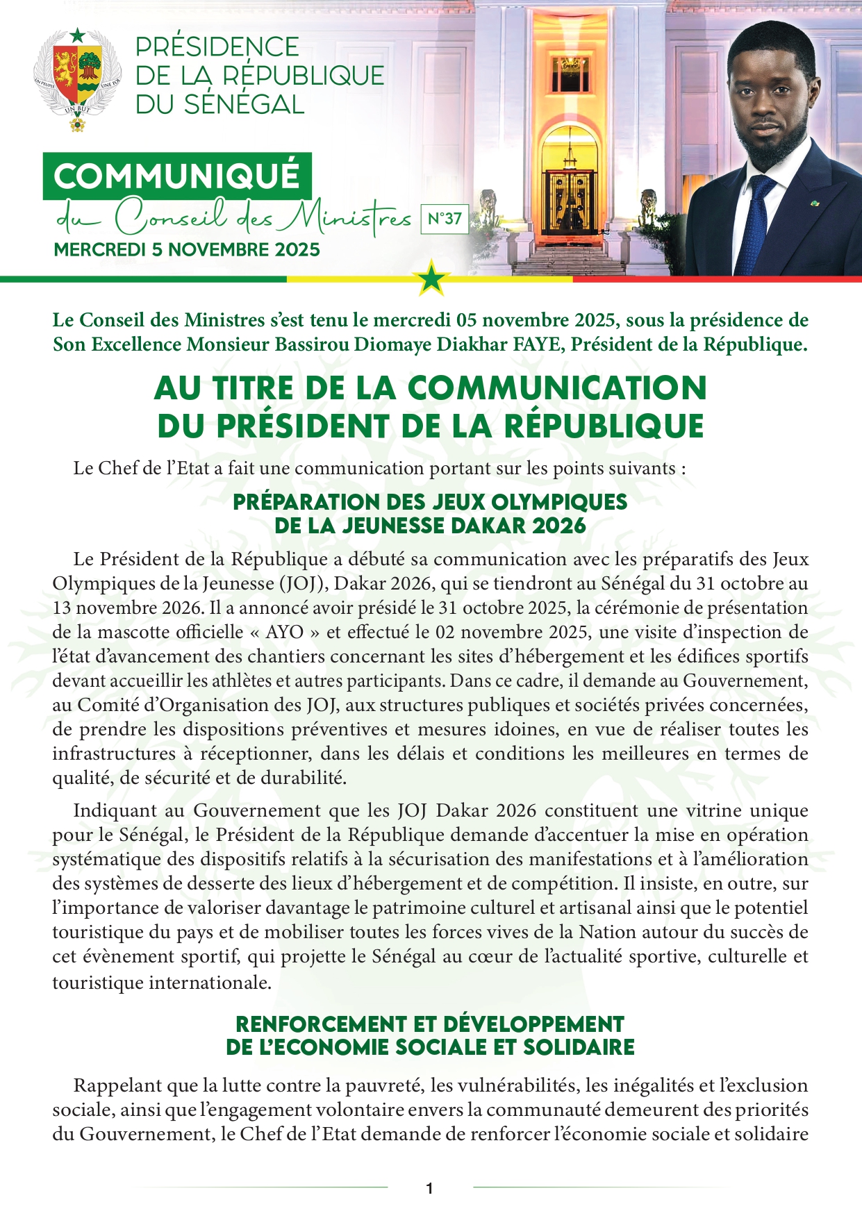 Le communiqué du Conseil des ministres, du mercredi 05 novembre
