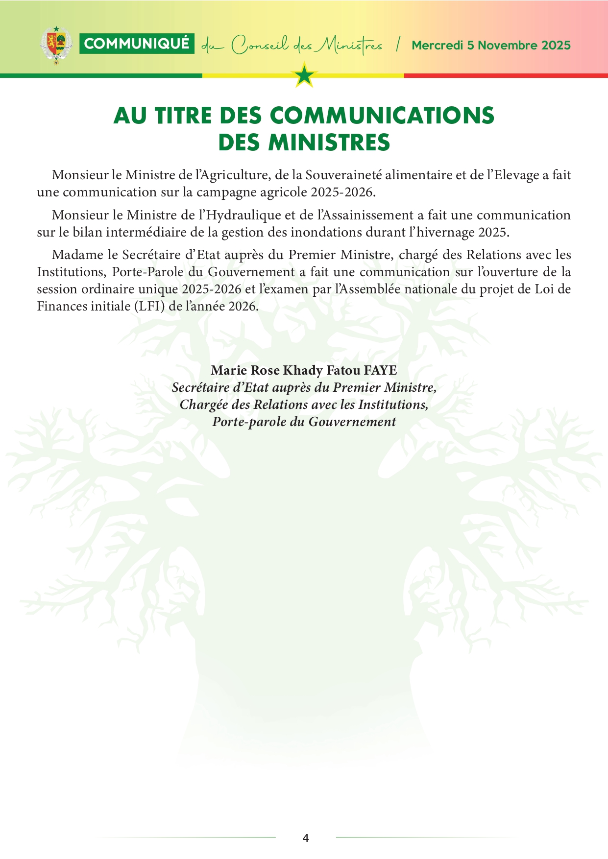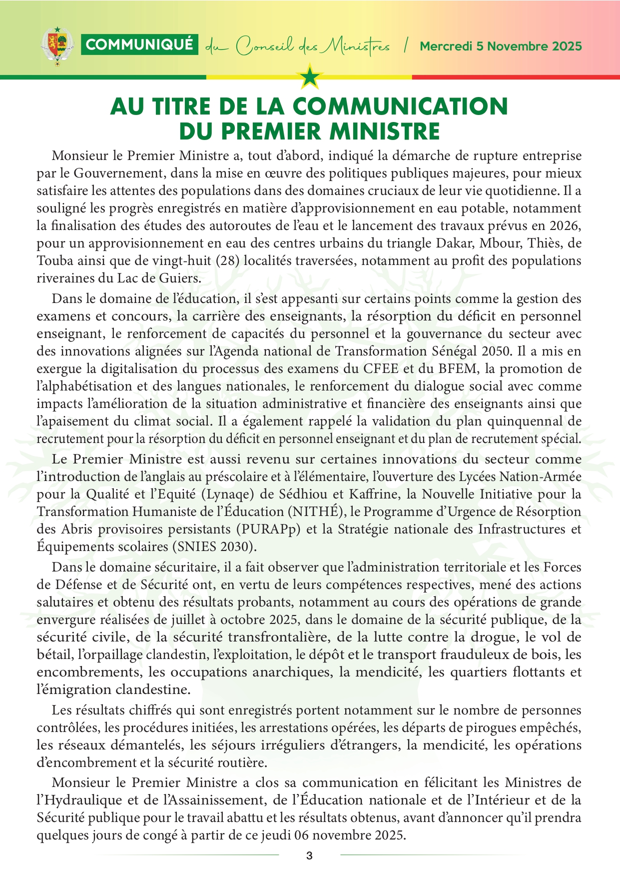 Conseil des ministres : le communiqué intégral de la réunion du mercredi 05 novembre 2025
