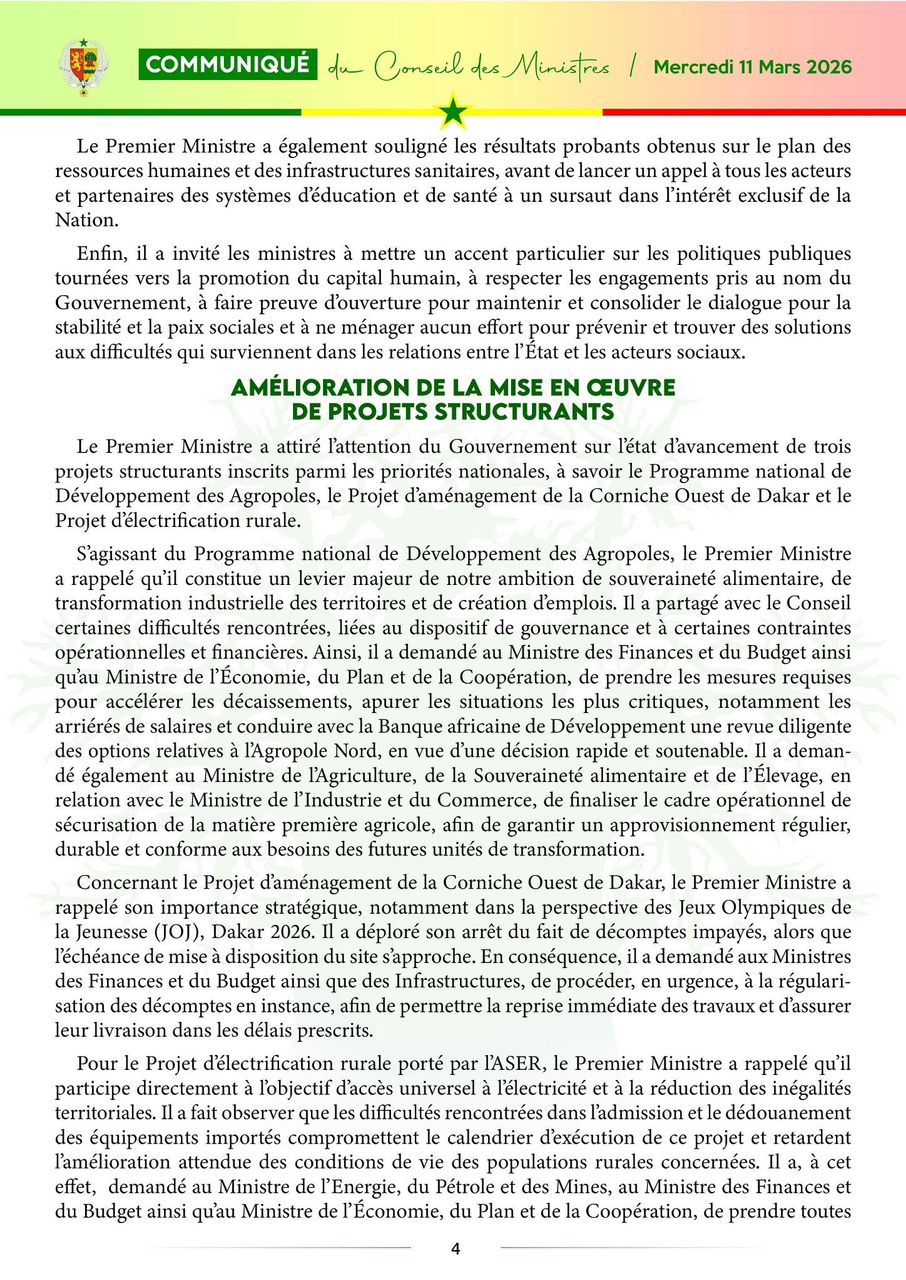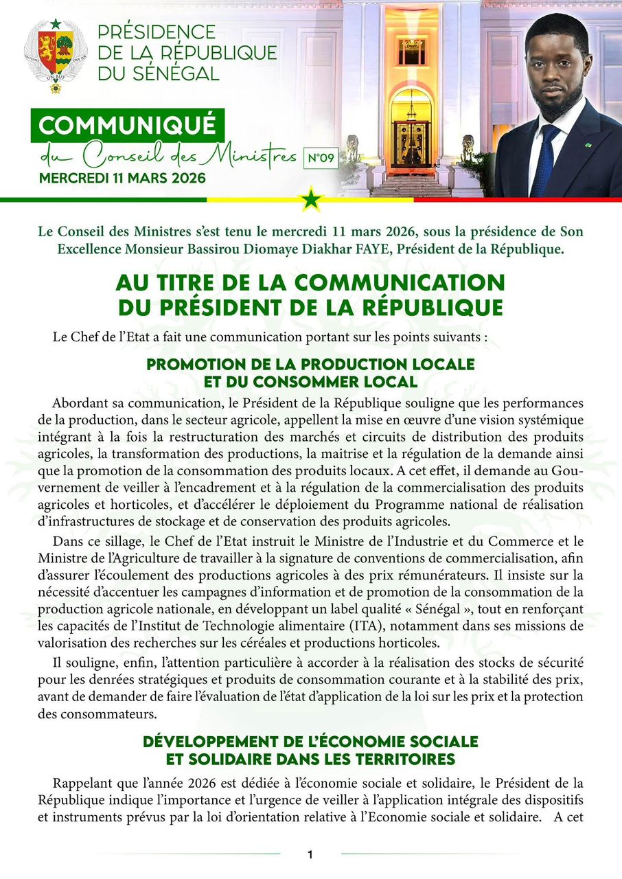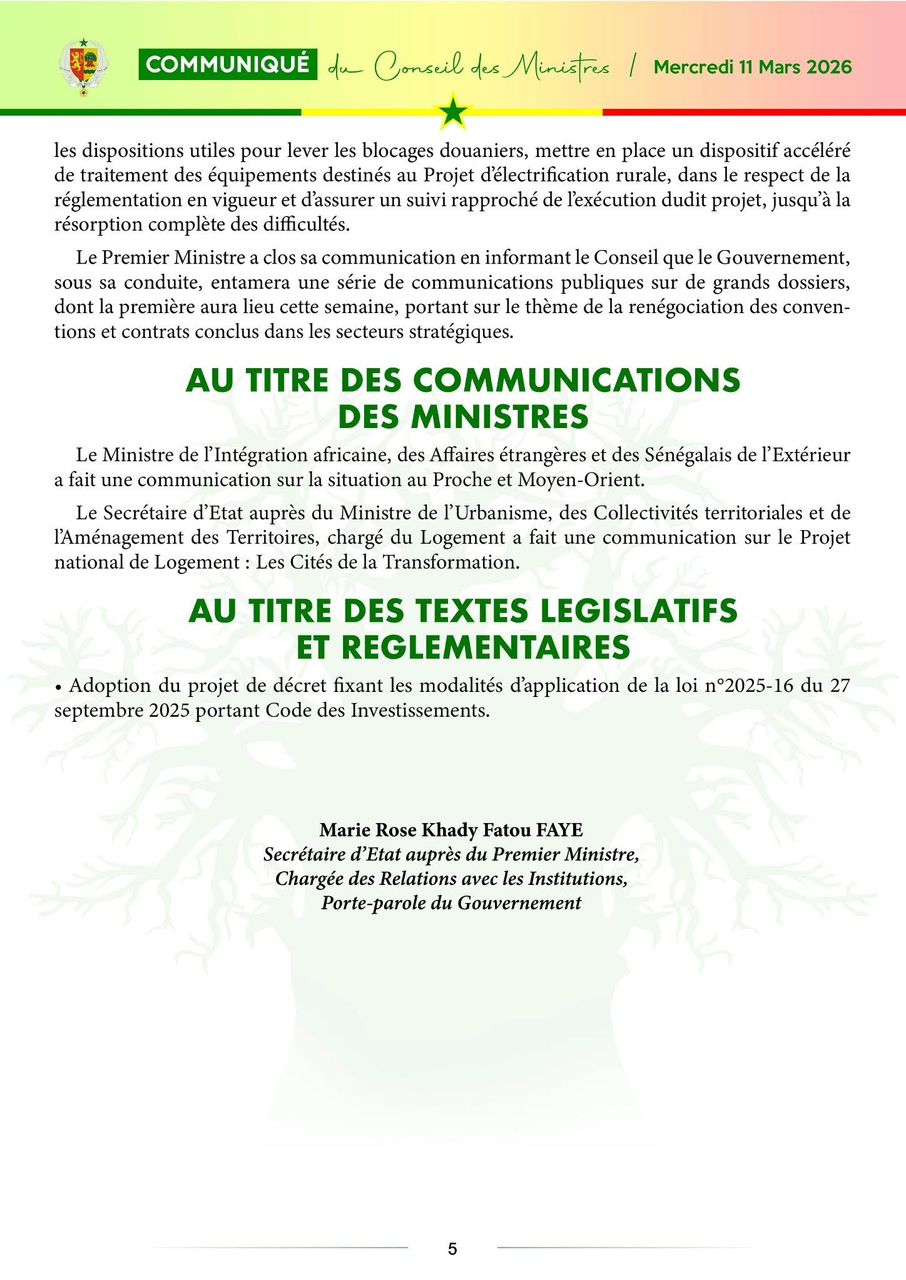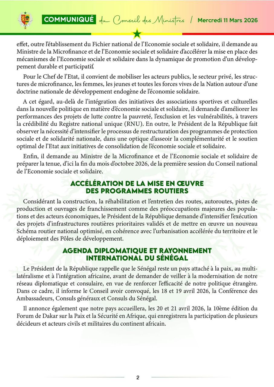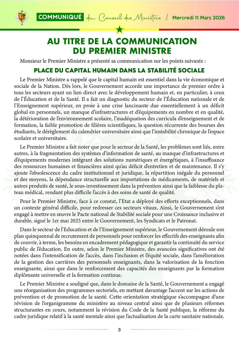 Le communiqué du Conseil des ministres, du mercredi 11 mars 2026