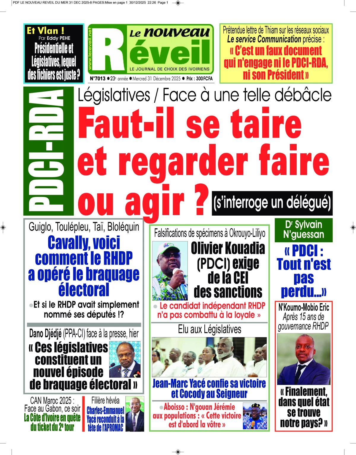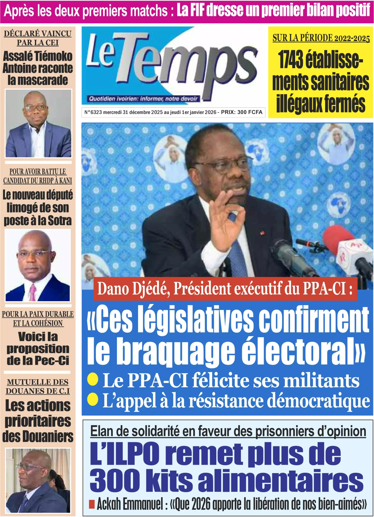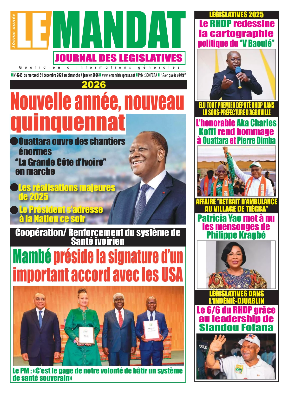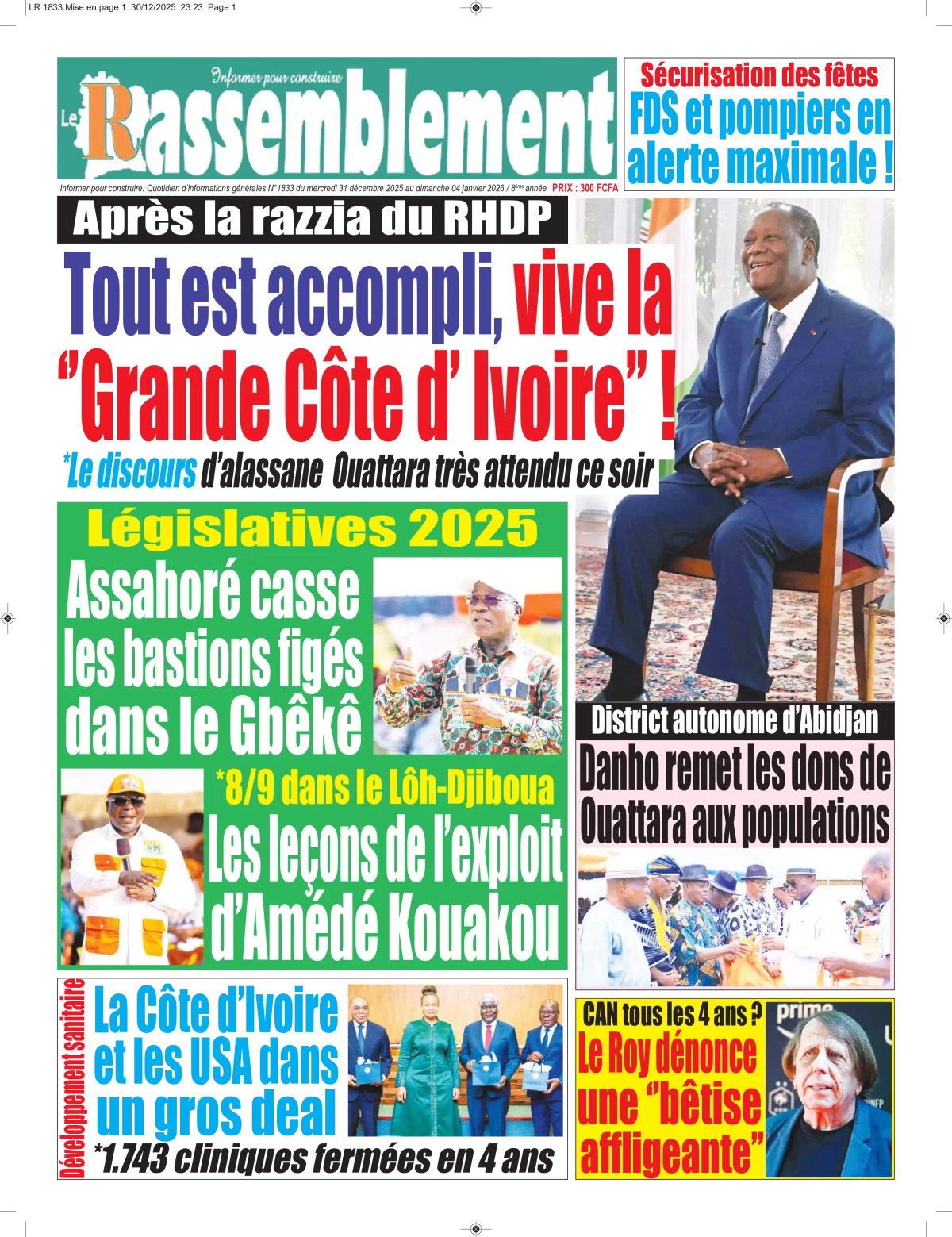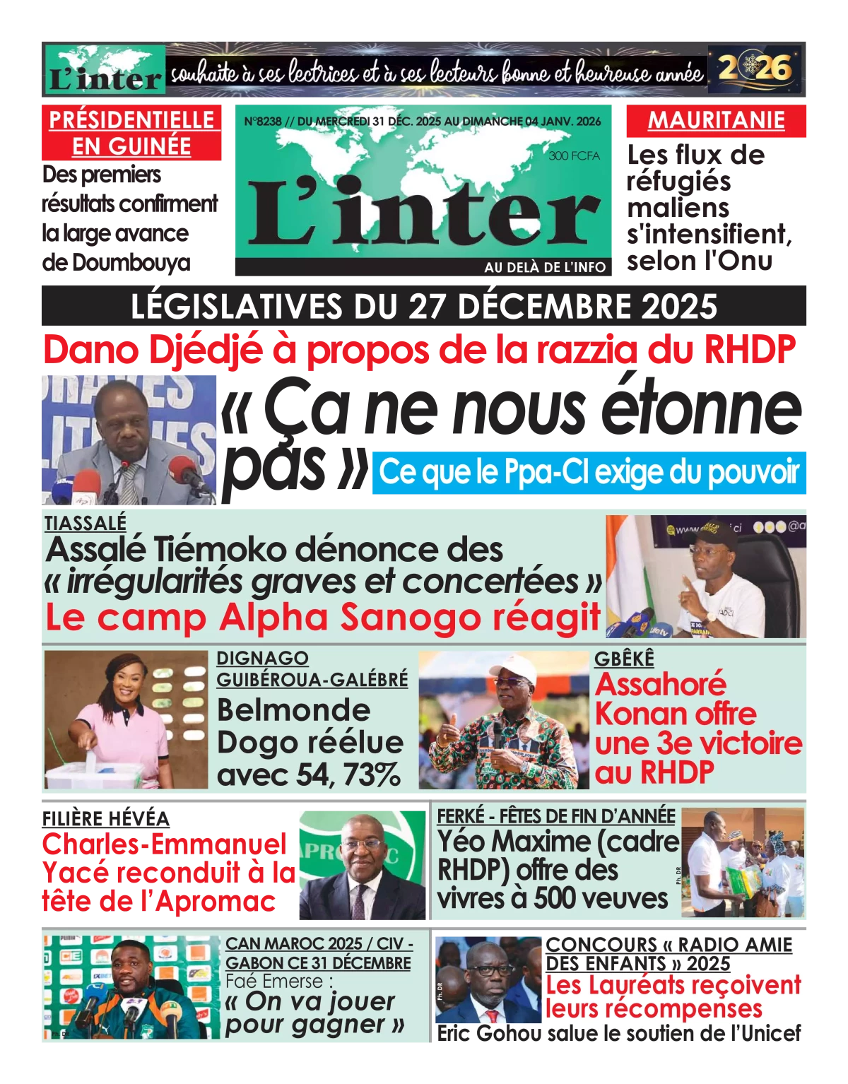Côte d’Ivoire : les journaux du mercredi 31 décembre 2025 restent dominés par les résultats des élections législatives remportées par le RHDP du Président Alassane Ouattara. Le discours de fin d’année de ce dernier est aussi l’objet de beaucoup d’intérêt.