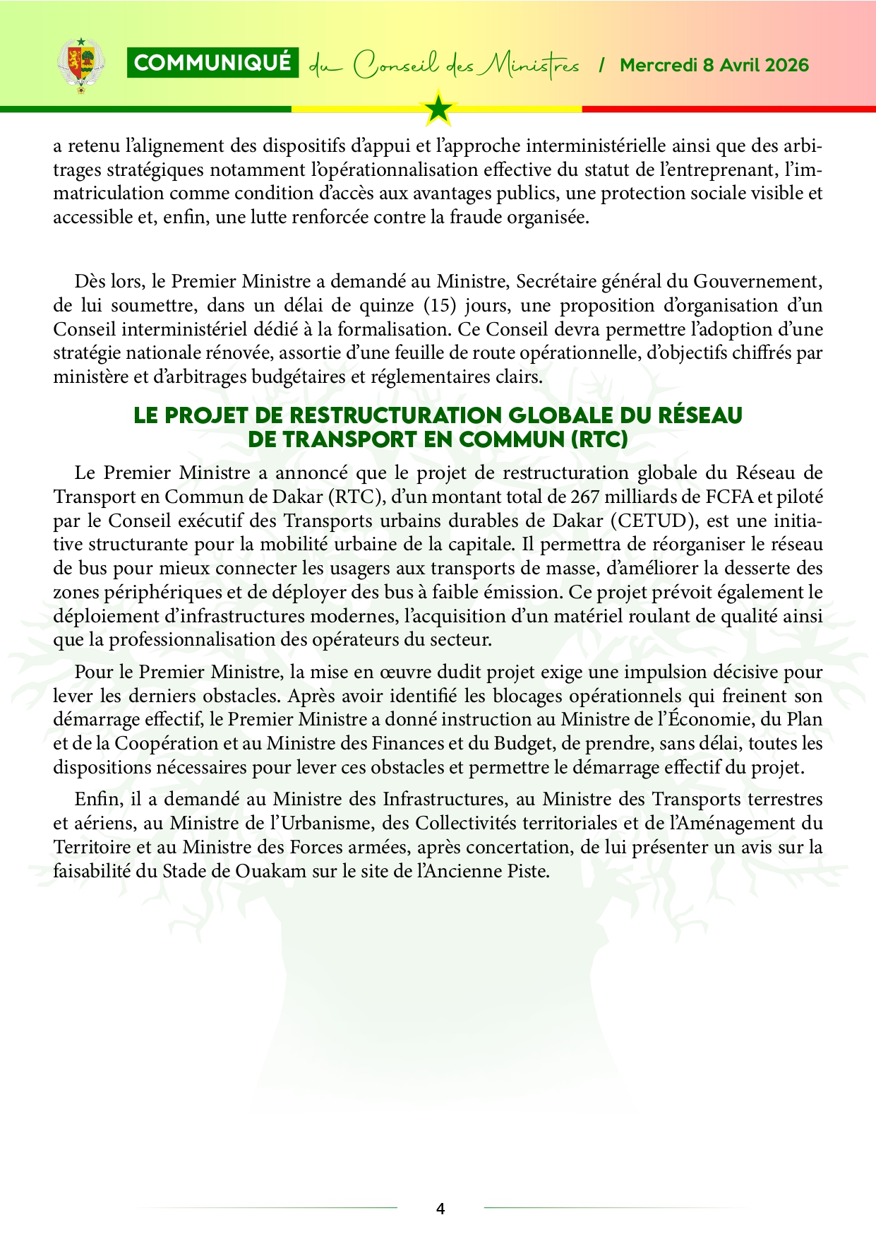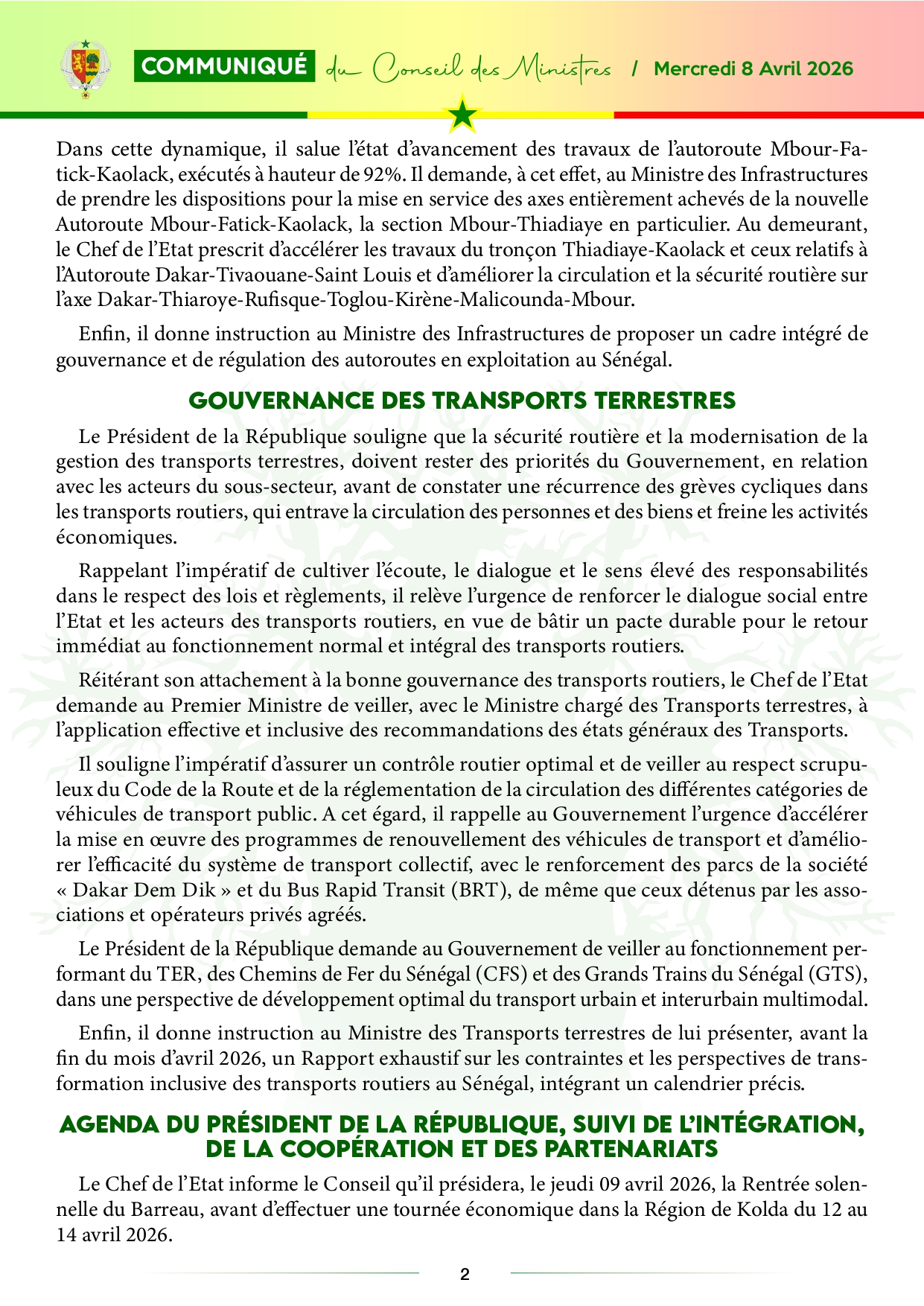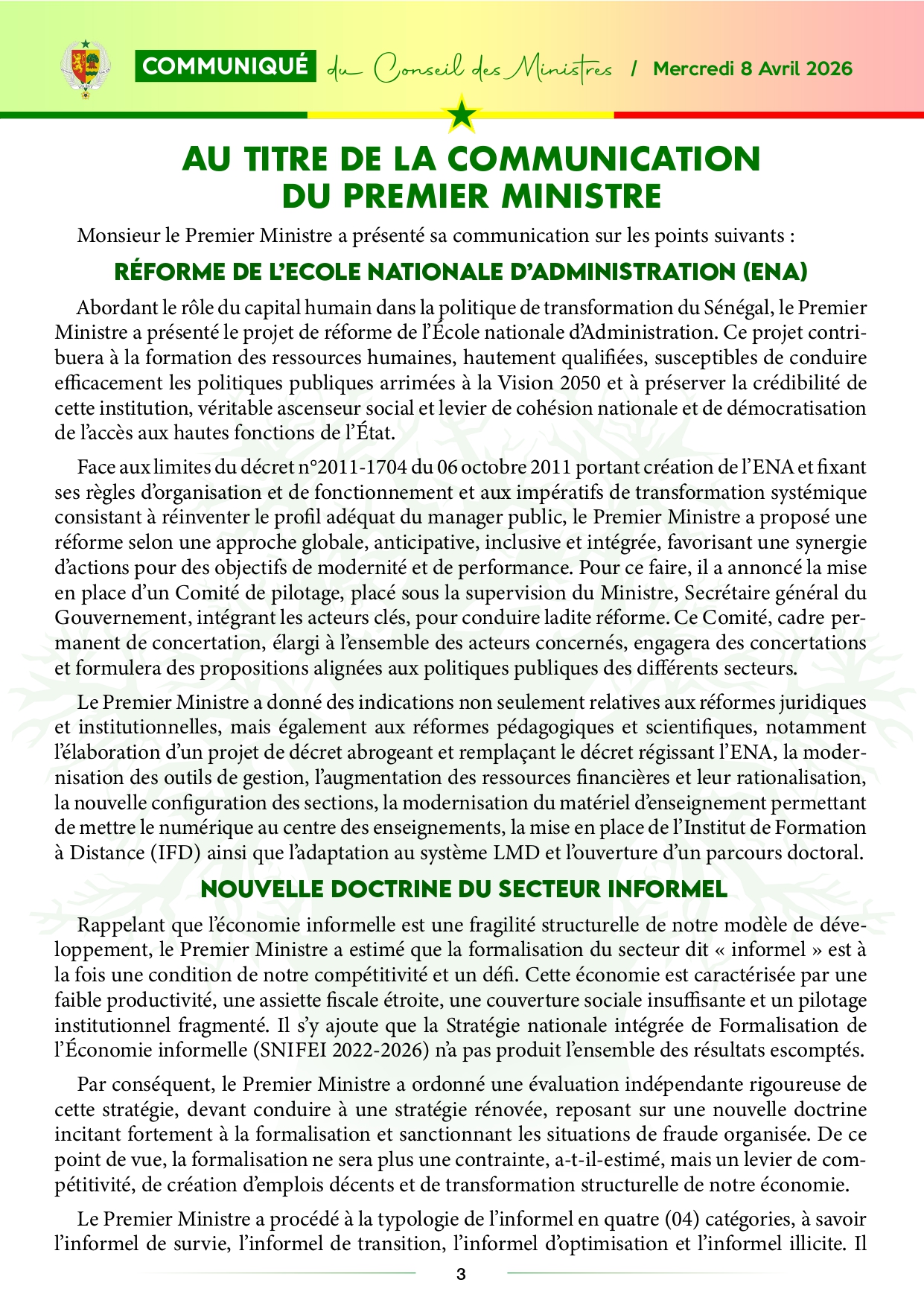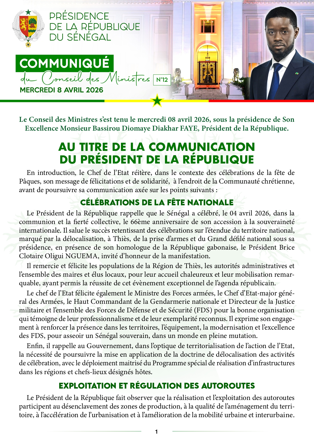 Conseil des ministres : nous vous partageons le communiqué de la réunion hebdomadaire de ce mercredi 08 avril tenue au Palais, sous la présidence de Son Excellence le Chef de l’Etat Bassirou Diomaye Faye.