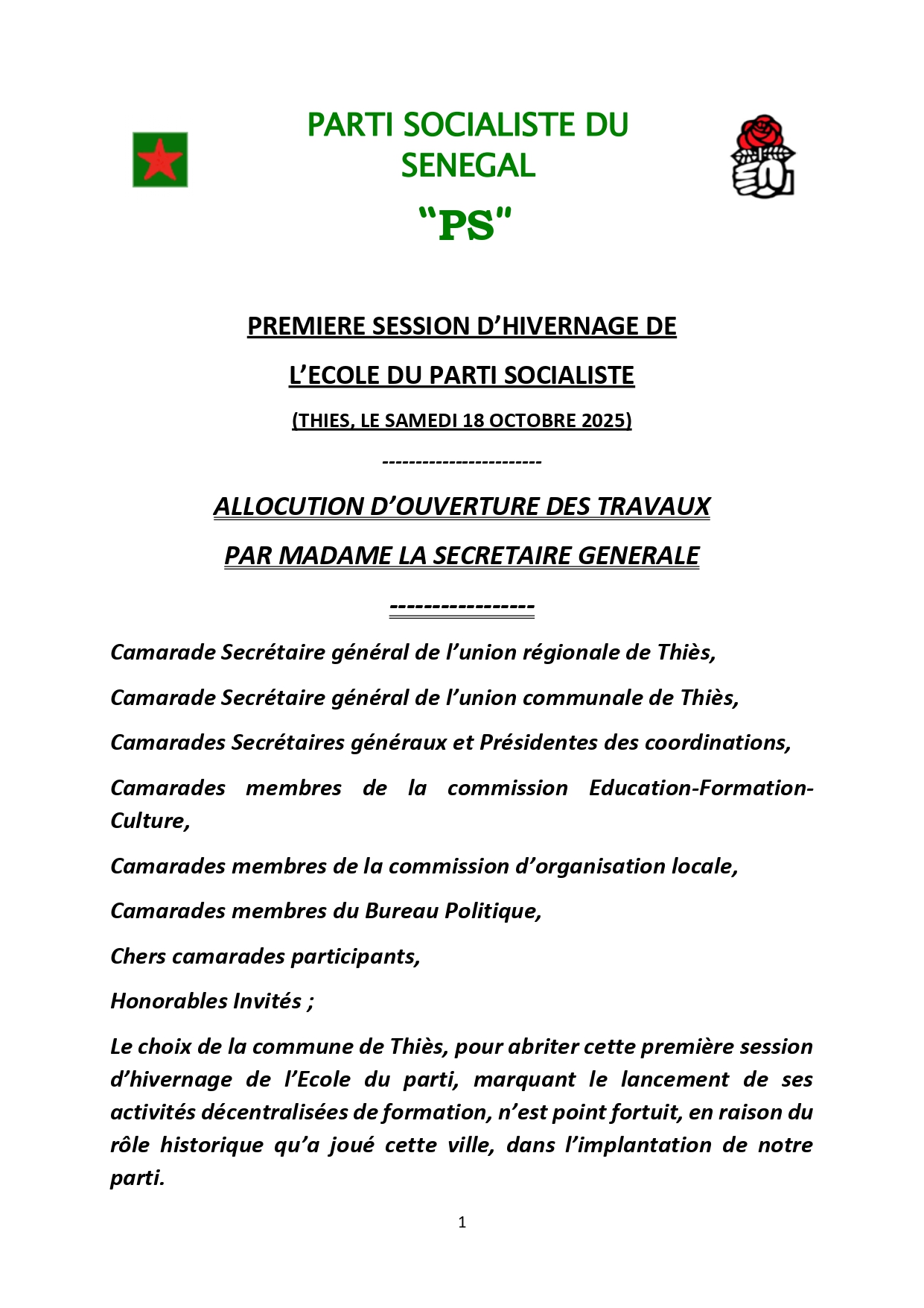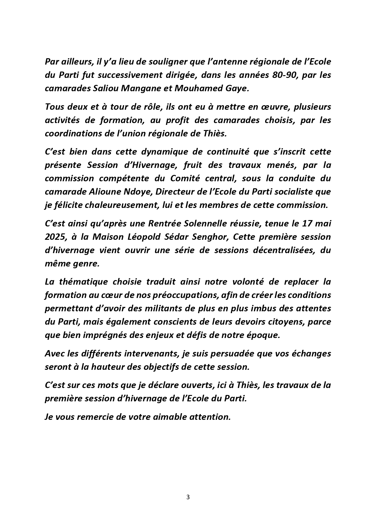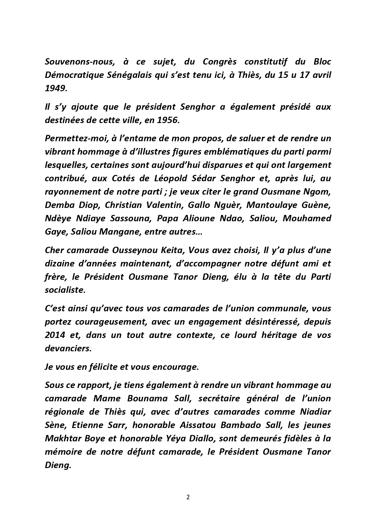 Evoquant le contexte de la rencontre de Thiès, la socialiste en chef a déclaré : « Le choix de la commune de Thiès, pour abriter cette première session d’hivernage de l’Ecole du parti, marquant le lancement de ses activités décentralisées de formation, n’est point fortuit, en raison du rôle historique qu’a joué cette ville, dans l’implantation de notre parti. Souvenons-nous, à ce sujet, du Congrès constitutif du Bloc Démocratique Sénégalais qui s’est tenu ici, à Thiès, du 15 u 17 avril 1949. Il s’y ajoute que le président Senghor a également présidé aux destinées de cette ville, en 1956″.