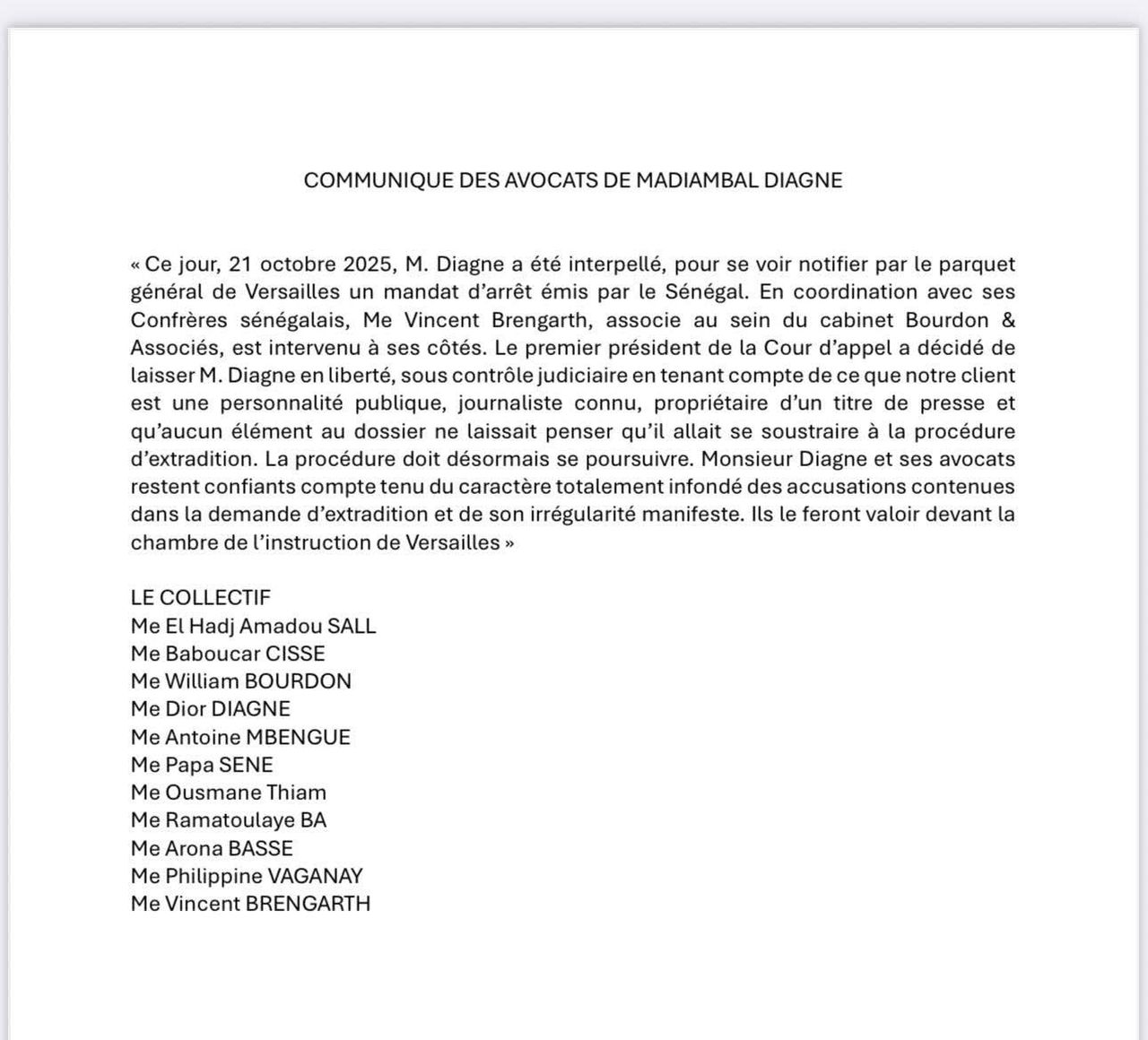 Dans un communiqué rendu public, les avocats de Madiambal Diagne, en coordination avec leurs confrères sénégalais, ont annoncé l’interpellation de leur client. Maitre Vincent Brengarth, associé au sein du cabinet Bourdon & Associés, est intervenu à ses côtés.