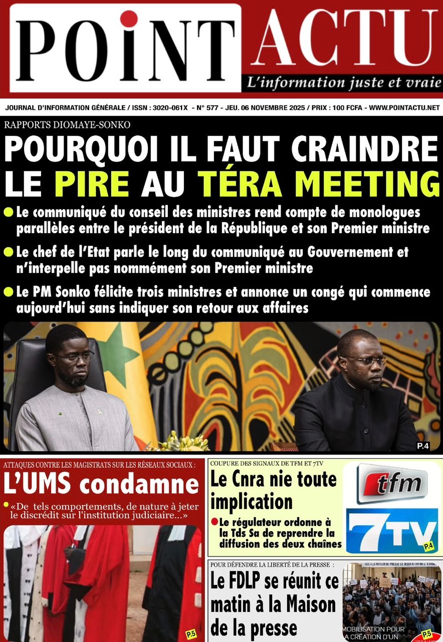 Jeudi 06 novembre 2025 : la revue de presse sénégalaise a comme sujets principaux les directives du Président Bassirou Diomaye Faye lors du dernier Conseil des ministres et les congés annoncés du Premier ministre Ousmane Sonko.