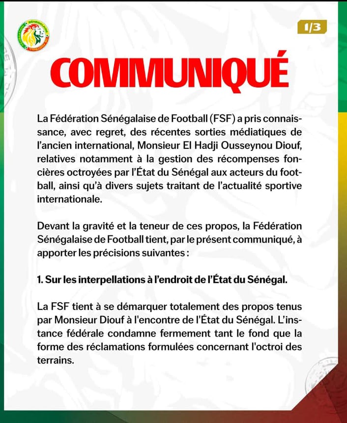 La Fédération sénégalaise de football a réagi, via un communiqué à lire ci-dessous, pour se démarquer de Dioufy, aujourd’hui pourtant proche de l’équipe nationale de football.