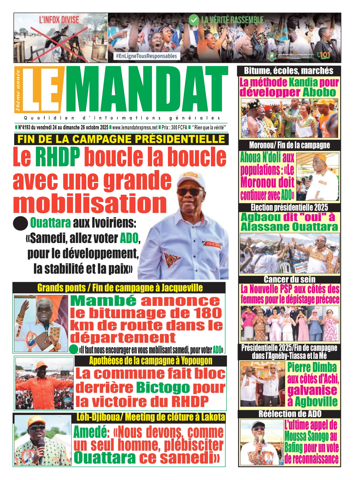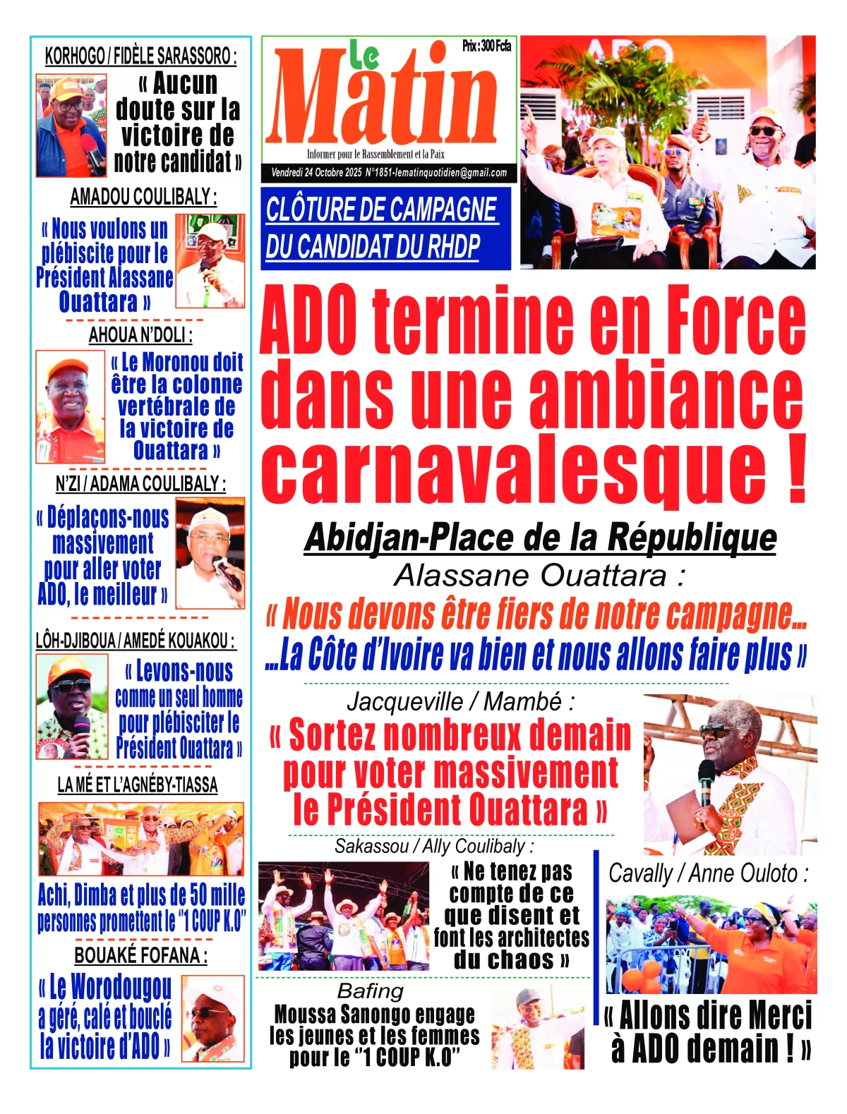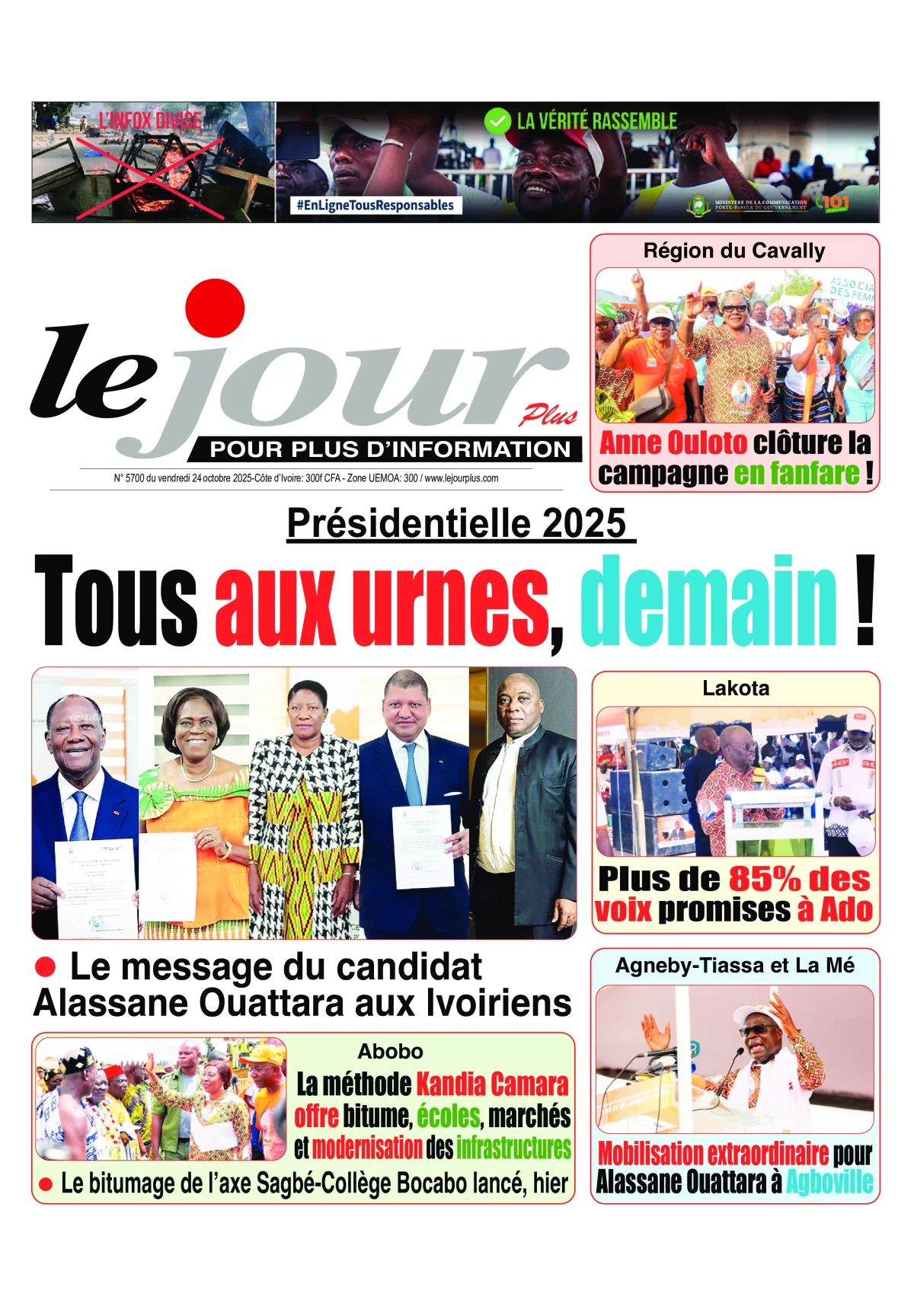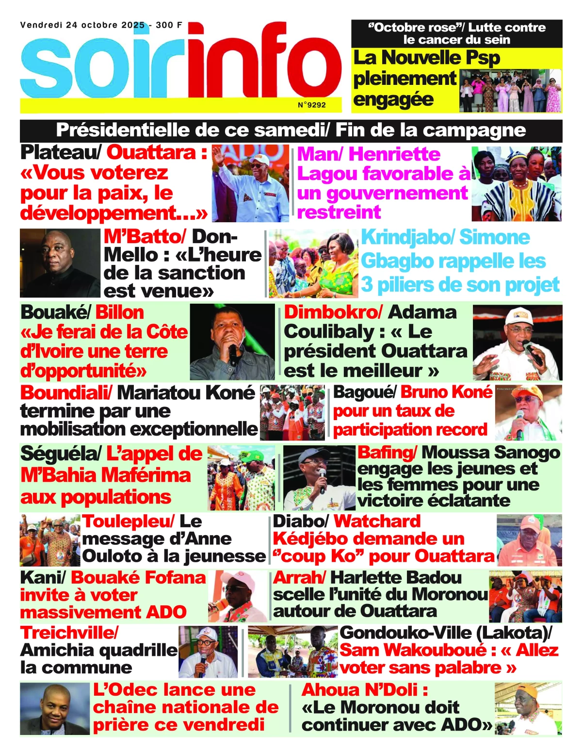 Côte d’Ivoire : la revue de presse du vendredi 24 octobre 2025 met l’accent sur la fin de la campagne électorale et la présidentielle ivoirienne prévue demain, samedi 25 octobre, avec 5 candidats dont le Chef de l’Etat sortant Alassane Dramane Ouattara.