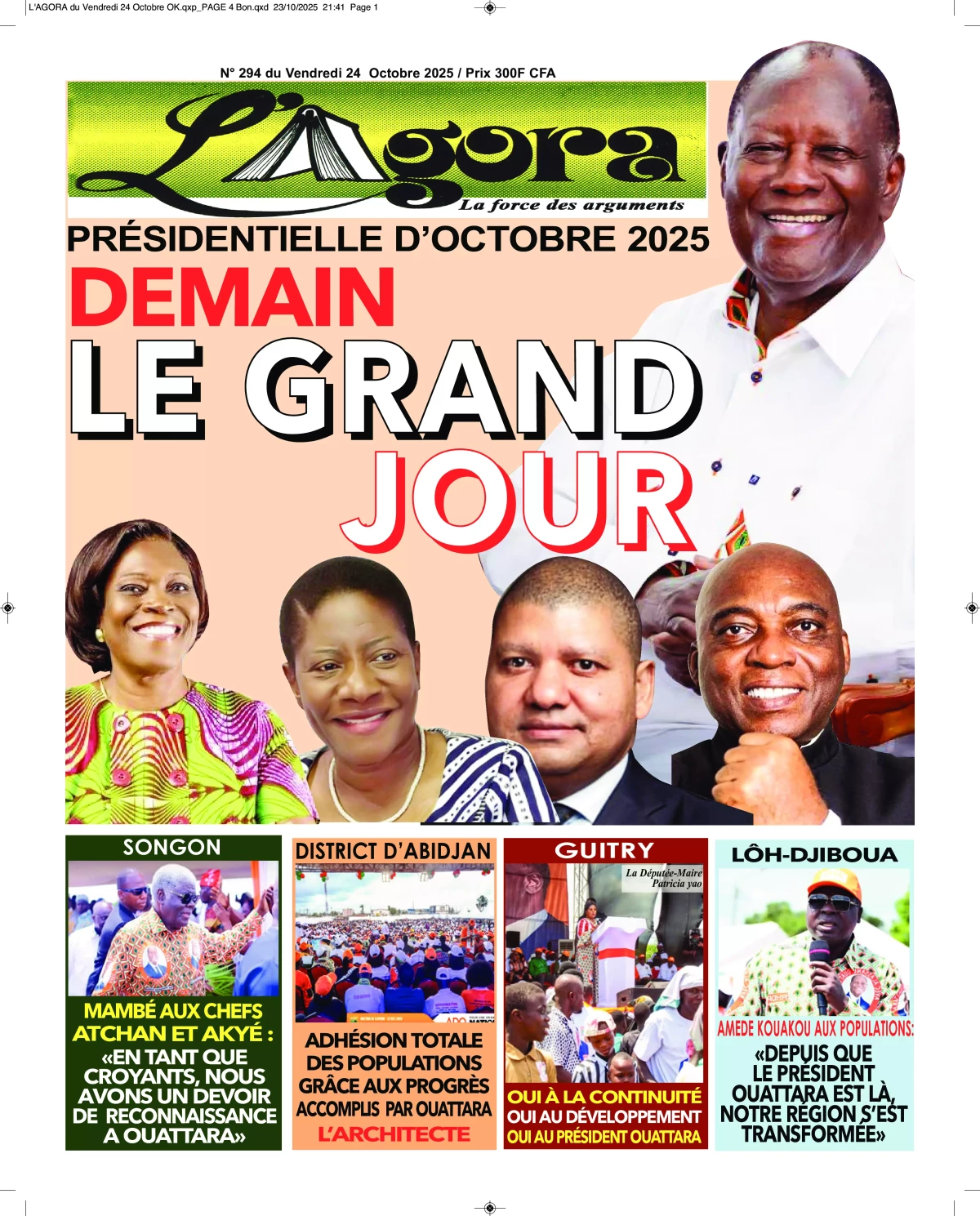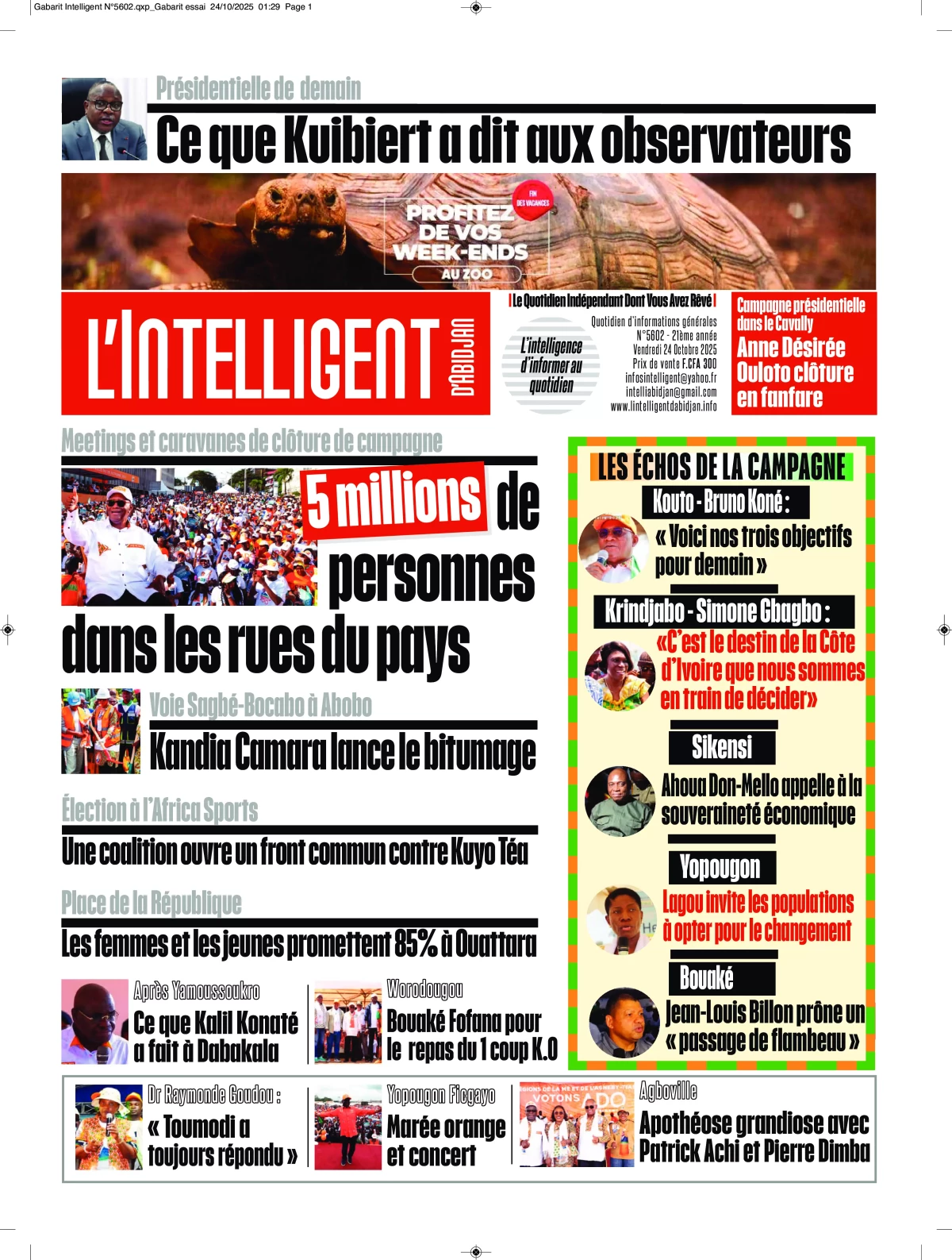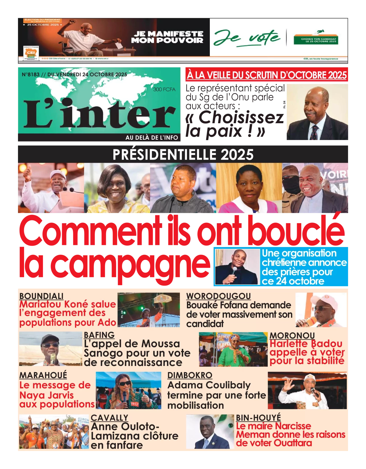 Côte d’Ivoire : la revue de presse du vendredi 24 octobre 2025 met l’accent sur la fin de la campagne électorale et la présidentielle ivoirienne prévue demain, samedi 25 octobre, avec 5 candidats dont le Chef de l’Etat sortant Alassane Dramane Ouattara.