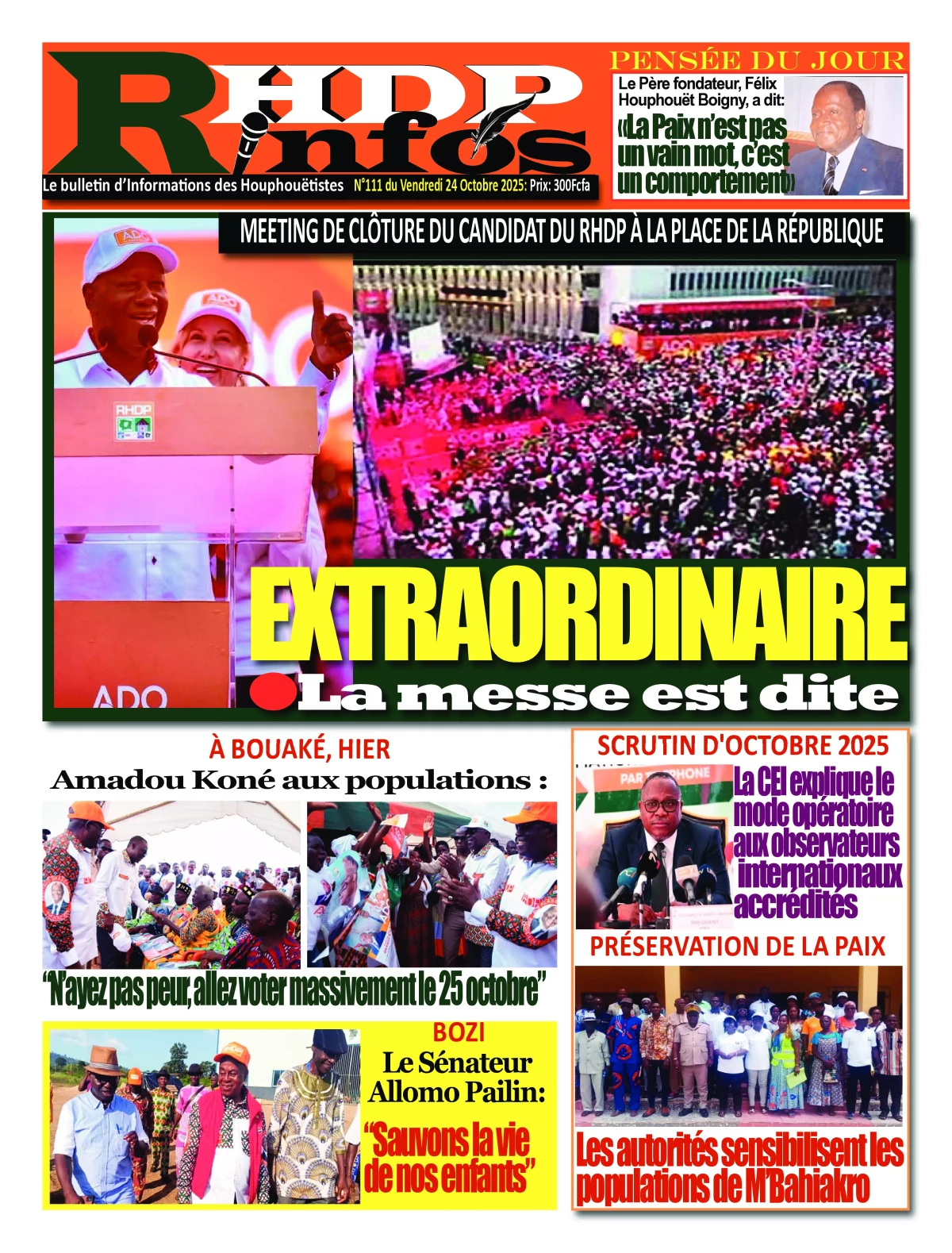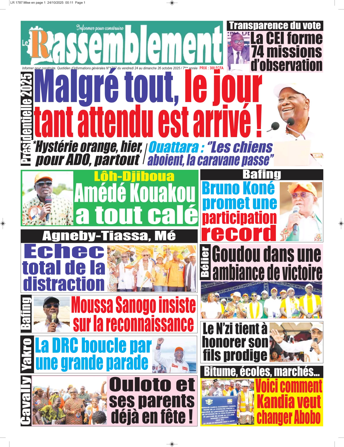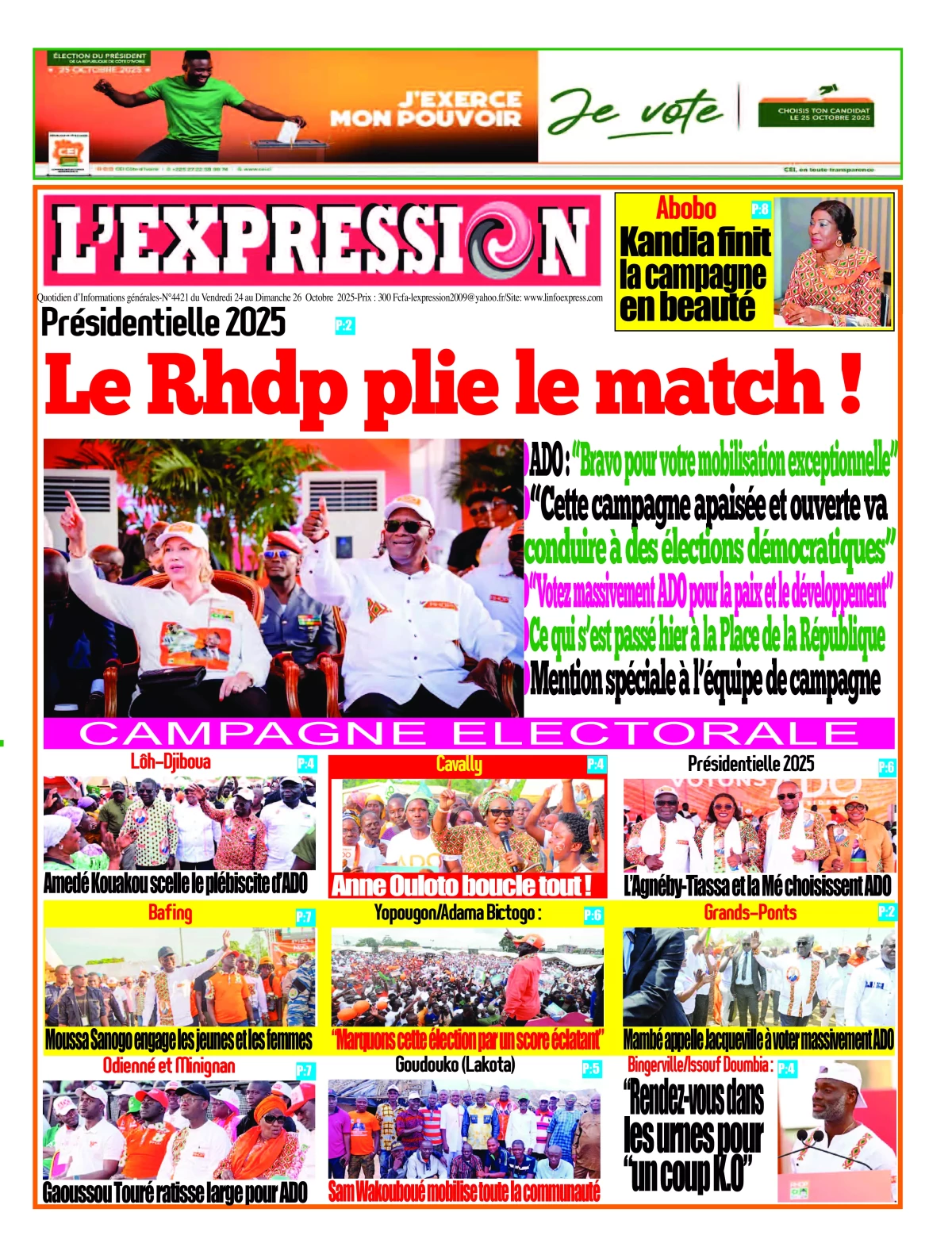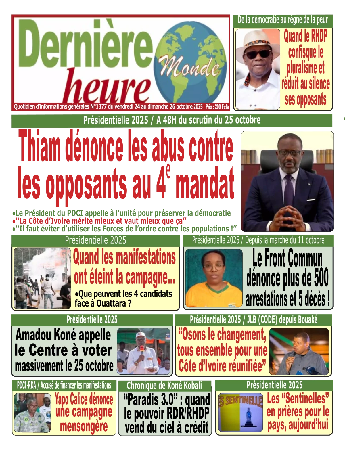 Côte d’Ivoire : la revue de presse du vendredi 24 octobre 2025 met l’accent sur la fin de la campagne électorale et la présidentielle ivoirienne prévue demain, samedi 25 octobre, avec 5 candidats dont le Chef de l’Etat sortant Alassane Dramane Ouattara.