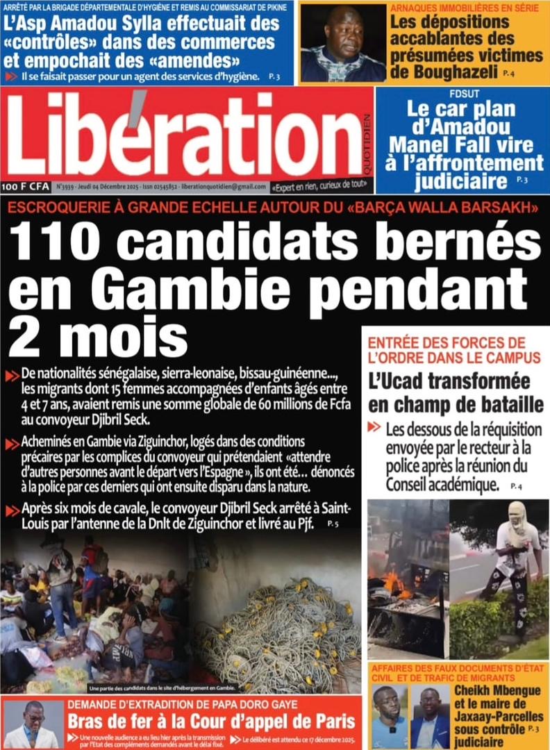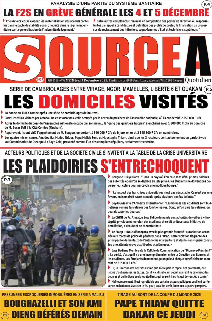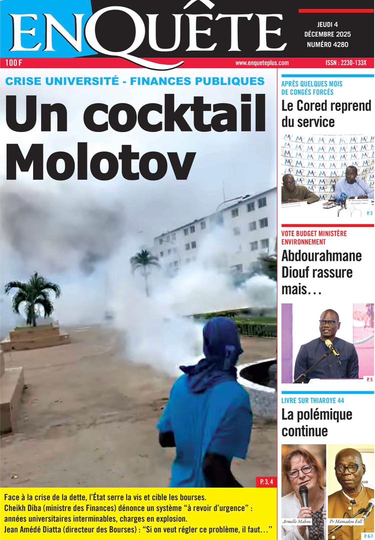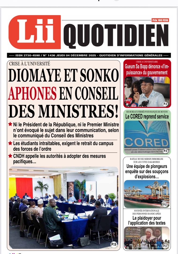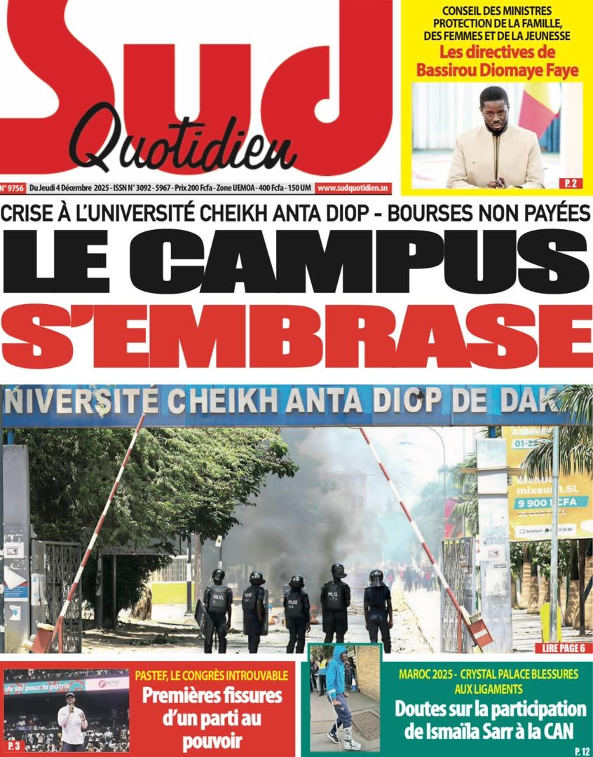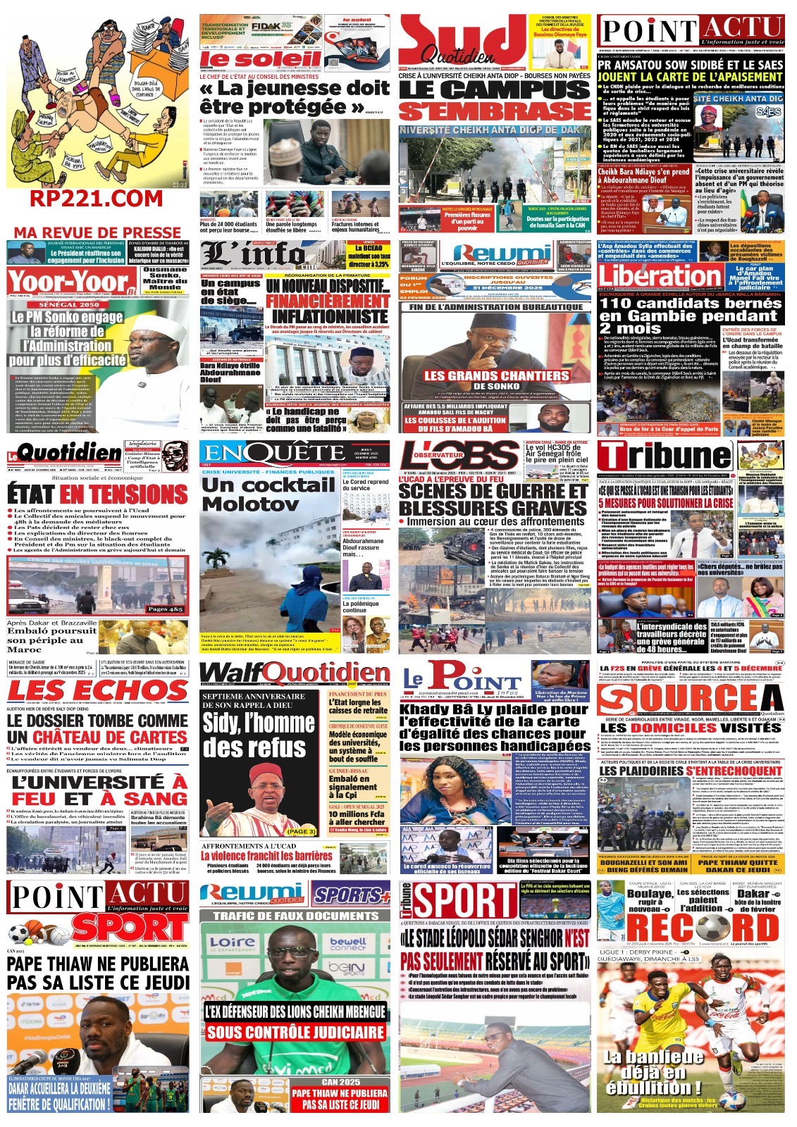 La revue de presse sénégalaise du jeudi 04 décembre 2025 a comme sujet principal la situation tendue à l’université de Dakar, marquée par des affrontements entre étudiants et forces de sécurité.
