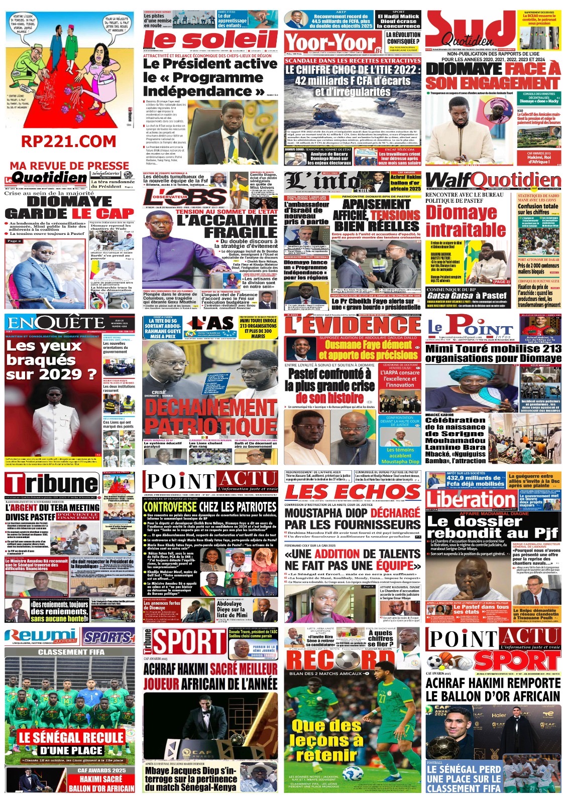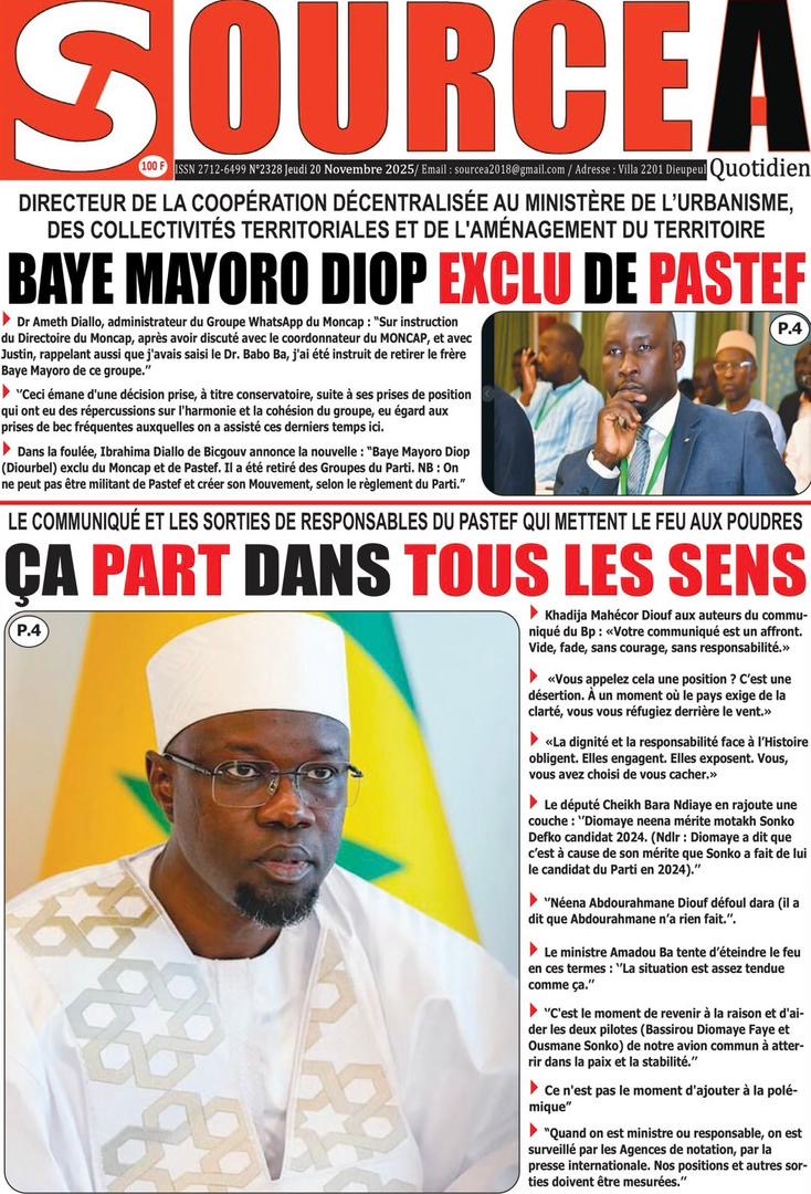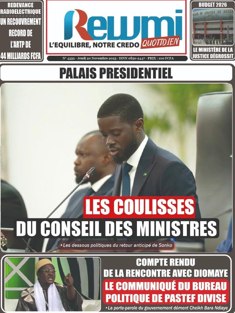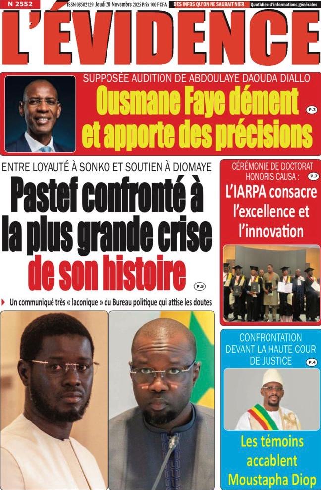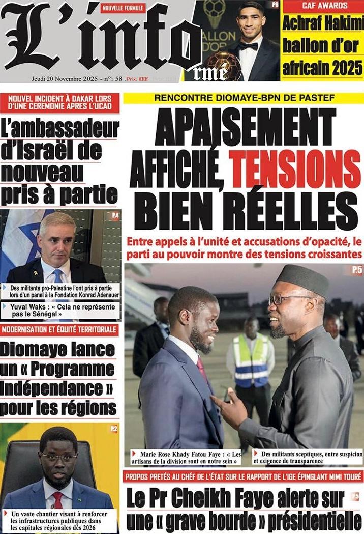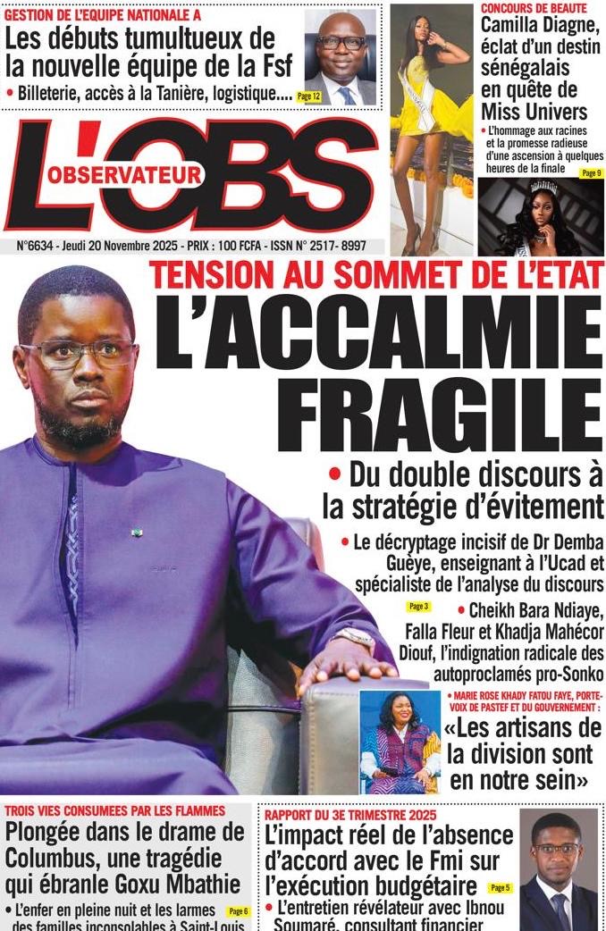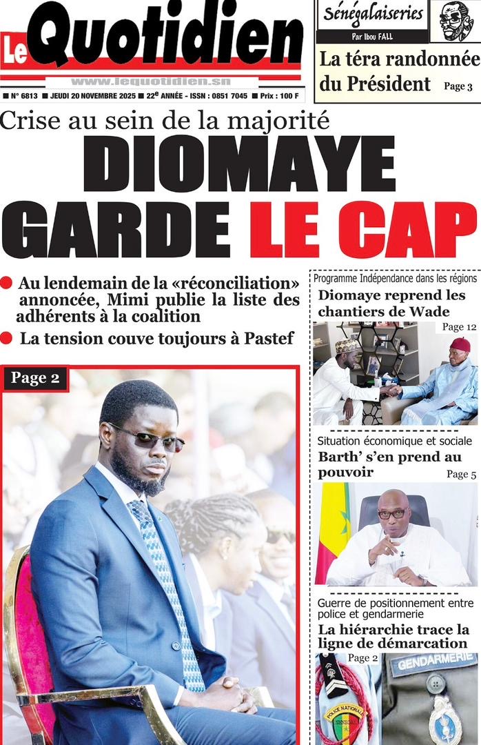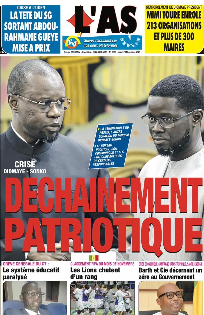 La revue de presse sénégalaise du jeudi 20 novembre 2025 reste dominée par le débat politique au sujet des relations entre le Président de la République et son Premier ministre, sur fond de rivalités Coalition Diomaye Président vs Pastef les Patriotes.