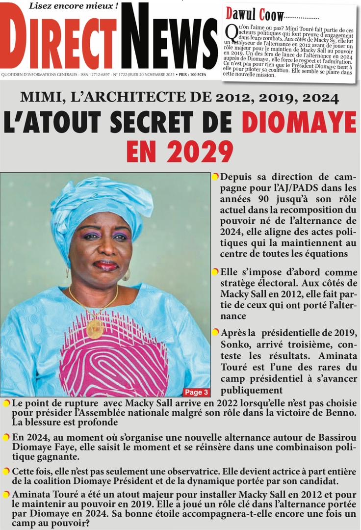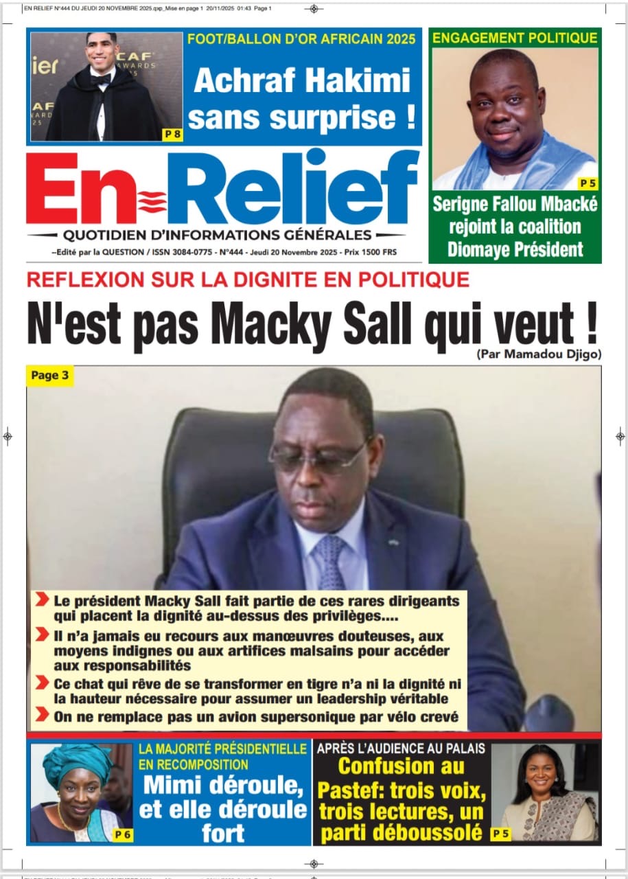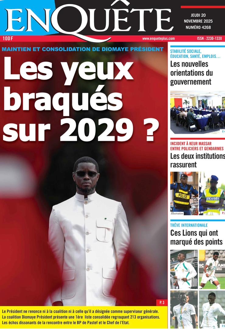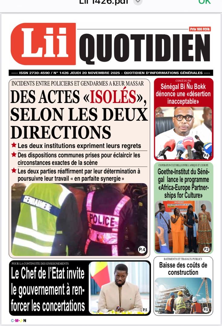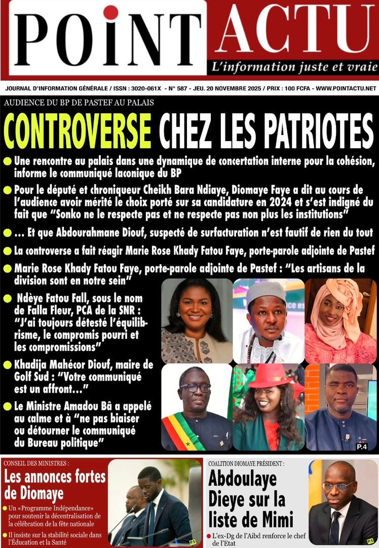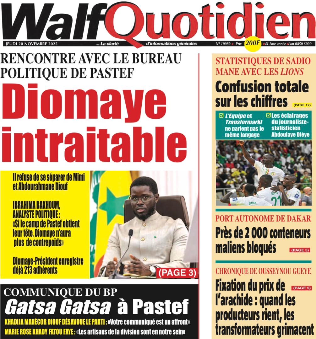 La revue de presse sénégalaise du jeudi 20 novembre 2025 reste dominée par le débat politique au sujet des relations entre le Président de la République et son Premier ministre, sur fond de rivalités Coalition Diomaye Président vs Pastef les Patriotes.