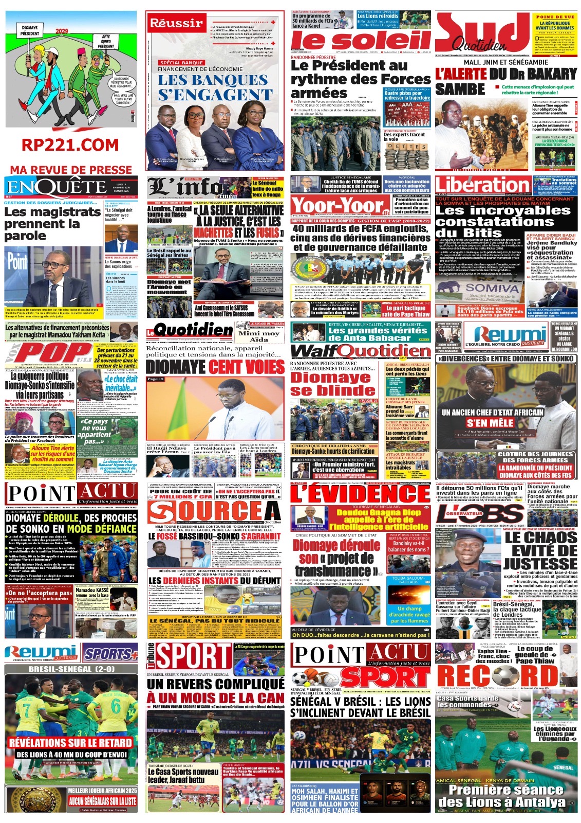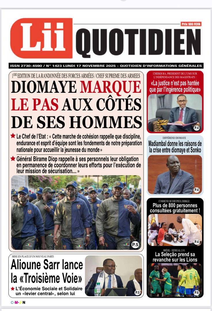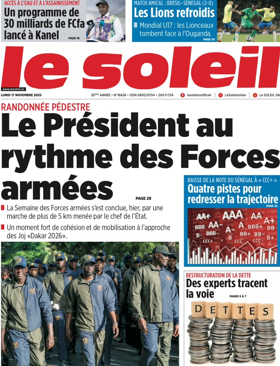 La revue de presse sénégalaise du lundi 17 novembre 2025 met en exergue la participation du Président Bassirou Diomaye Faye à la clôture de la semaine des Forces armées, la sortie du président de l’UMS et la défaite des Lions contre le Brésil en match amical.
