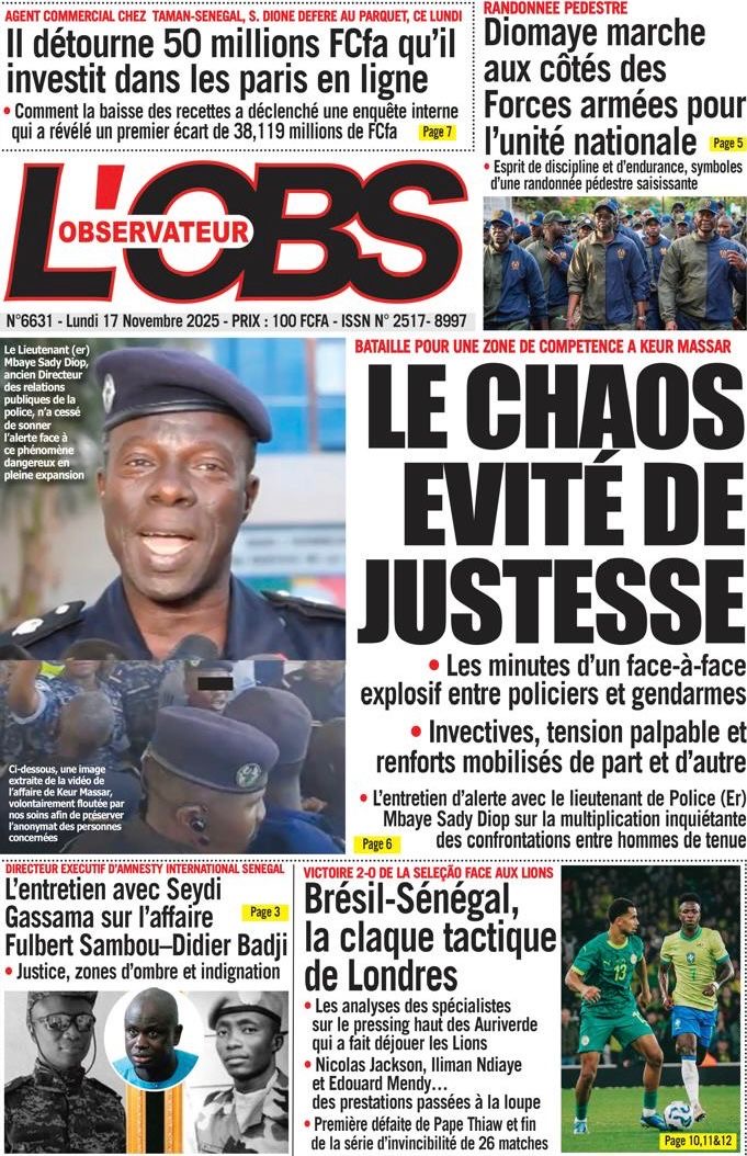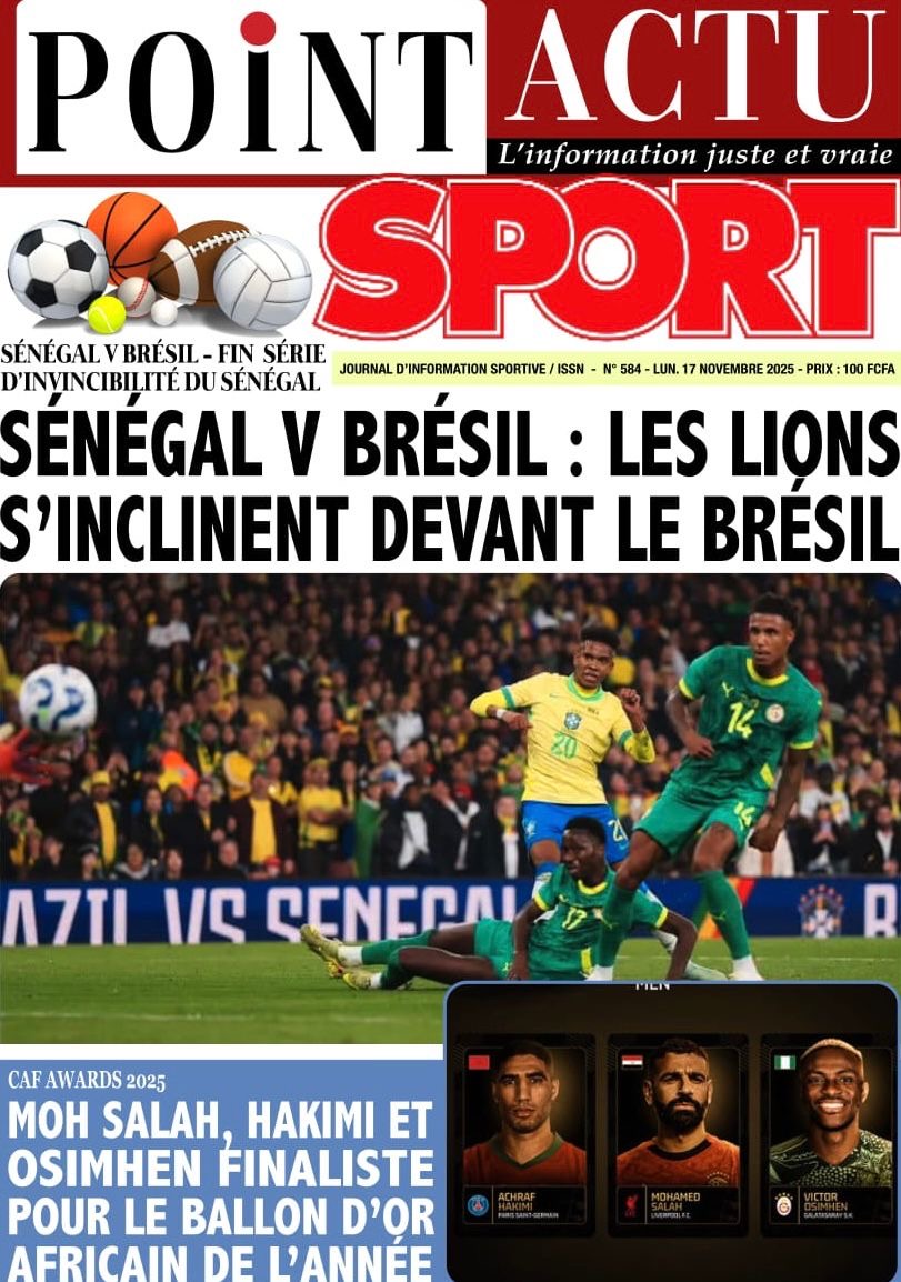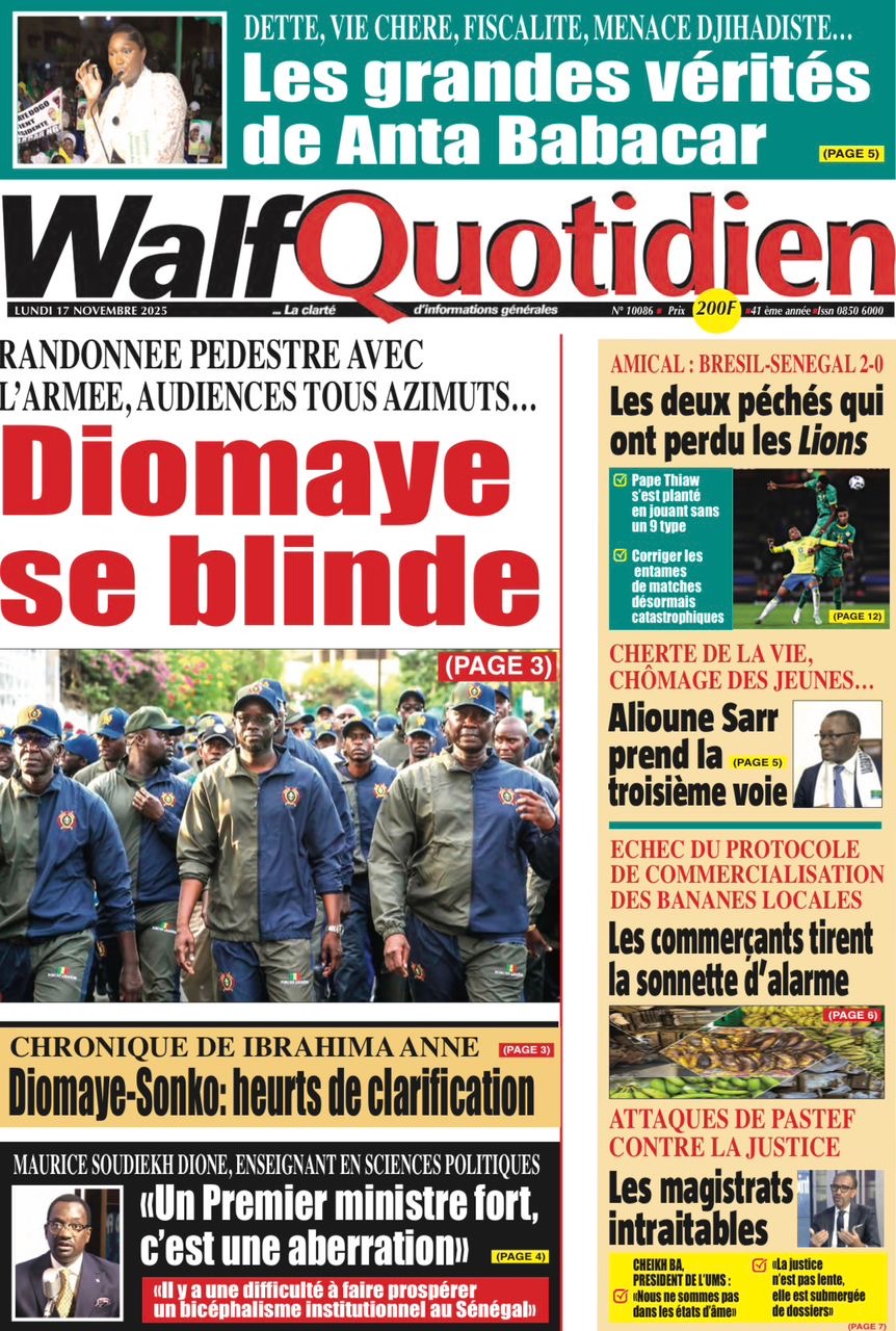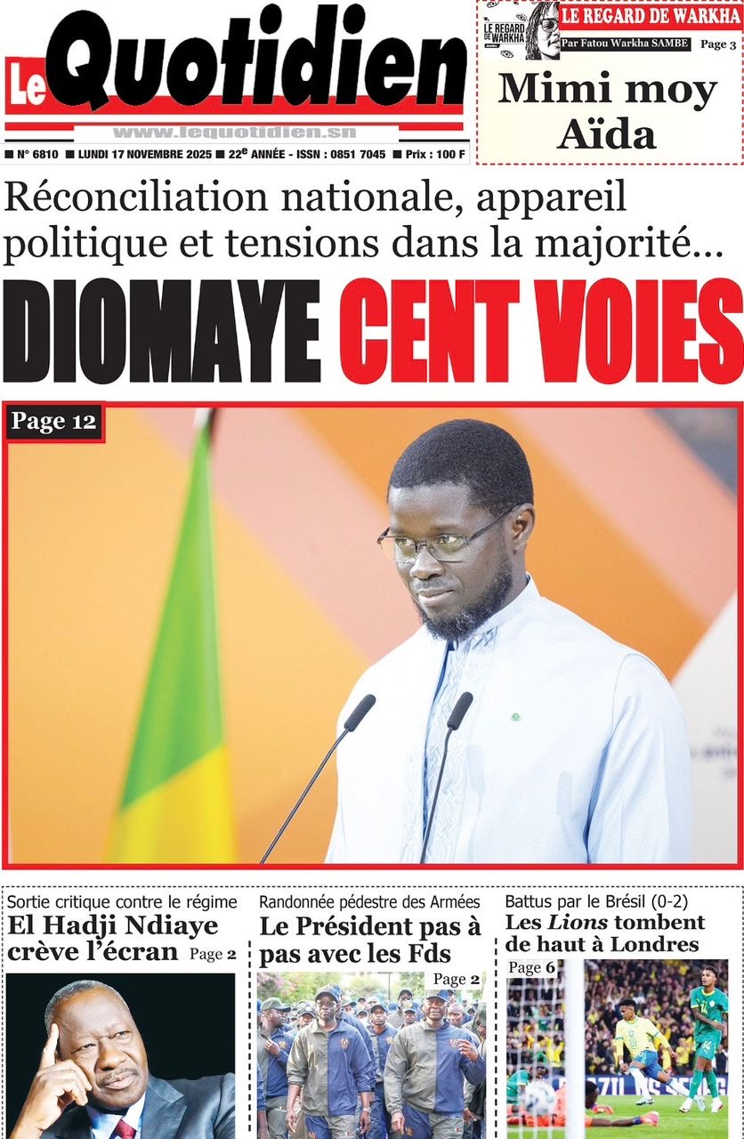 La revue de presse sénégalaise du lundi 17 novembre 2025 met en exergue la participation du Président Bassirou Diomaye Faye à la clôture de la semaine des Forces armées, la sortie du président de l’UMS et la défaite des Lions contre le Brésil en match amical.