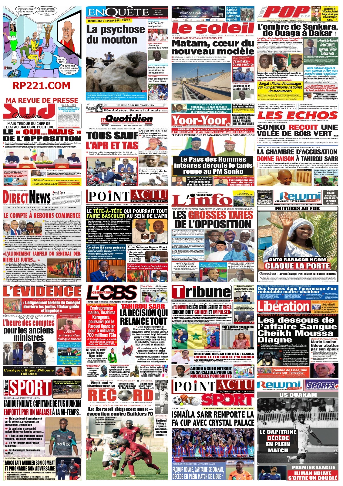 La revue de presse sénégalaise du lundi 19 mai 2025 met en vedette le départ d’Anta Babacar Ngom du FDR, la visite du Premier ministre Ousmane Sonko au Burkina Faso, le début des auditions des 5 anciens ministres de Macky Sall devant la Haute Cour de Justice, entre autres.