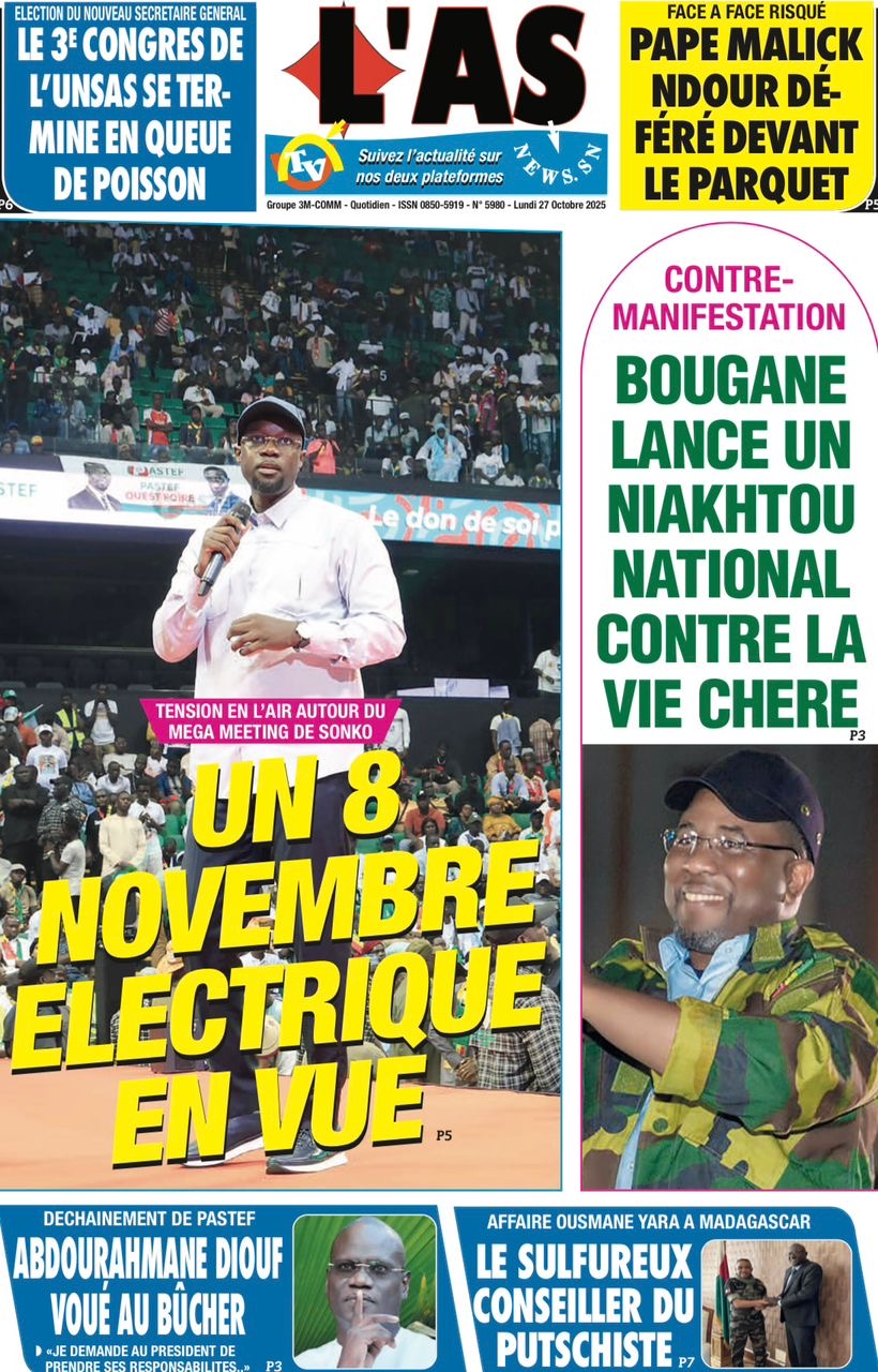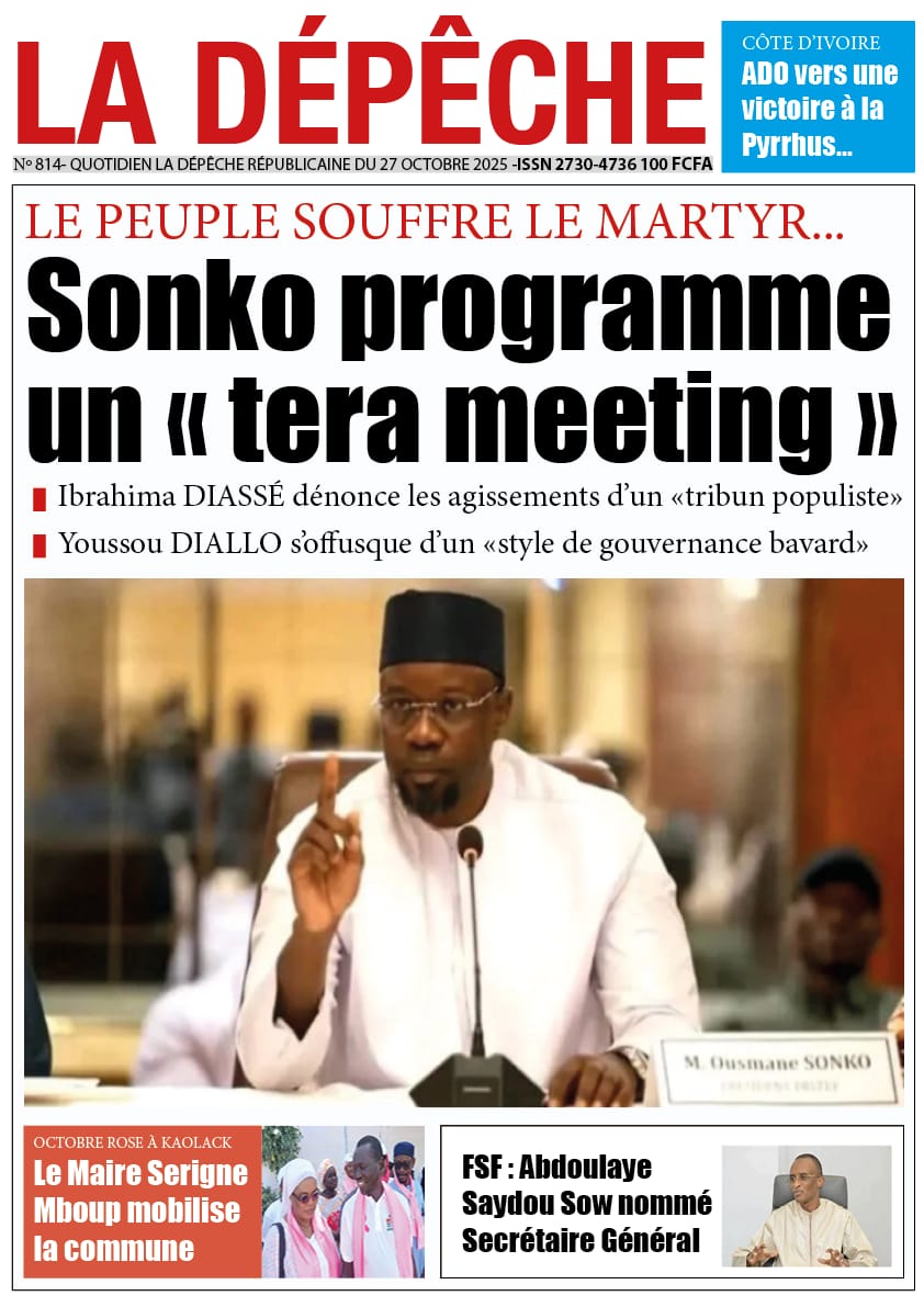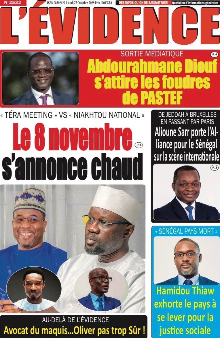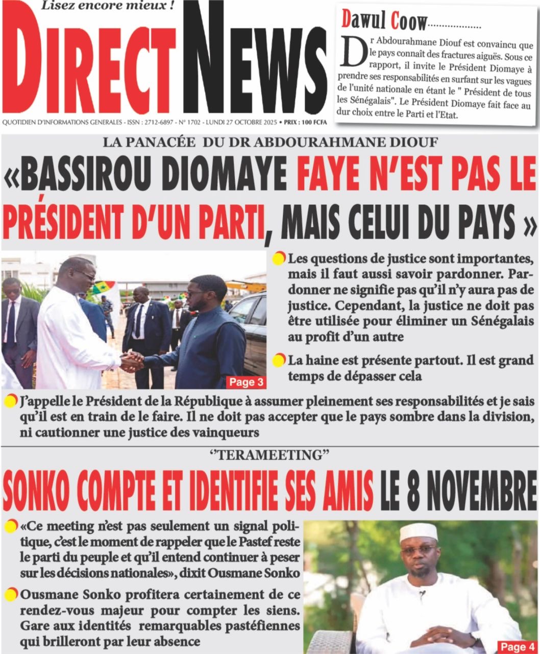 La revue de presse sénégalaise du lundi 27 octobre 2025 revient largement sur l’annonce du Président de Pastef Ousmane Sonko d’un terameeting le 8 novembre et la polémique suscitée par le Dr Abdourakhmane Diouf sur la gestion du pouvoir par Bassirou Diomaye Faye.