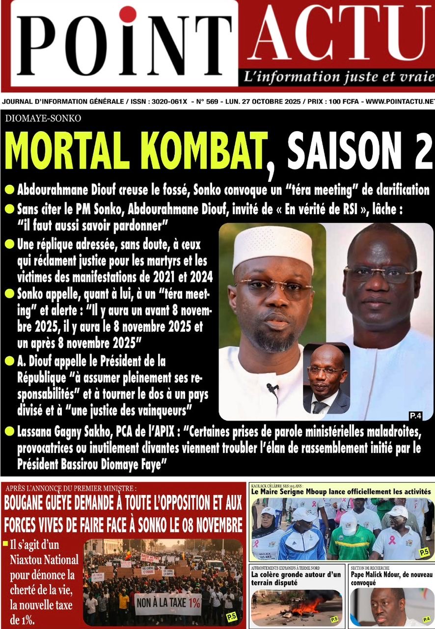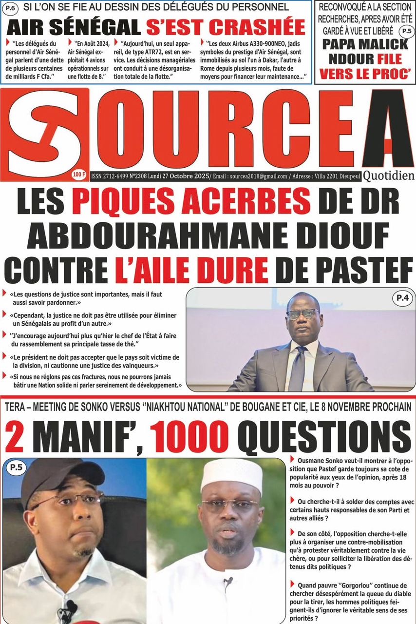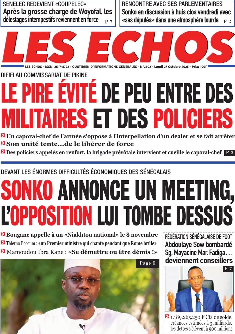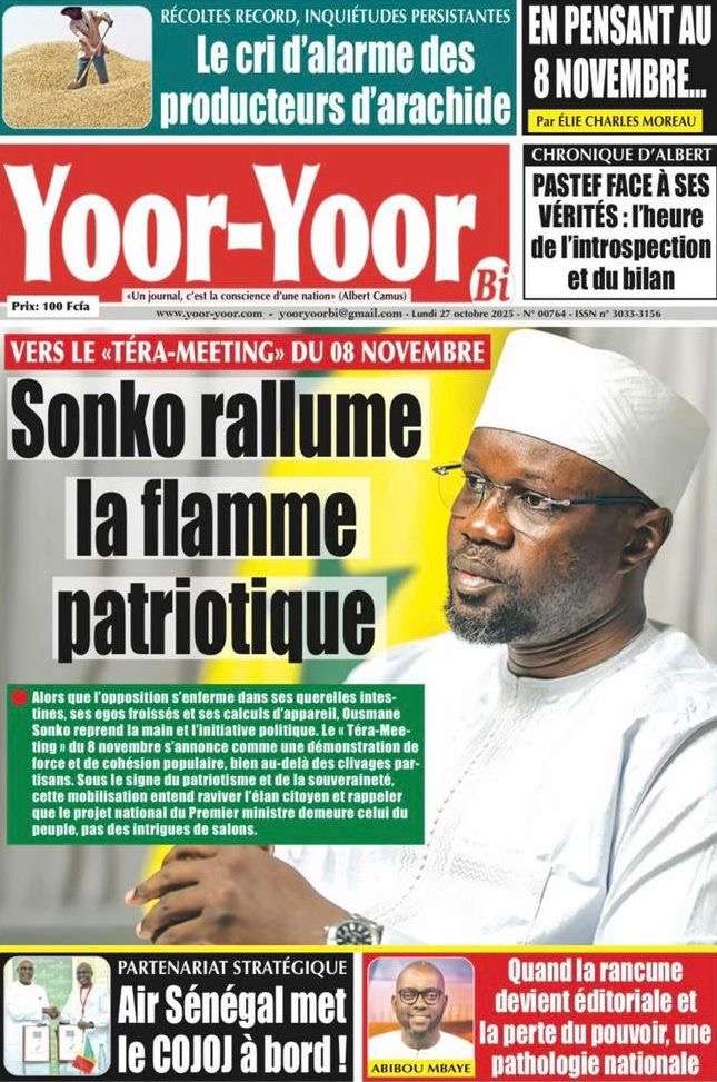 La revue de presse sénégalaise du lundi 27 octobre 2025 revient largement sur l’annonce du Président de Pastef Ousmane Sonko d’un terameeting le 8 novembre et la polémique suscitée par le Dr Abdourakhmane Diouf sur la gestion du pouvoir par Bassirou Diomaye Faye.