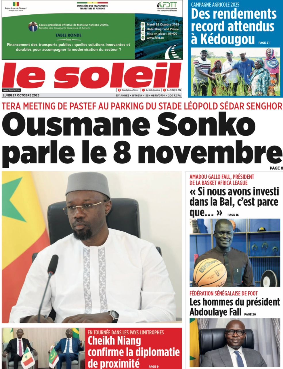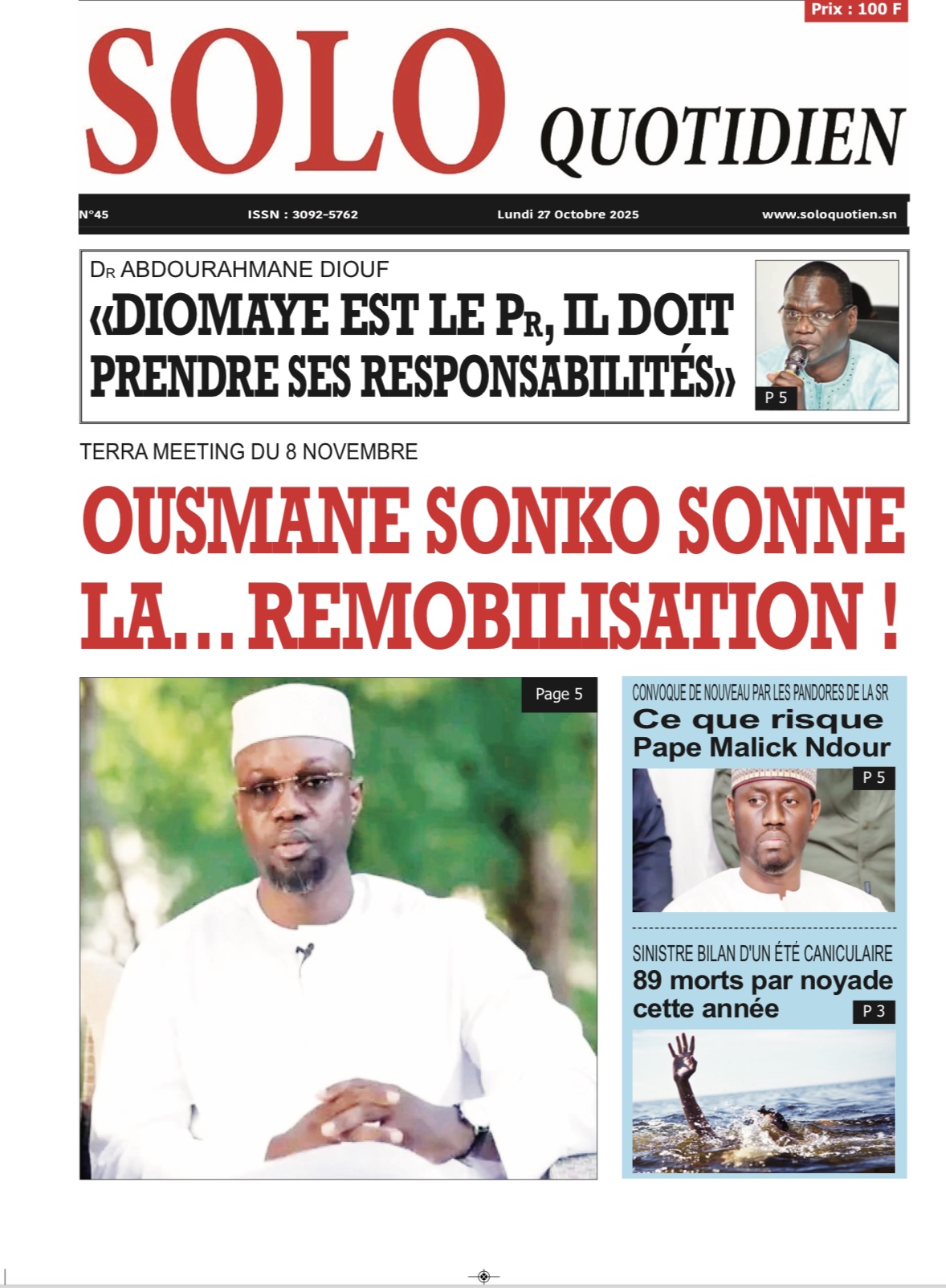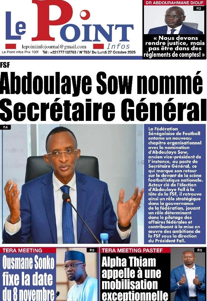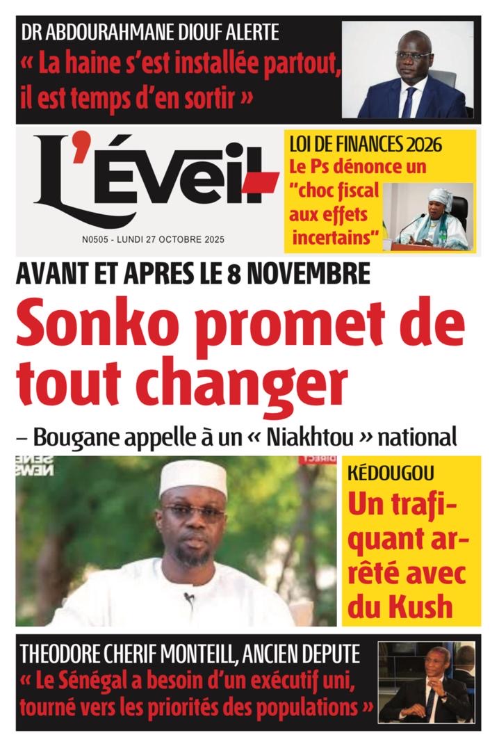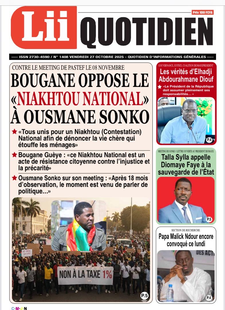 La revue de presse sénégalaise du lundi 27 octobre 2025 revient largement sur l’annonce du Président de Pastef Ousmane Sonko d’un terameeting le 8 novembre et la polémique suscitée par le Dr Abdourakhmane Diouf sur la gestion du pouvoir par Bassirou Diomaye Faye.