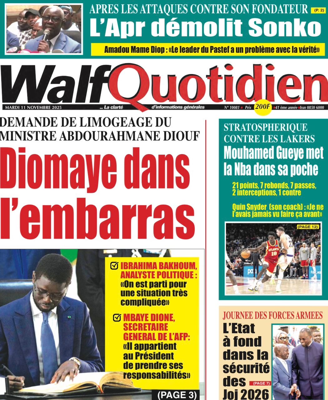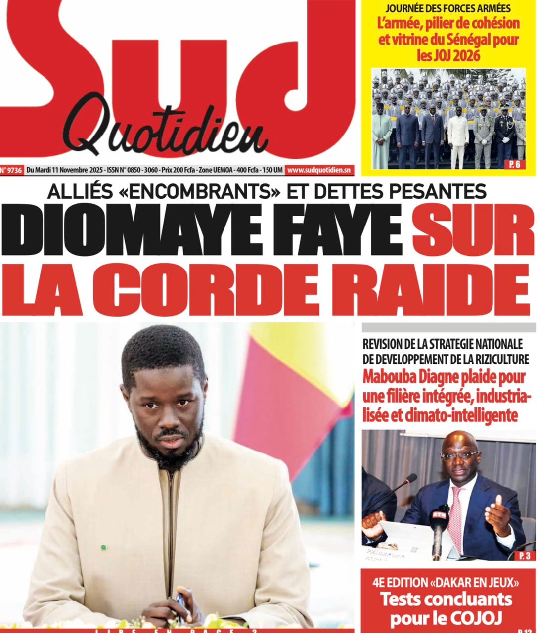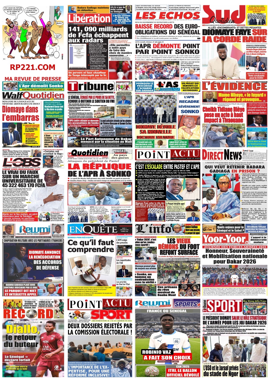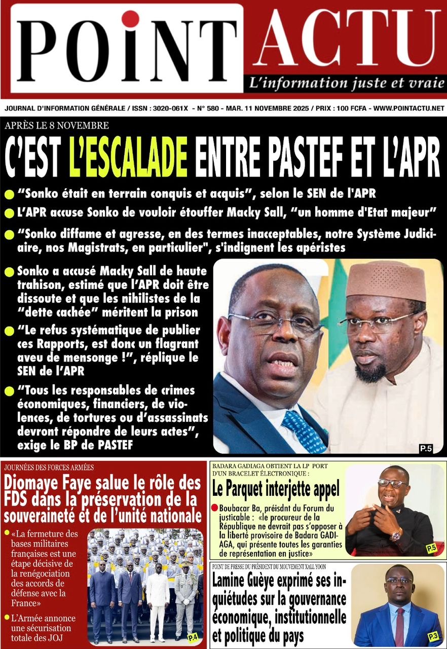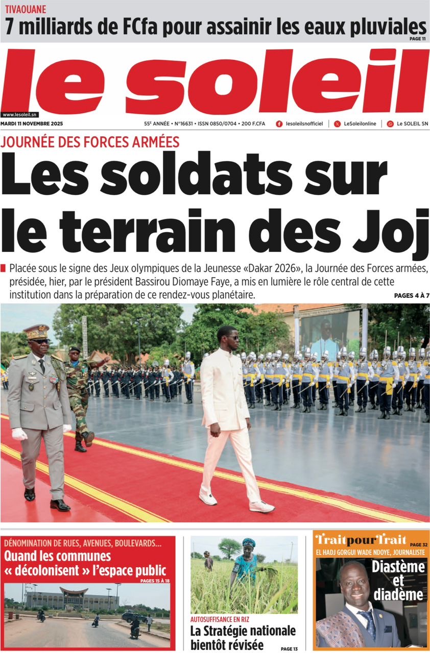 La revue de presse sénégalaise du mardi 11 novembre 2025 est dominée par la journée des Forces Armées présidée par le Chef de l’Etat et la réplique de l’APR au Président de Pastef, après ses déclarations lors du terameeting du samedi 8 novembre.