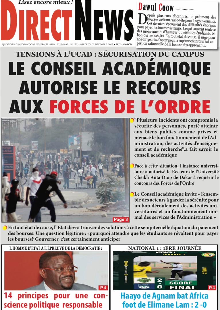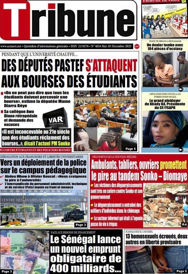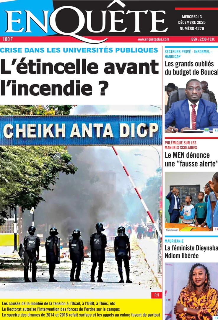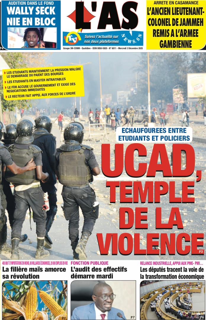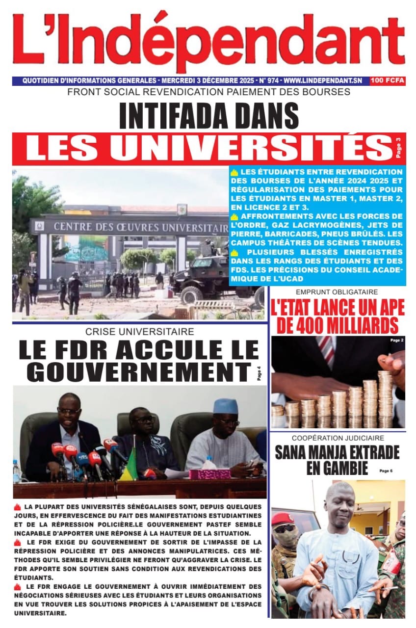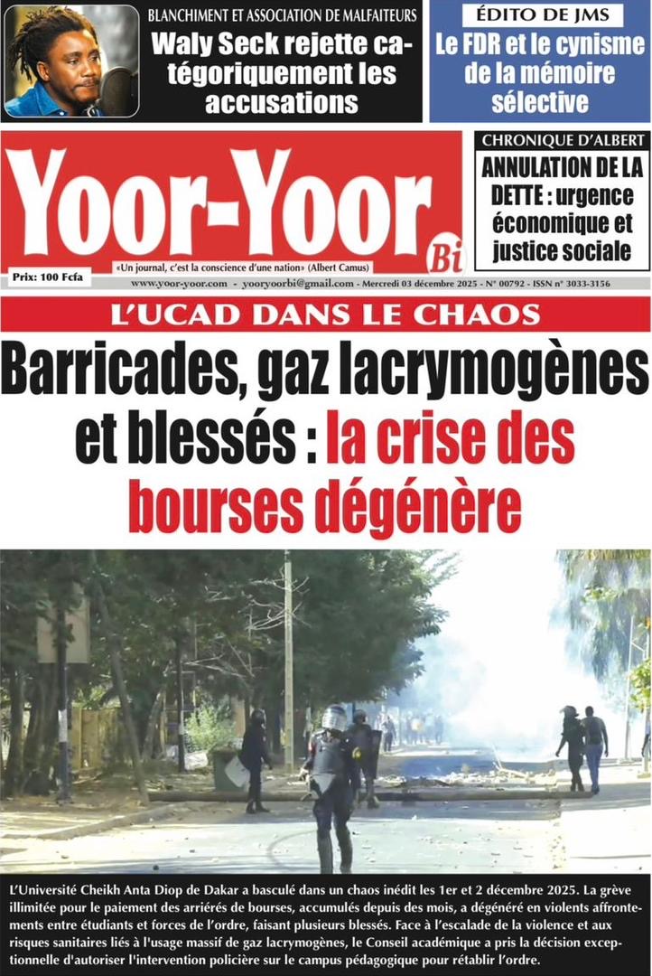 La revue de presse sénégalaise du mercredi 03 décembre 2025 revient largement sur les violences à l’université de Dakar, UCAD, où les étudiants réclament le payement de leurs bourses.