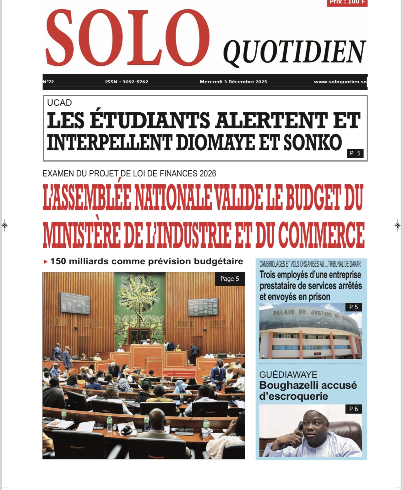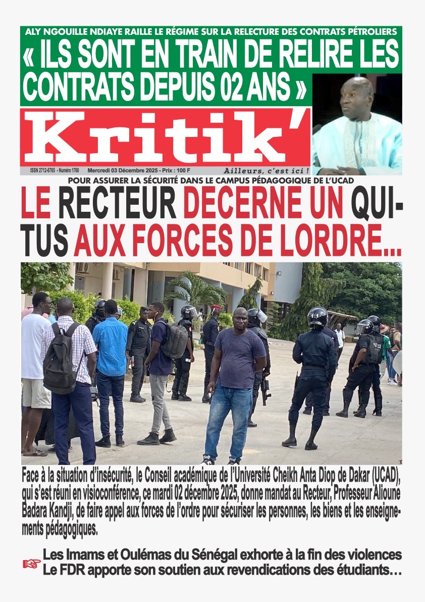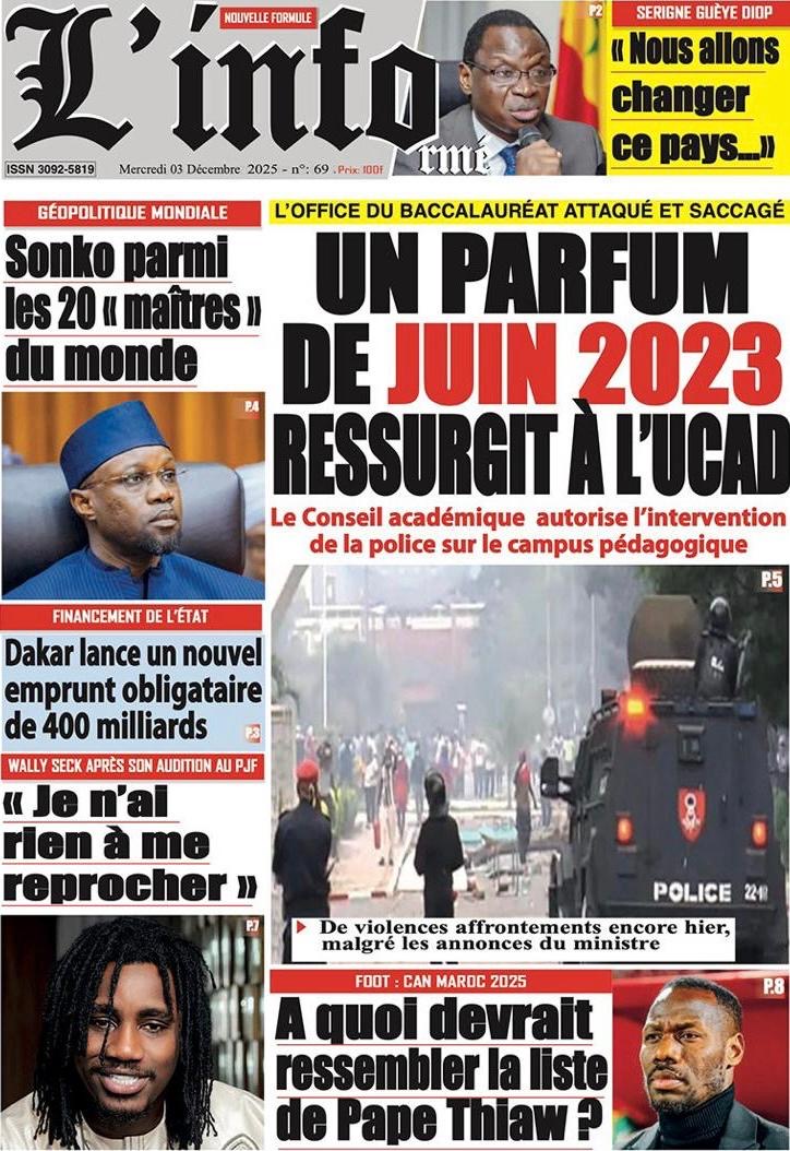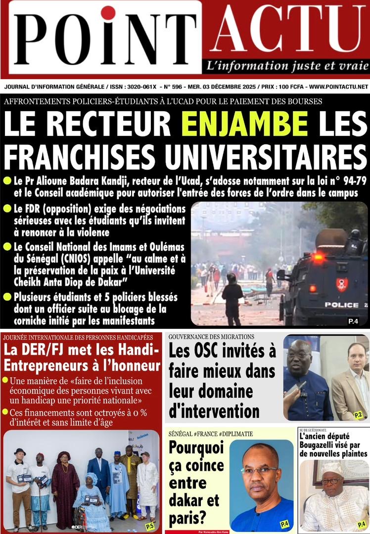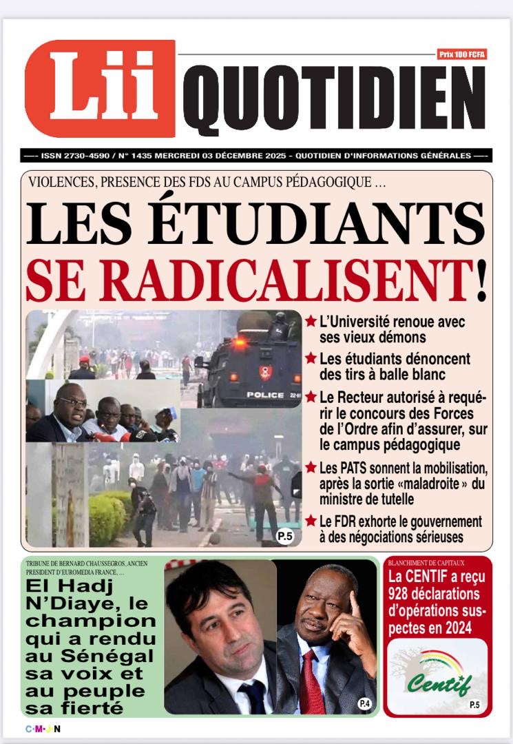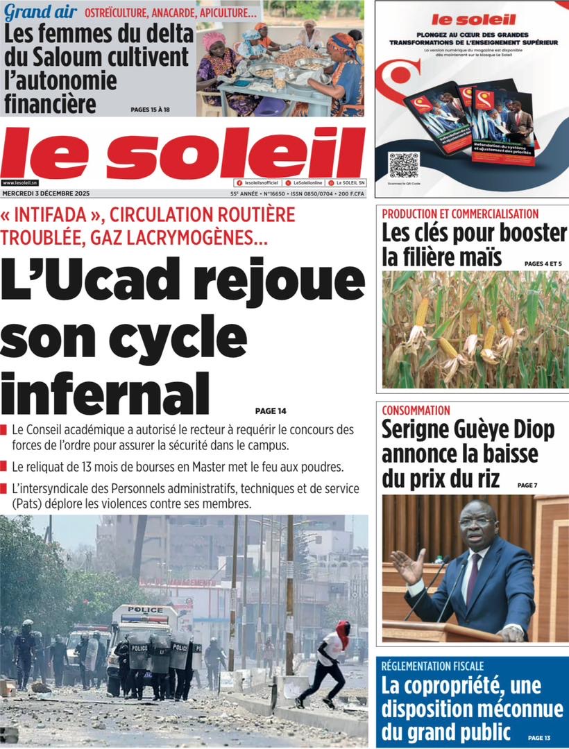 La revue de presse sénégalaise du mercredi 03 décembre 2025 revient largement sur les violences à l’université de Dakar, UCAD, où les étudiants réclament le payement de leurs bourses.