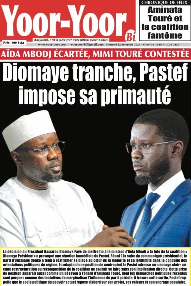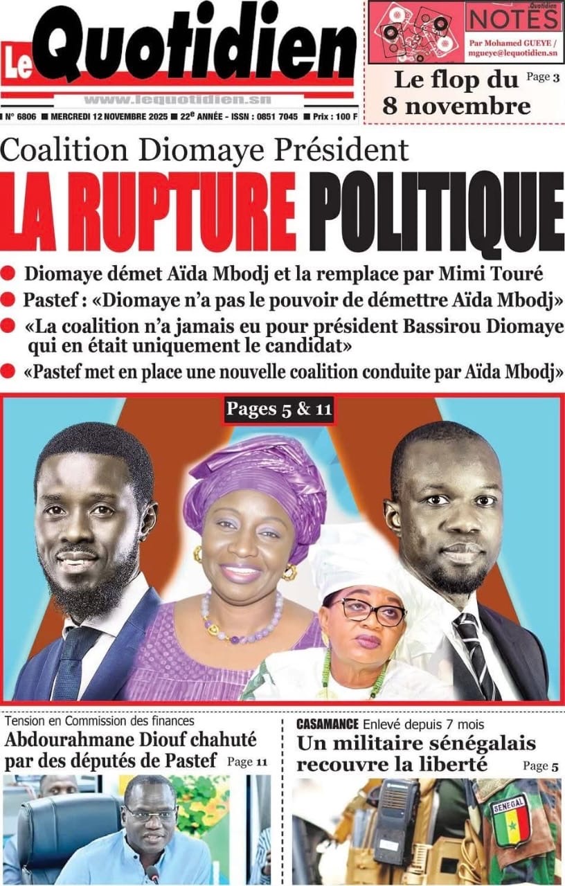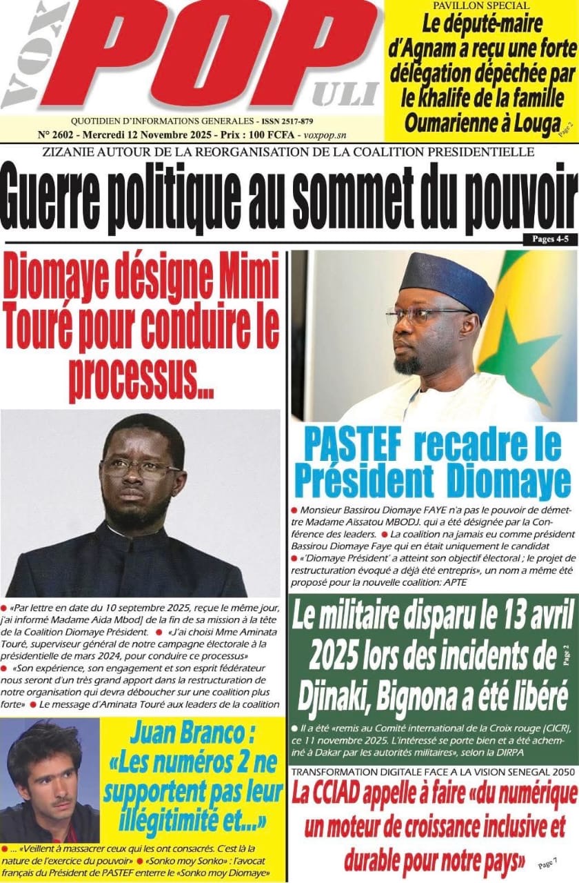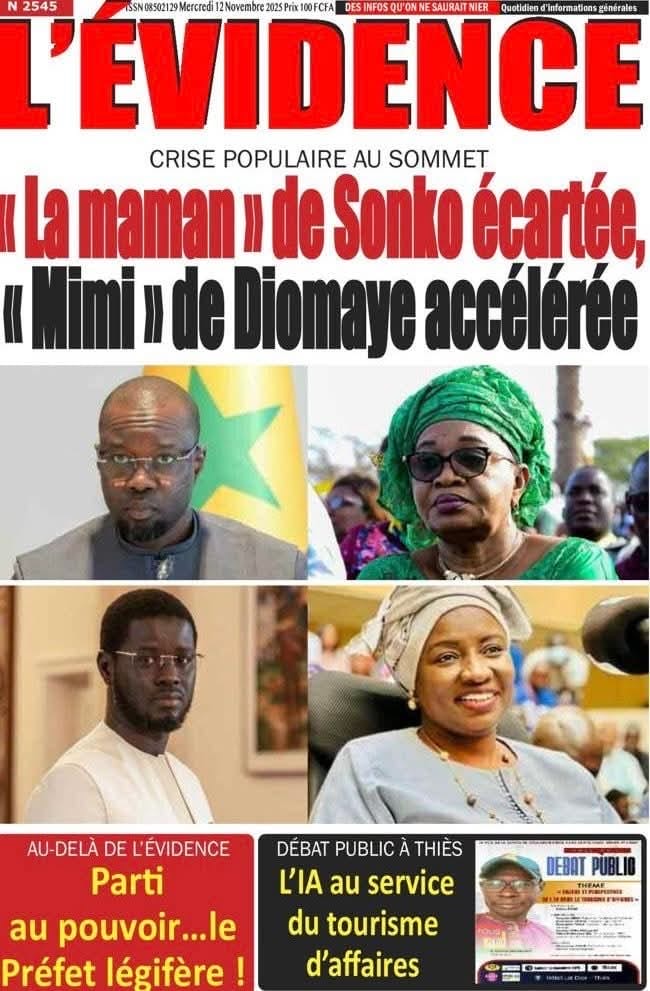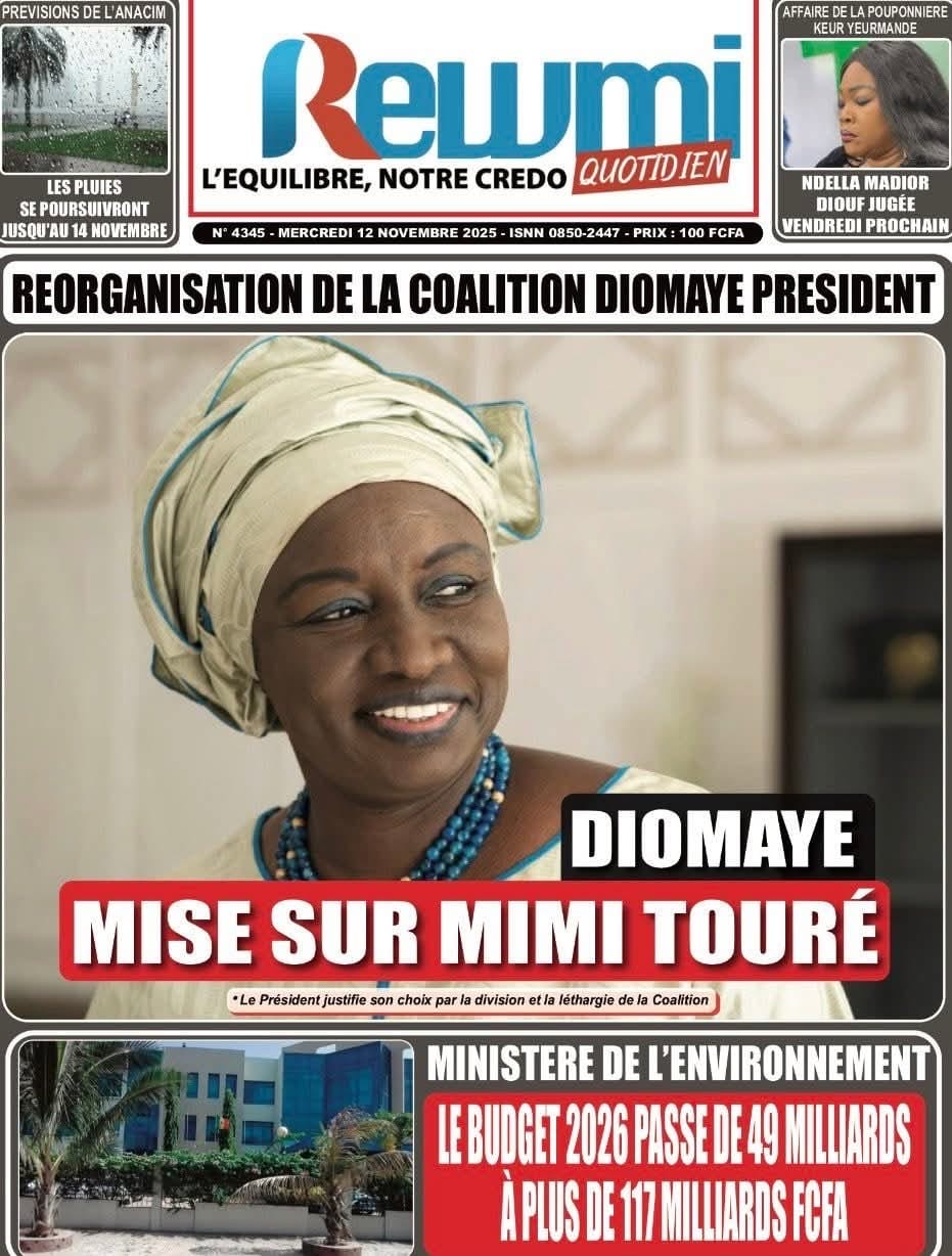 La revue de presse sénégalaise du mercredi 12 novembre 2025 a comme sujet principal le remplacement à la tête de la Coalition Diomaye Président d’Aïda Mbodji par Mimi Touré, interprétée comme une ligne de fracture entre les deux têtes de file du régime en place.