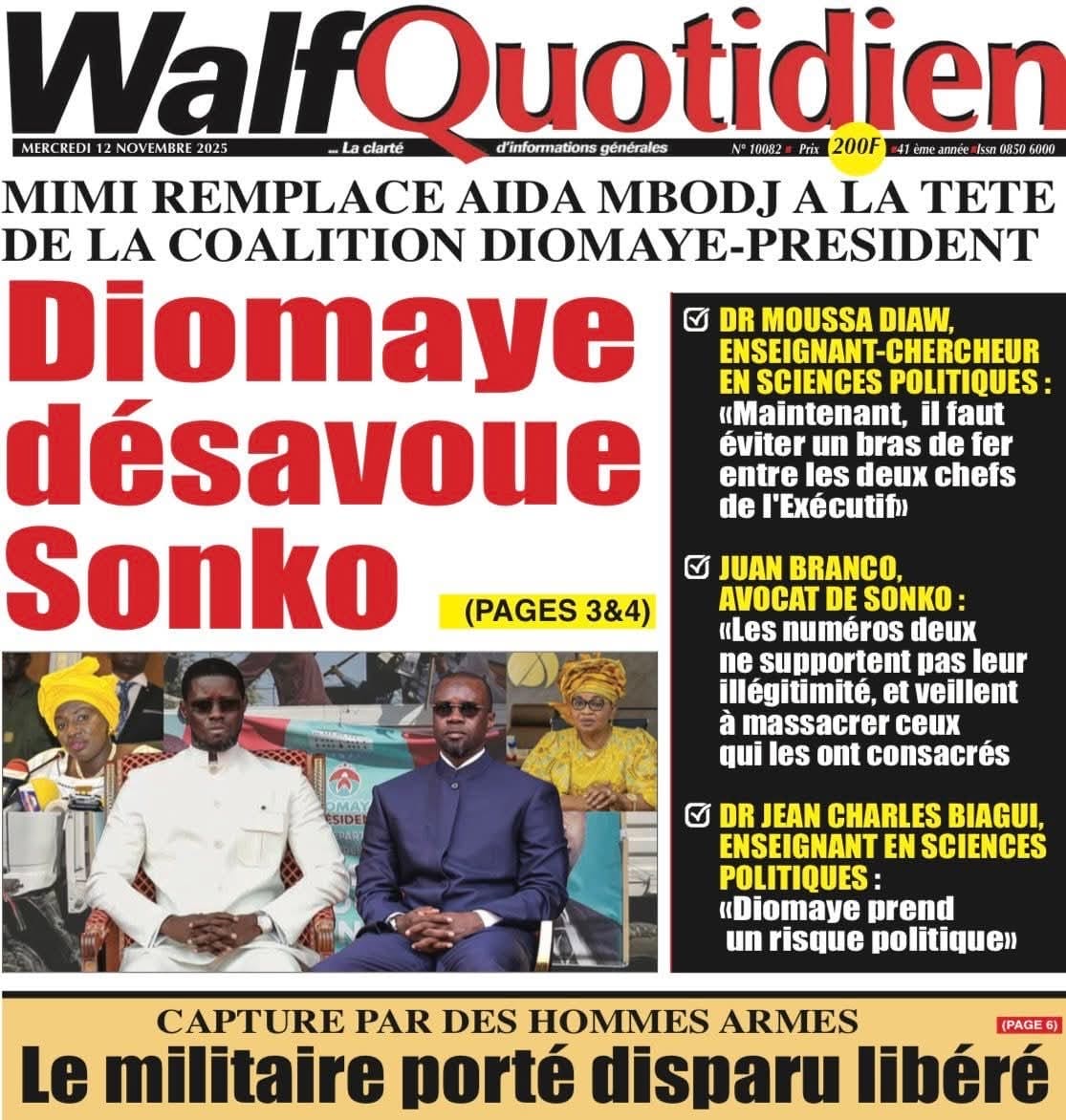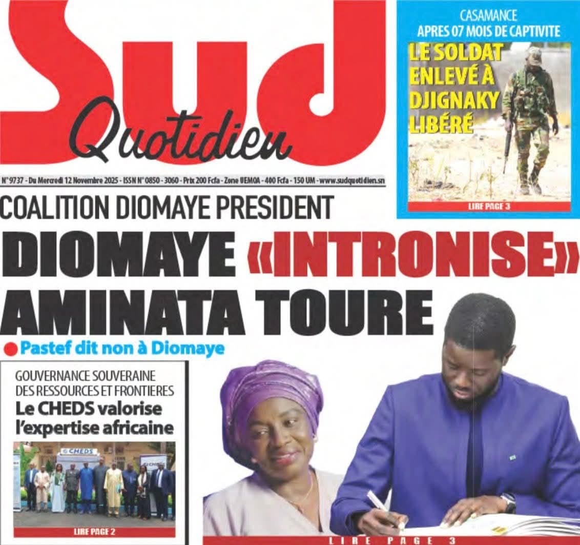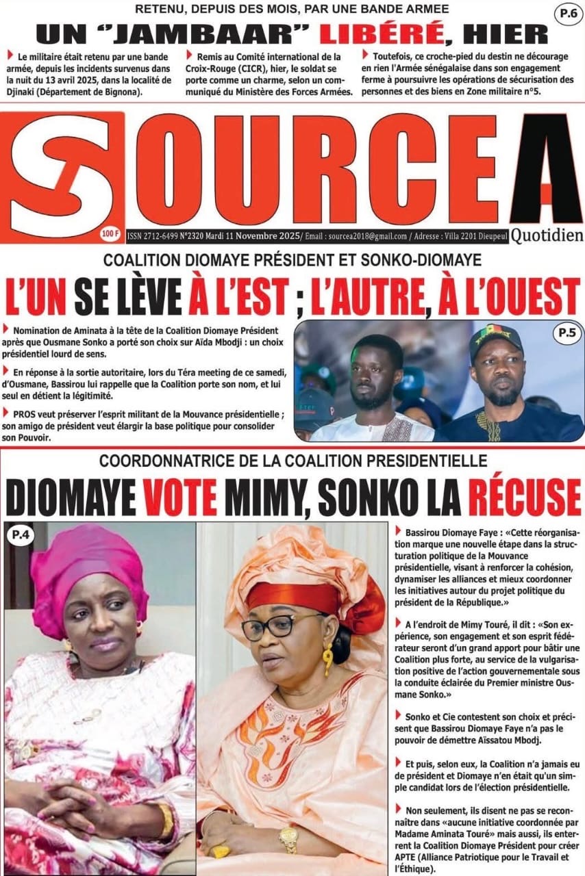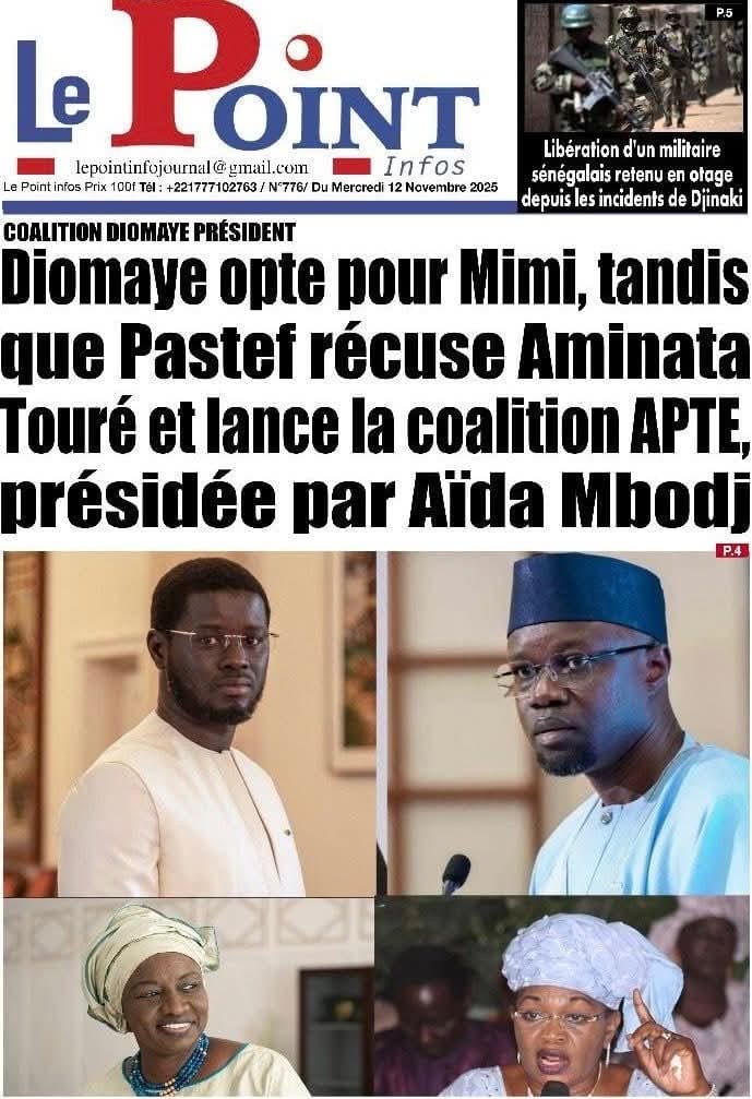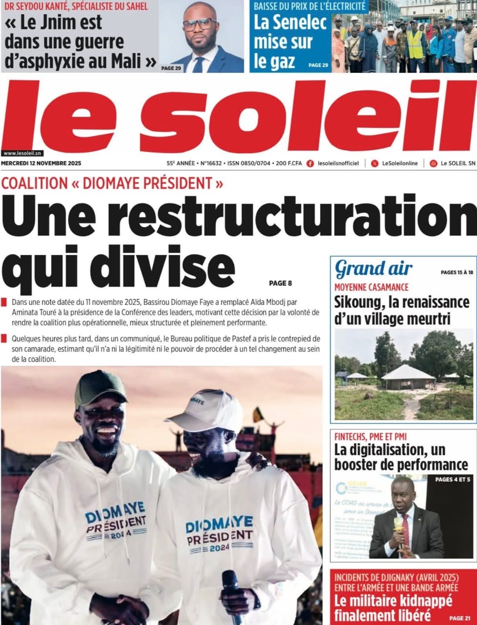 La revue de presse sénégalaise du mercredi 12 novembre 2025 a comme sujet principal le remplacement à la tête de la Coalition Diomaye Président d’Aïda Mbodji par Mimi Touré, interprétée comme une ligne de fracture entre les deux têtes de file du régime en place.