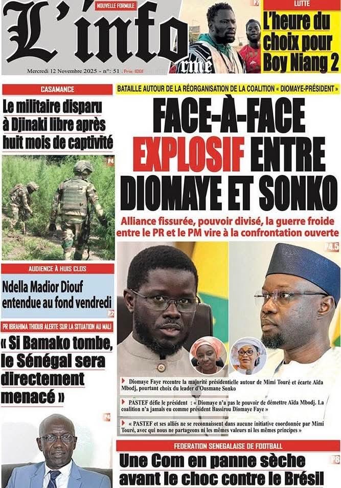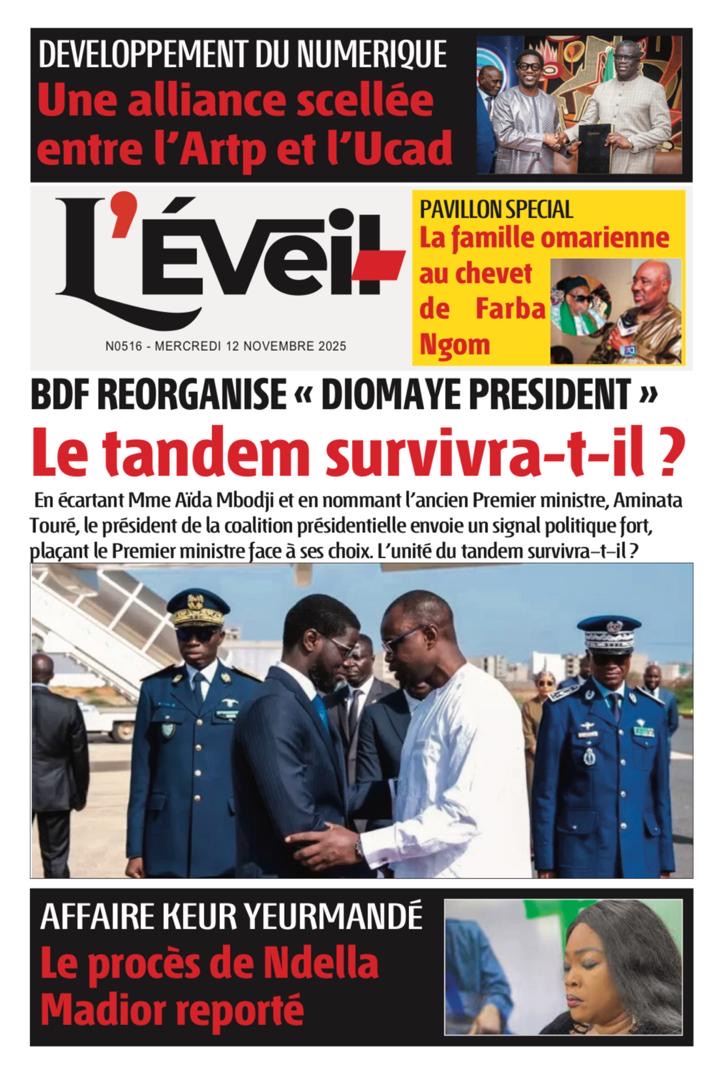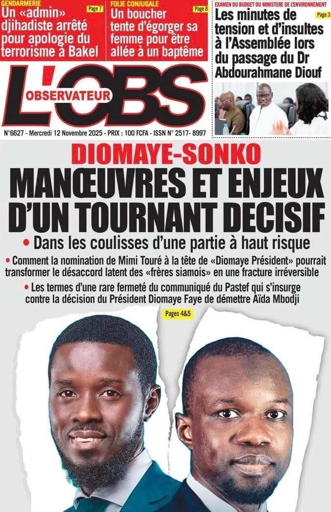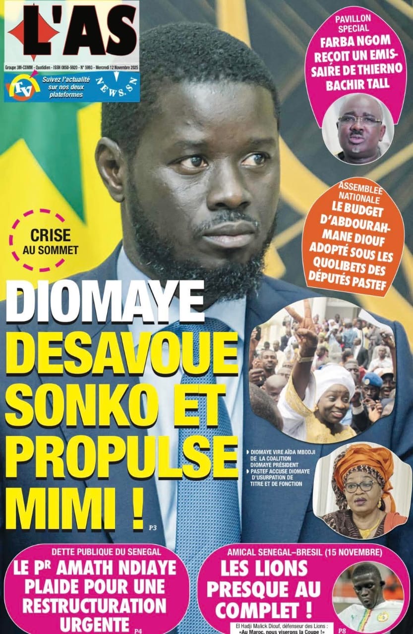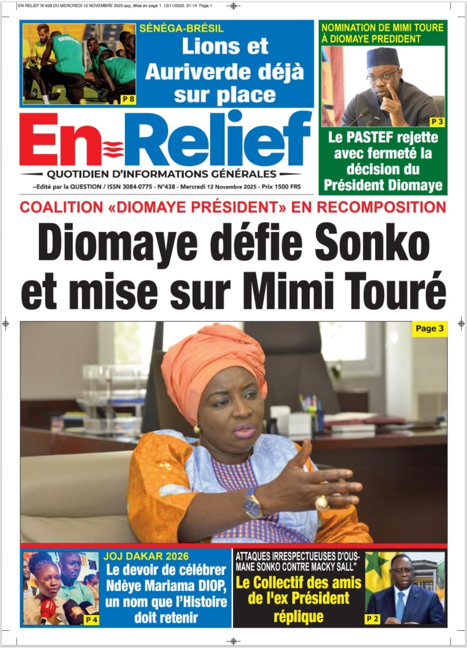 La revue de presse sénégalaise du mercredi 12 novembre 2025 a comme sujet principal le remplacement à la tête de la Coalition Diomaye Président d’Aïda Mbodji par Mimi Touré, interprétée comme une ligne de fracture entre les deux têtes de file du régime en place.