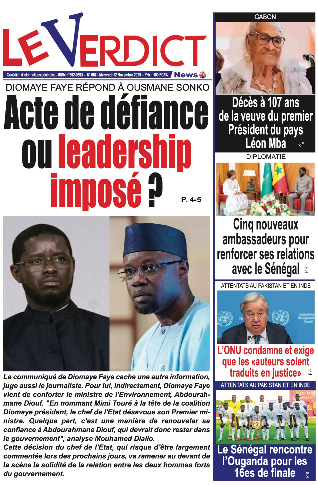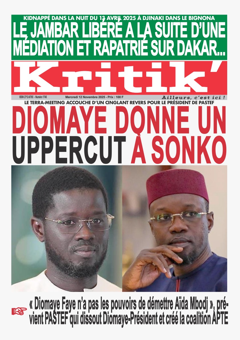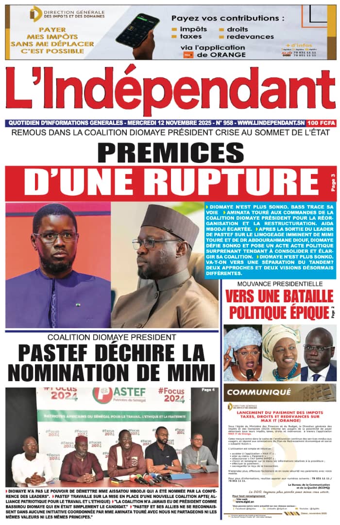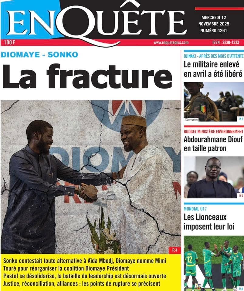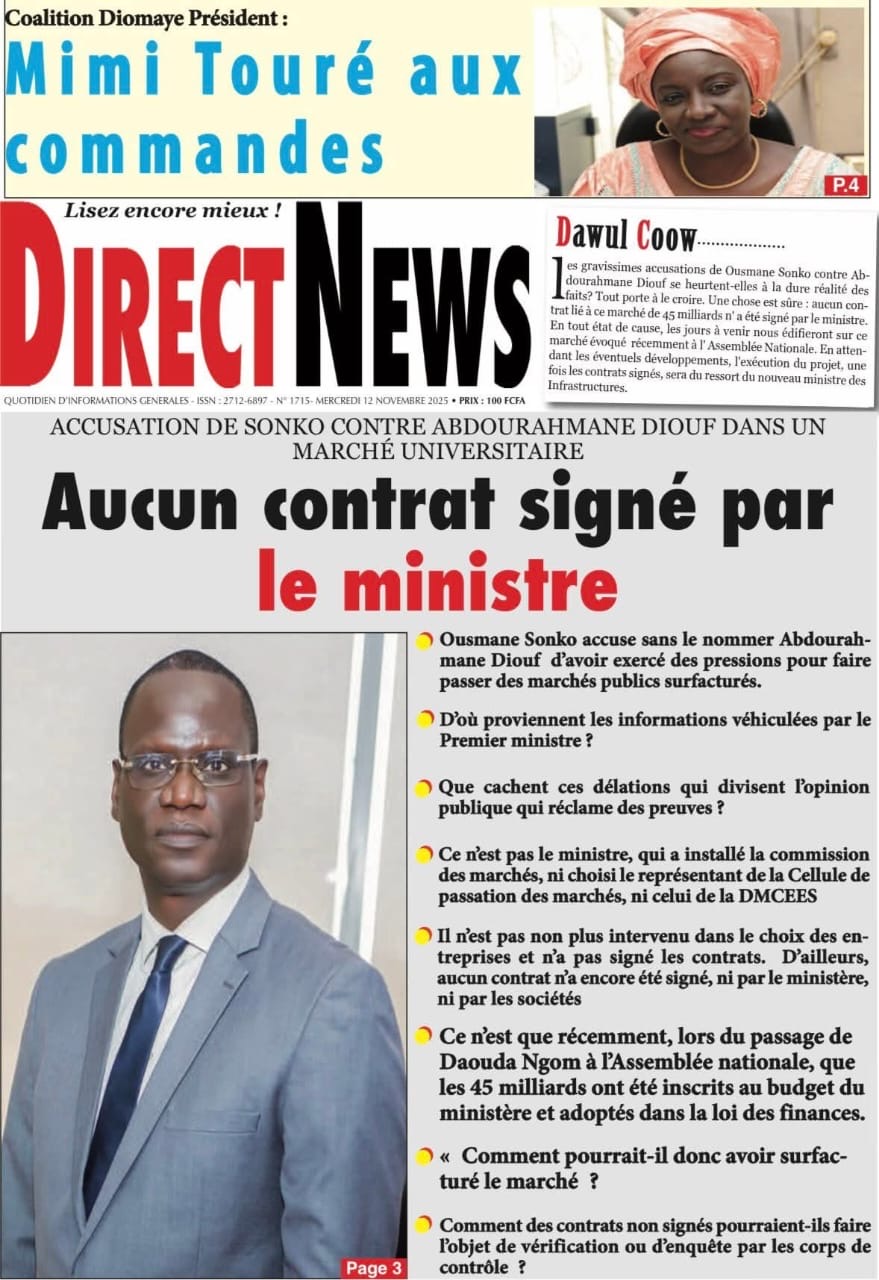 La revue de presse sénégalaise du mercredi 12 novembre 2025 a comme sujet principal le remplacement à la tête de la Coalition Diomaye Président d’Aïda Mbodji par Mimi Touré, interprétée comme une ligne de fracture entre les deux têtes de file du régime en place.