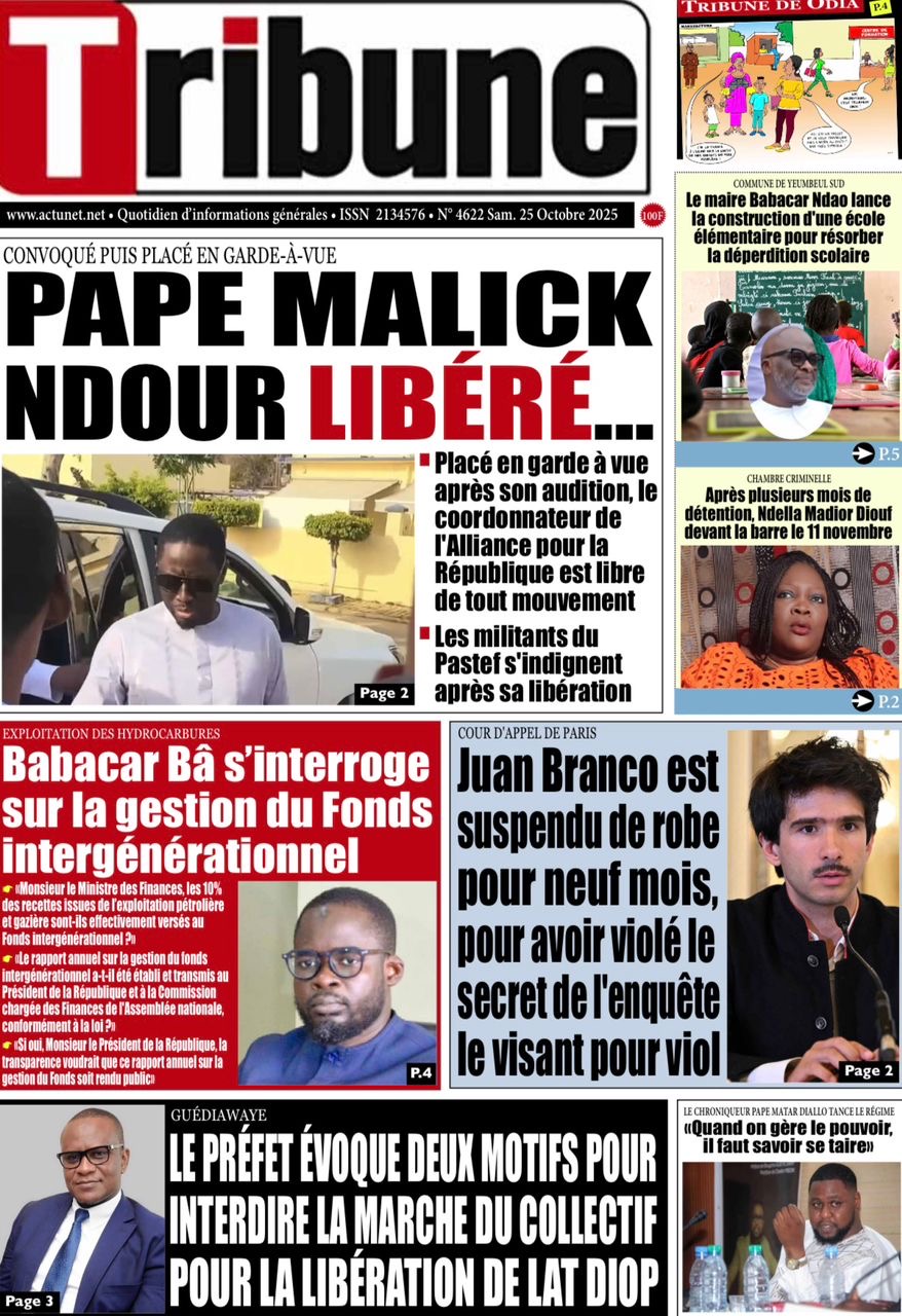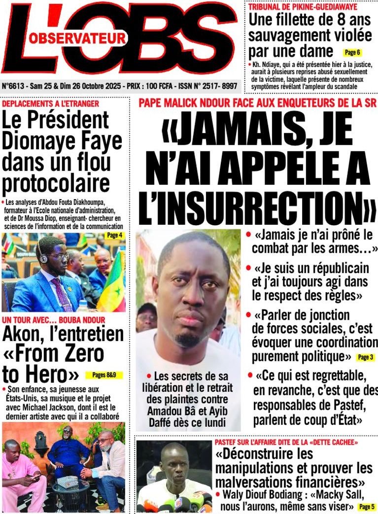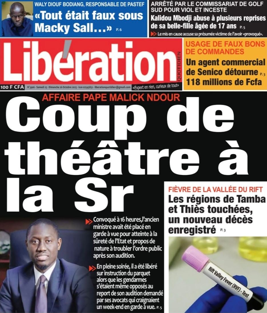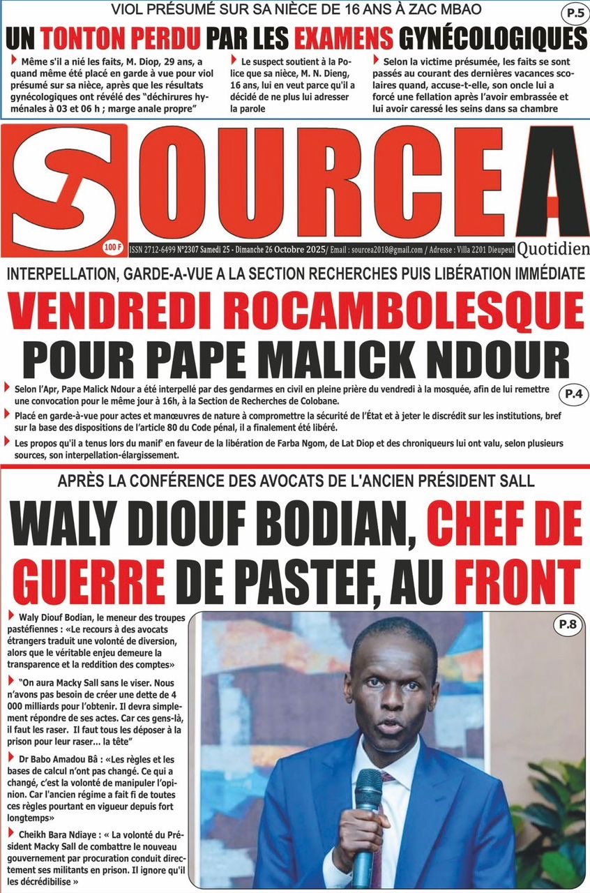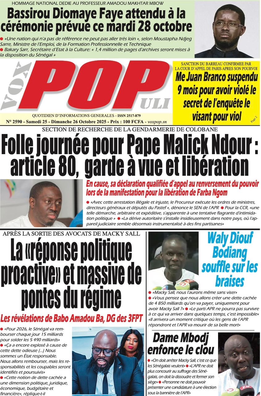 La revue de presse sénégalaise du samedi 25 octobre 2025 a deux sujets en vedette : la mise en garde à vue puis la libération de l’ancien ministre Pape Malick Ndour et la réplique du Pastef aux avocats de Macky Sall dans l’affaire dite de la « dette cachée ».