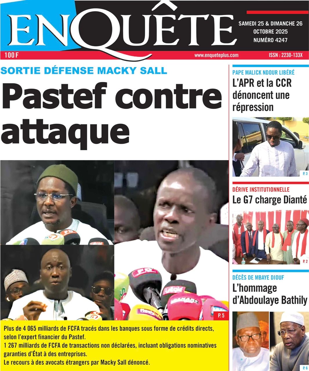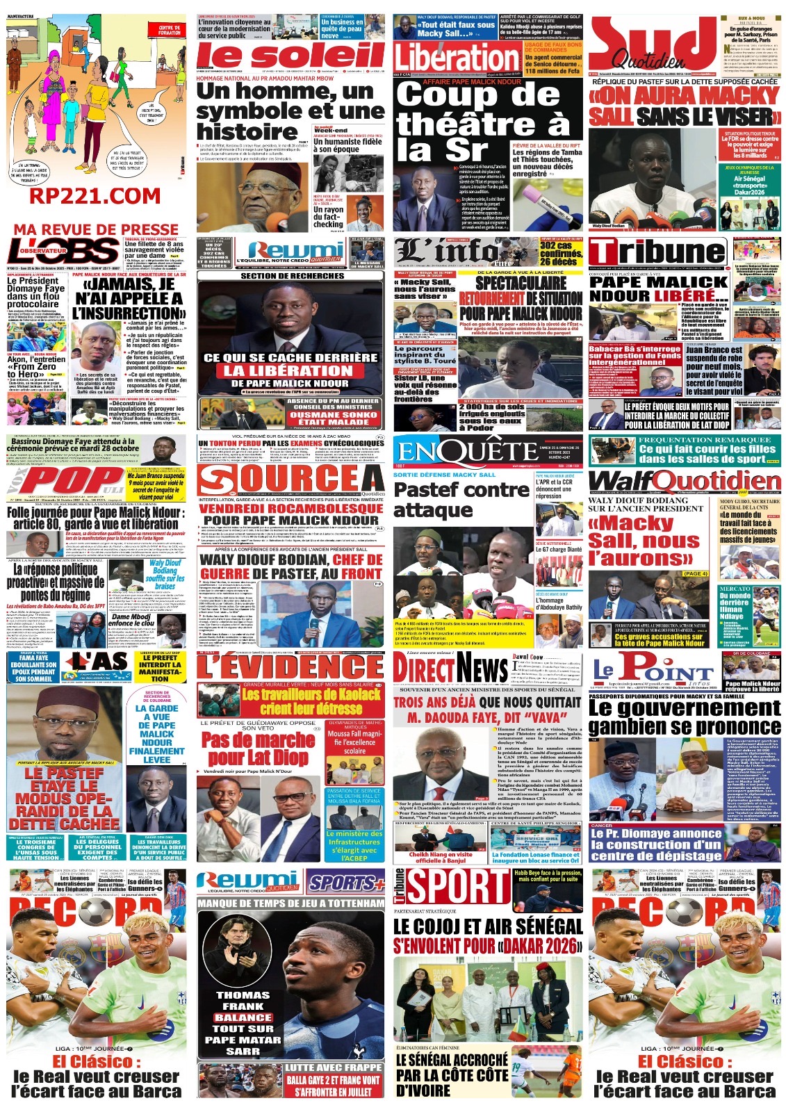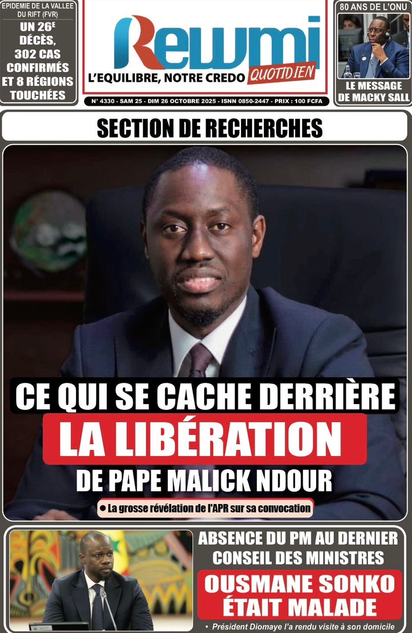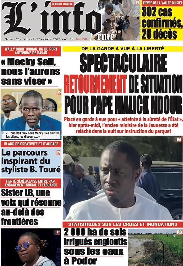 La revue de presse sénégalaise du samedi 25 octobre 2025 a deux sujets en vedette : la mise en garde à vue puis la libération de l’ancien ministre Pape Malick Ndour et la réplique du Pastef aux avocats de Macky Sall dans l’affaire dite de la « dette cachée ».