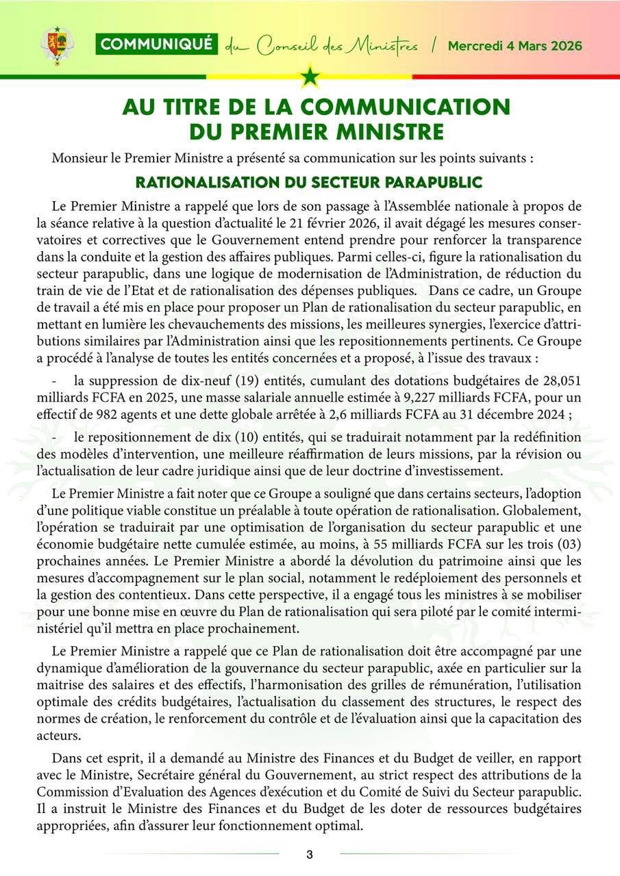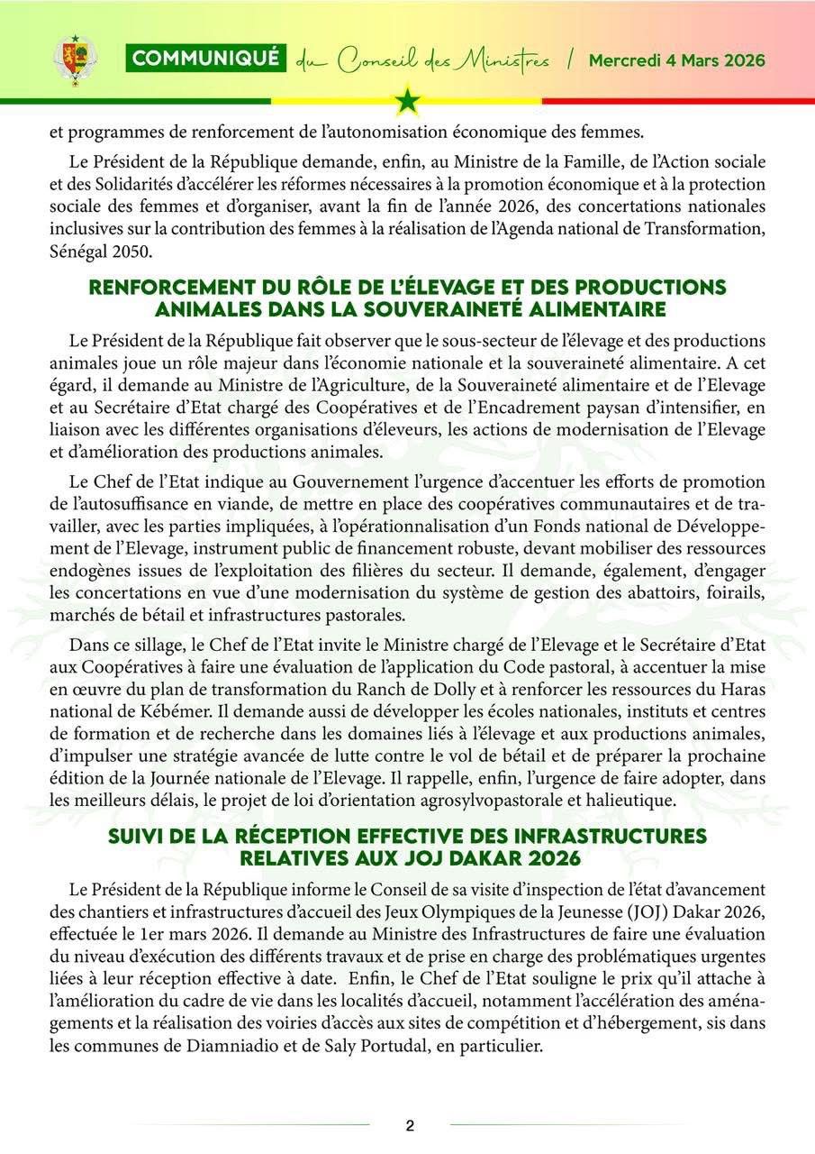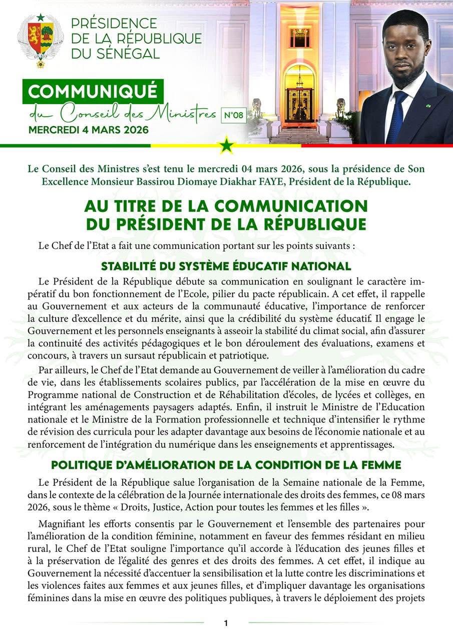 Le communiqué du Conseil des ministres, du mercredi 04 mars 2026