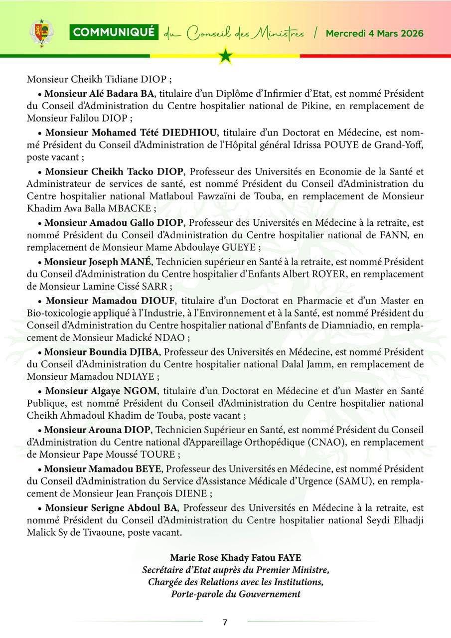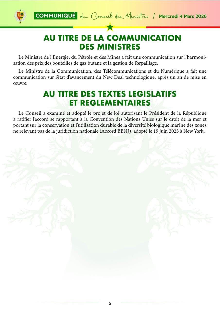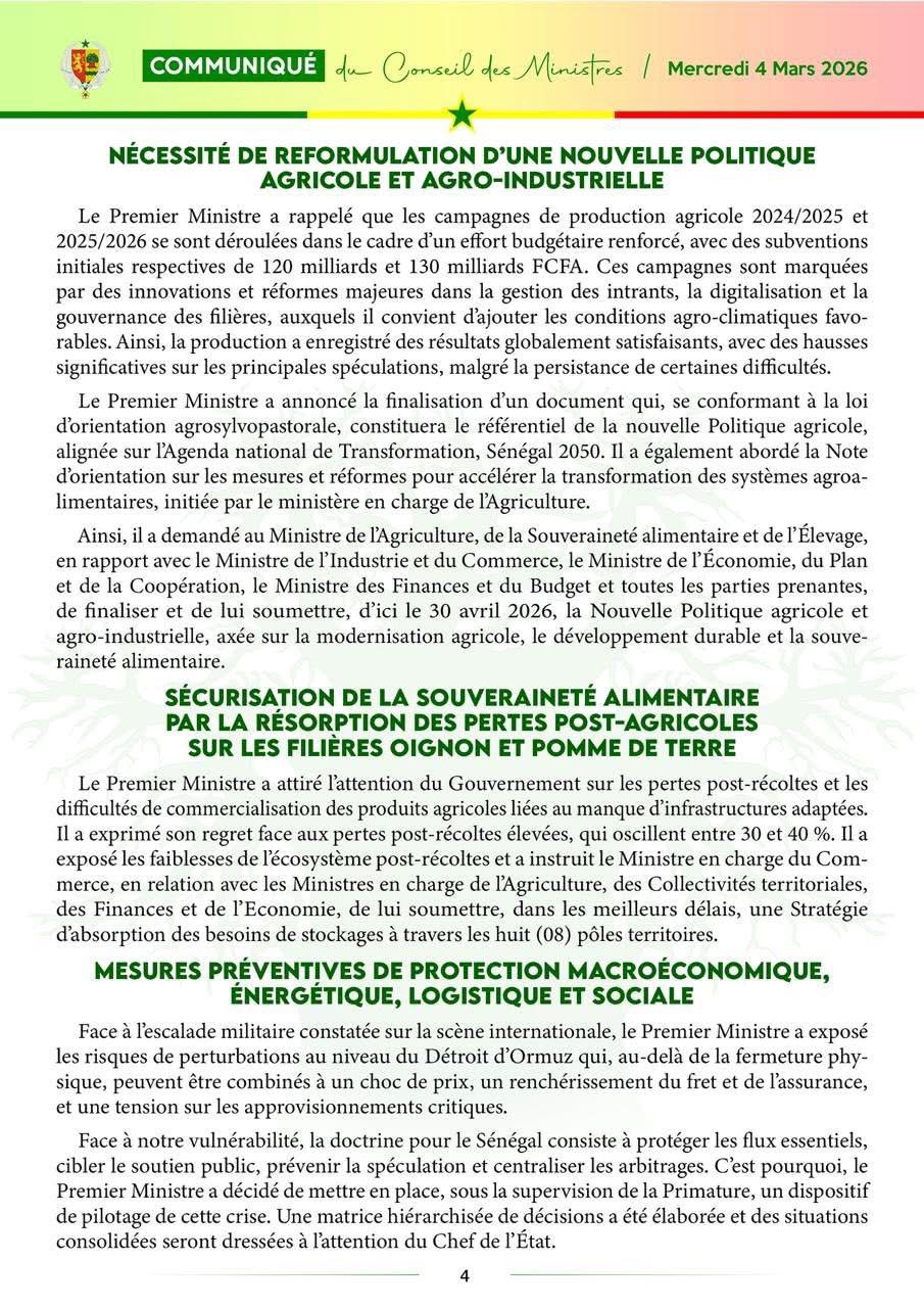 Le communiqué du Conseil des ministres, du mercredi 04 mars 2026