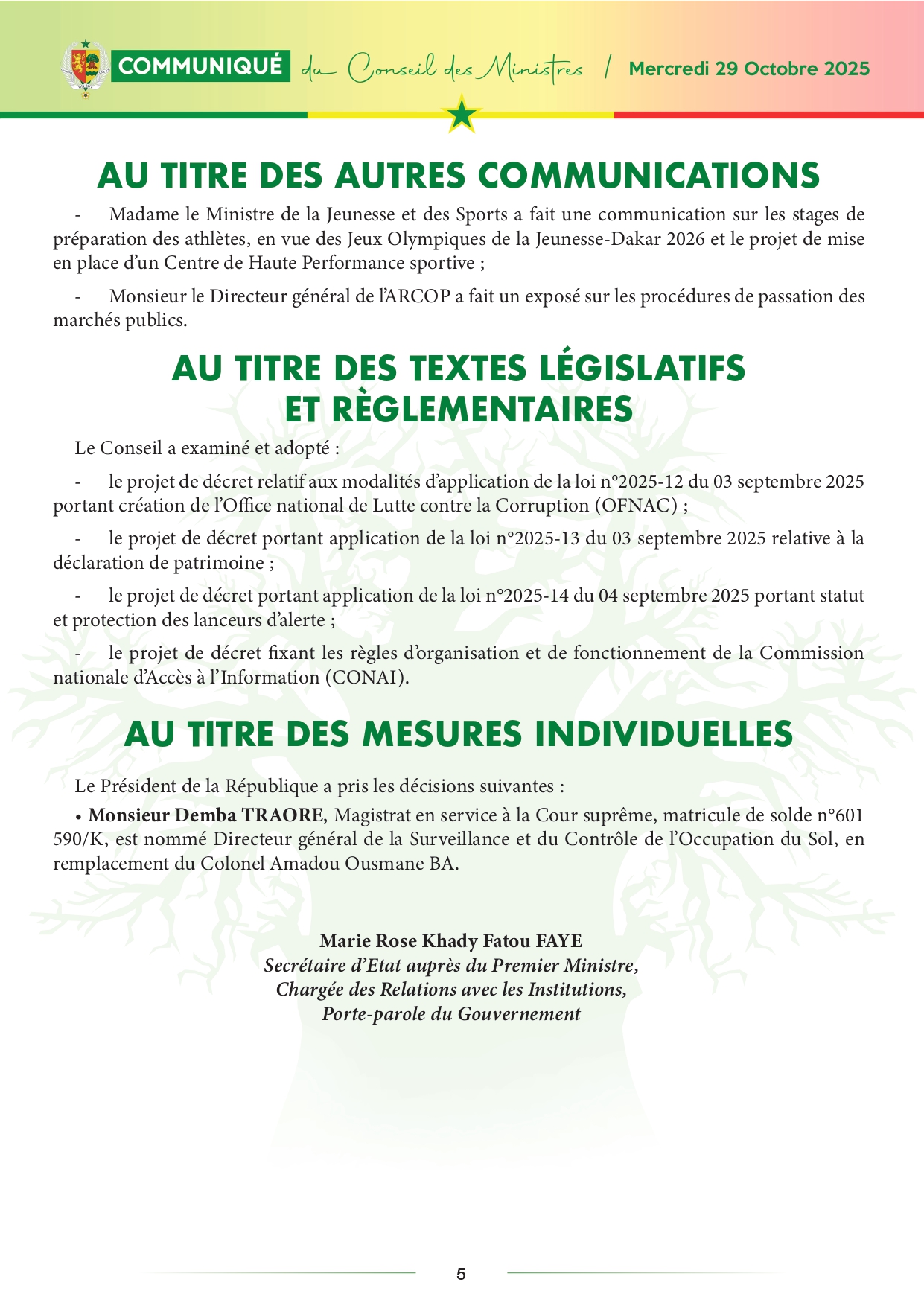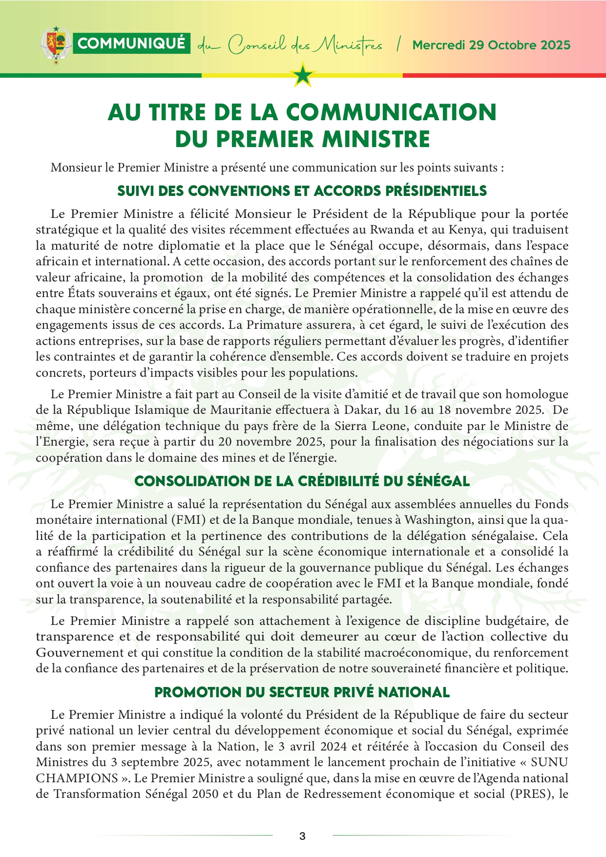 Conseil des ministres : nous vous partageons le communiqué de la réunion hebdomadaire de ce 29 octobre tenue au Palais, sous la présidence de Son Excellence le Chef de l’Etat Bassirou Diomaye Faye.