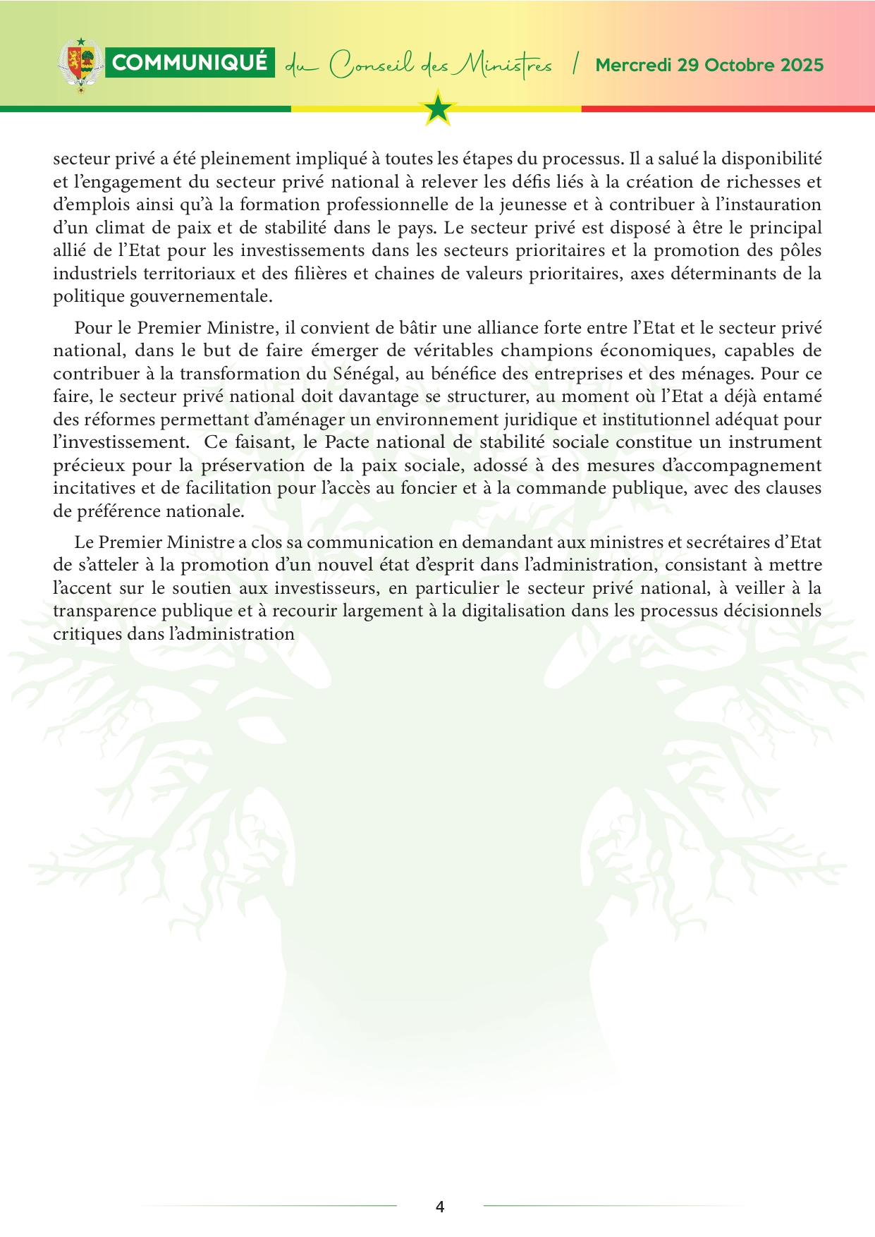 Conseil des ministres : le communiqué intégral de la réunion du mercredi 29 octobre