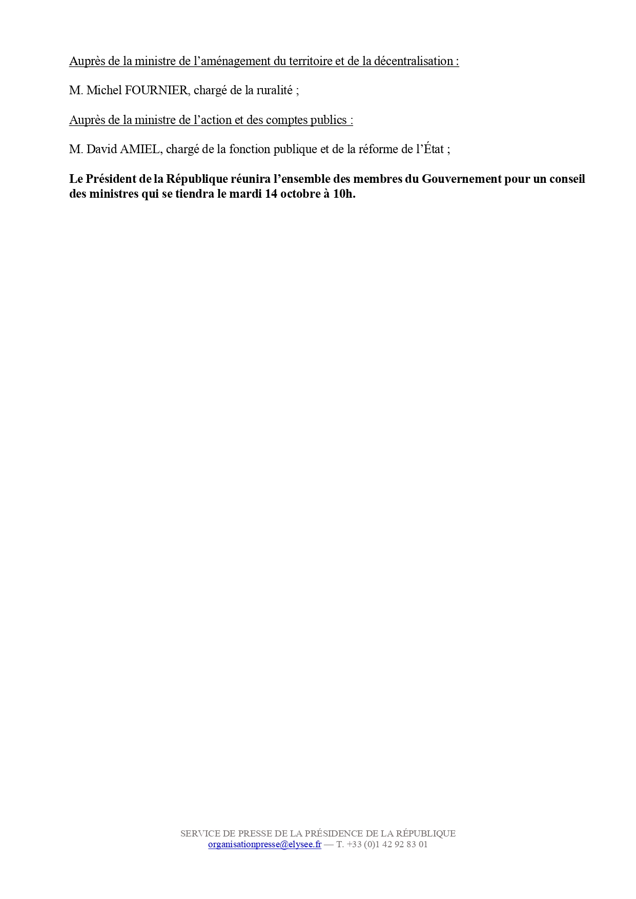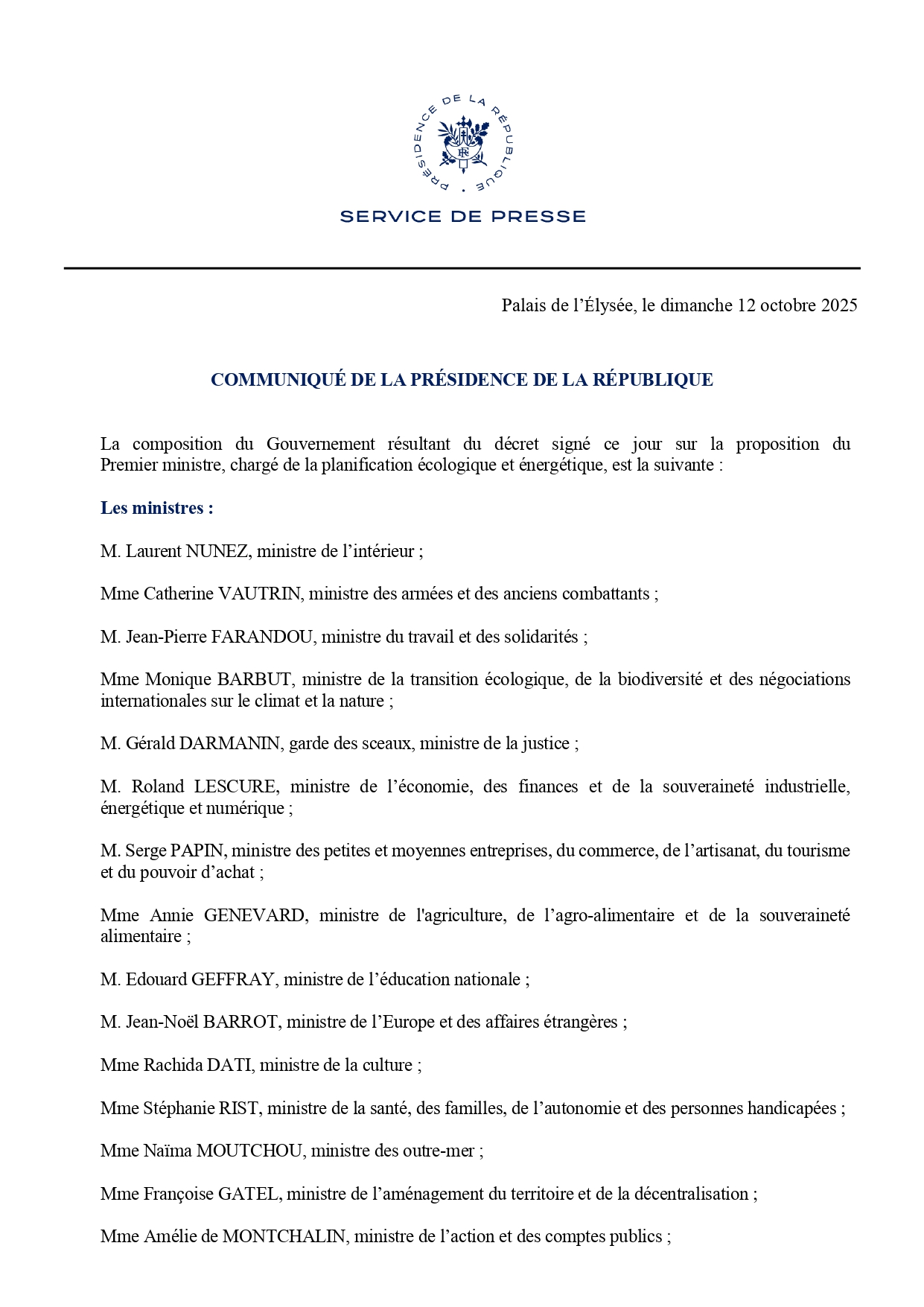 Sébastien Lecornu, Premier ministre reconduit après avoir démissionné, s’est entretenu avec le Président Emmanuel Macron, dans la soirée de ce dimanche 12 octobre, révèle publicsenat.fr. Et dans la foulée, précise la source, L’Elysée a annoncé par communiqué la liste des 34 ministres.