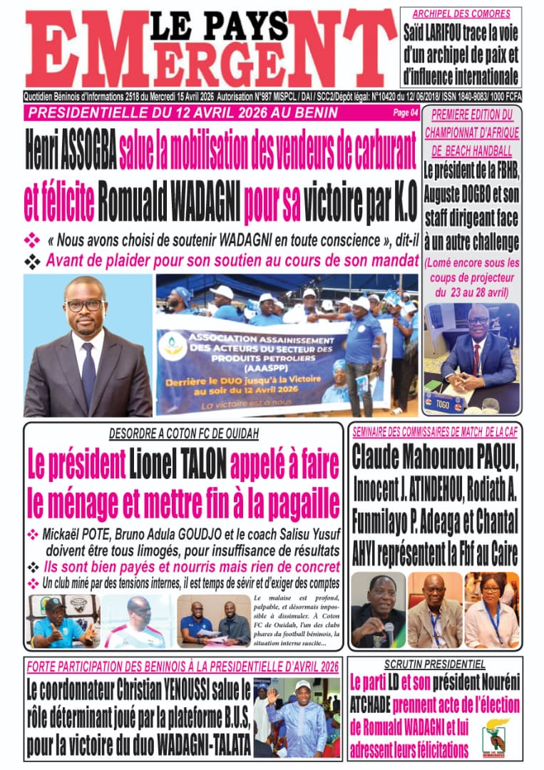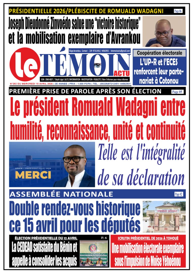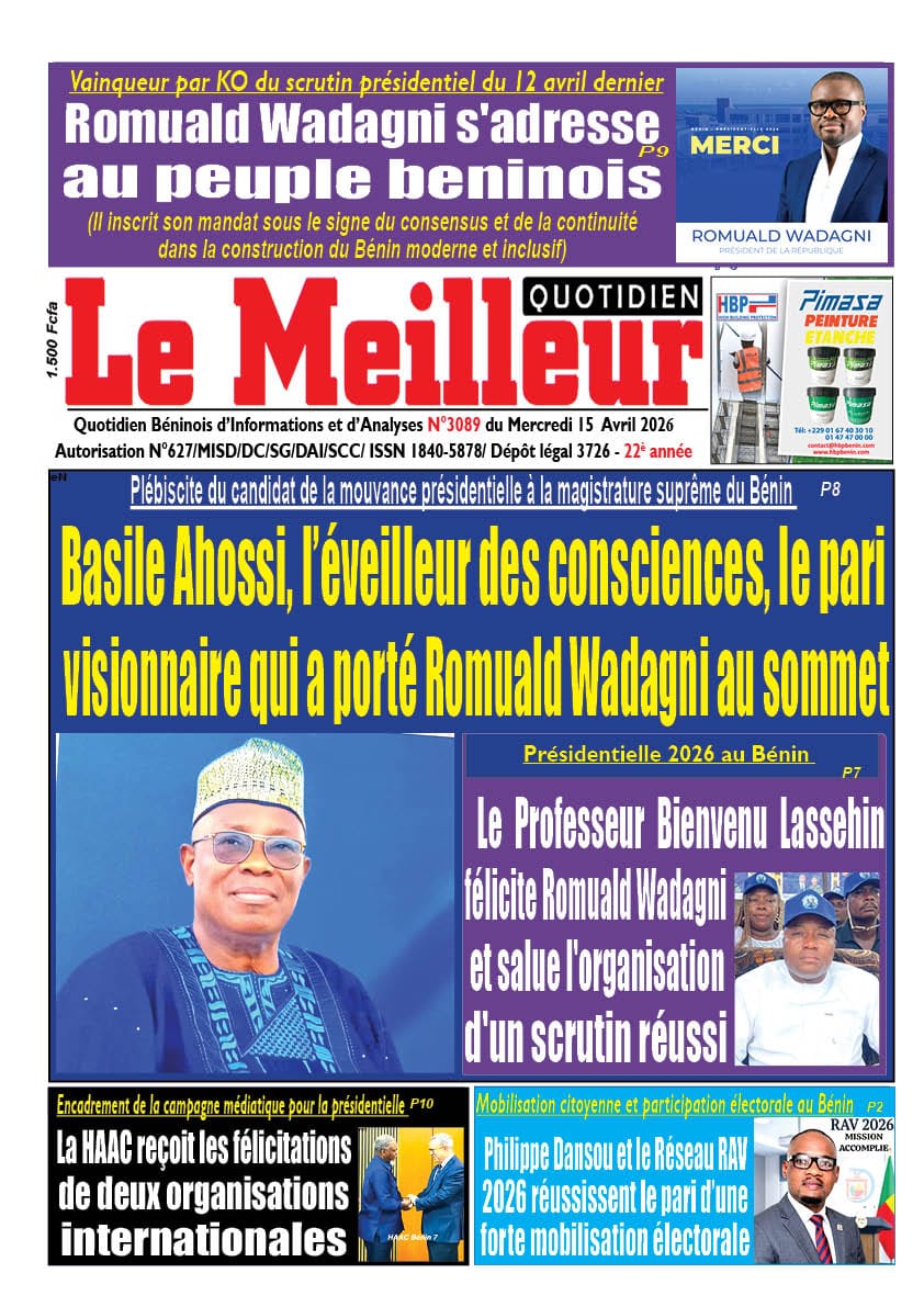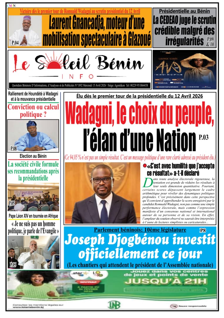 Bénin : Les journaux du mercredi 15 avril 2026 font focus sur la victoire de Romuald Wadagni à la présidentielle et les perspectives qui s’ouvrent pour le pays.