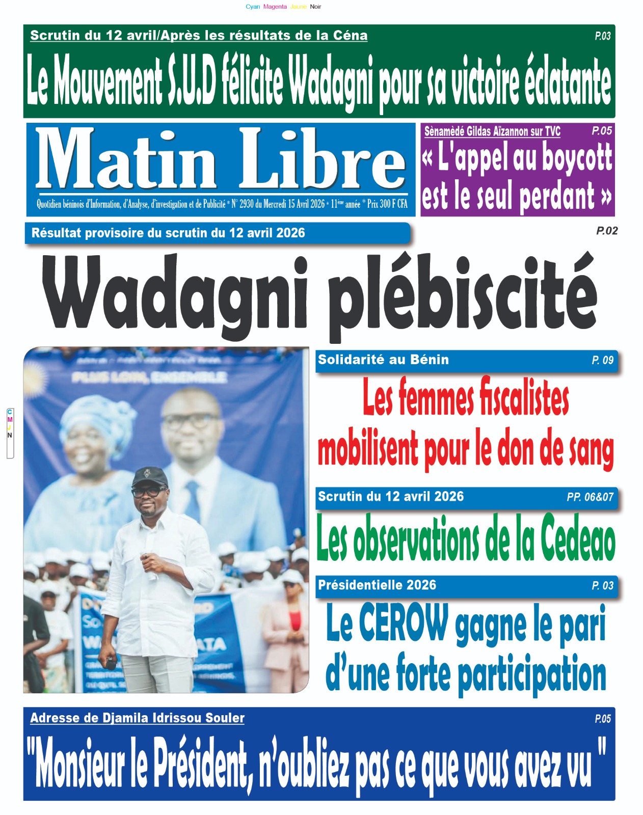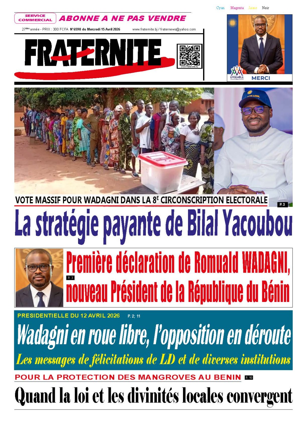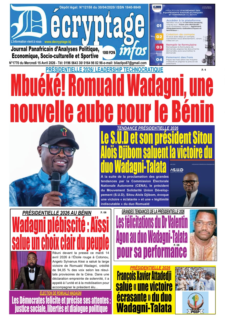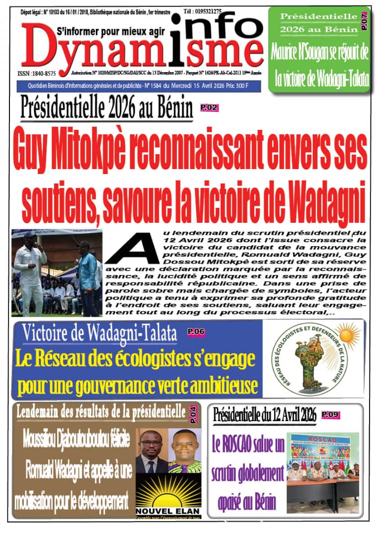 Bénin : Les journaux du mercredi 15 avril 2026 font focus sur la victoire de Romuald Wadagni à la présidentielle et les perspectives qui s’ouvrent pour le pays.