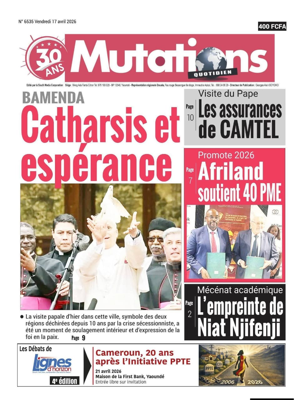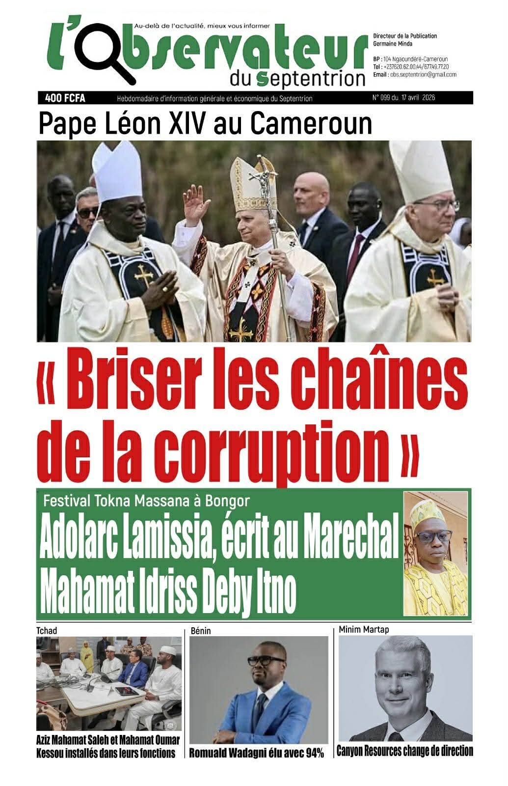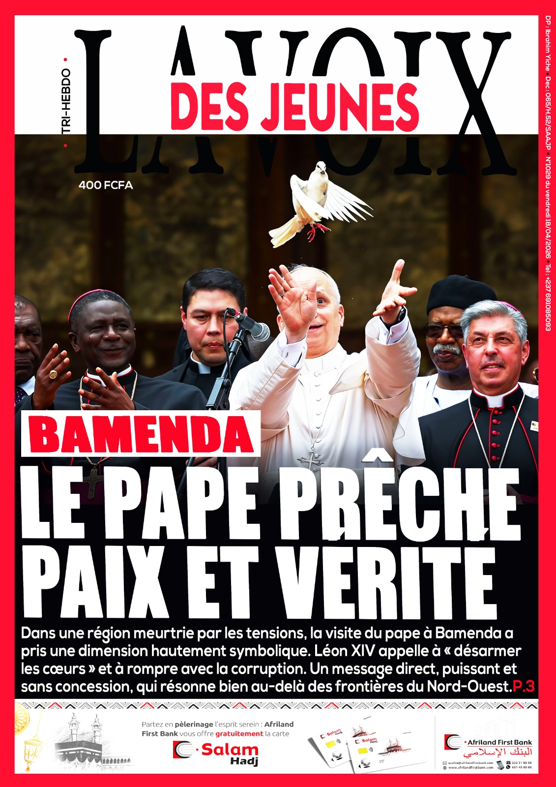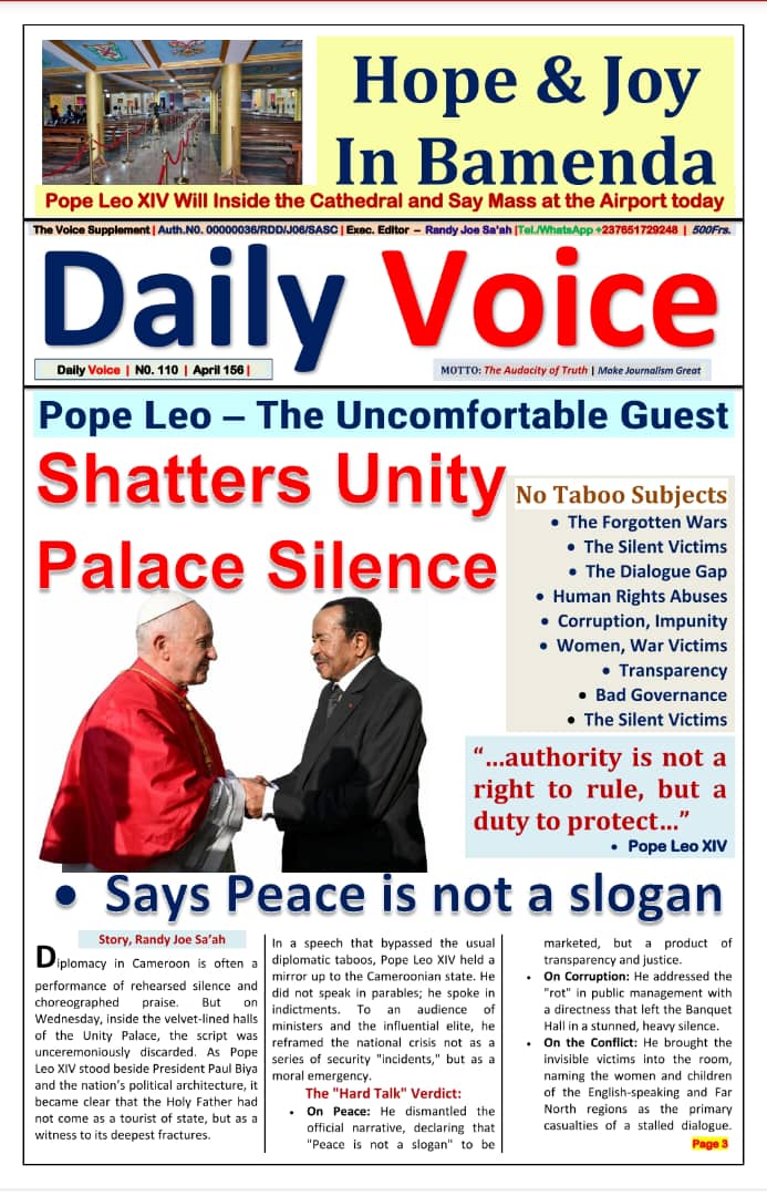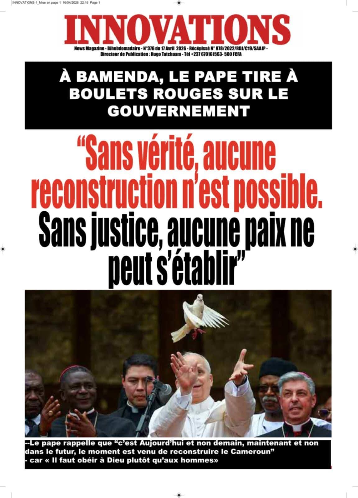 Cameroun : les journaux du vendredi 17 avril 2026 ont comme sujet principal la visite du Pape Léon XIV et notamment de l’étape de Bamenda, dans la partie anglophone du pays secouée par des revendications indépendantistes.