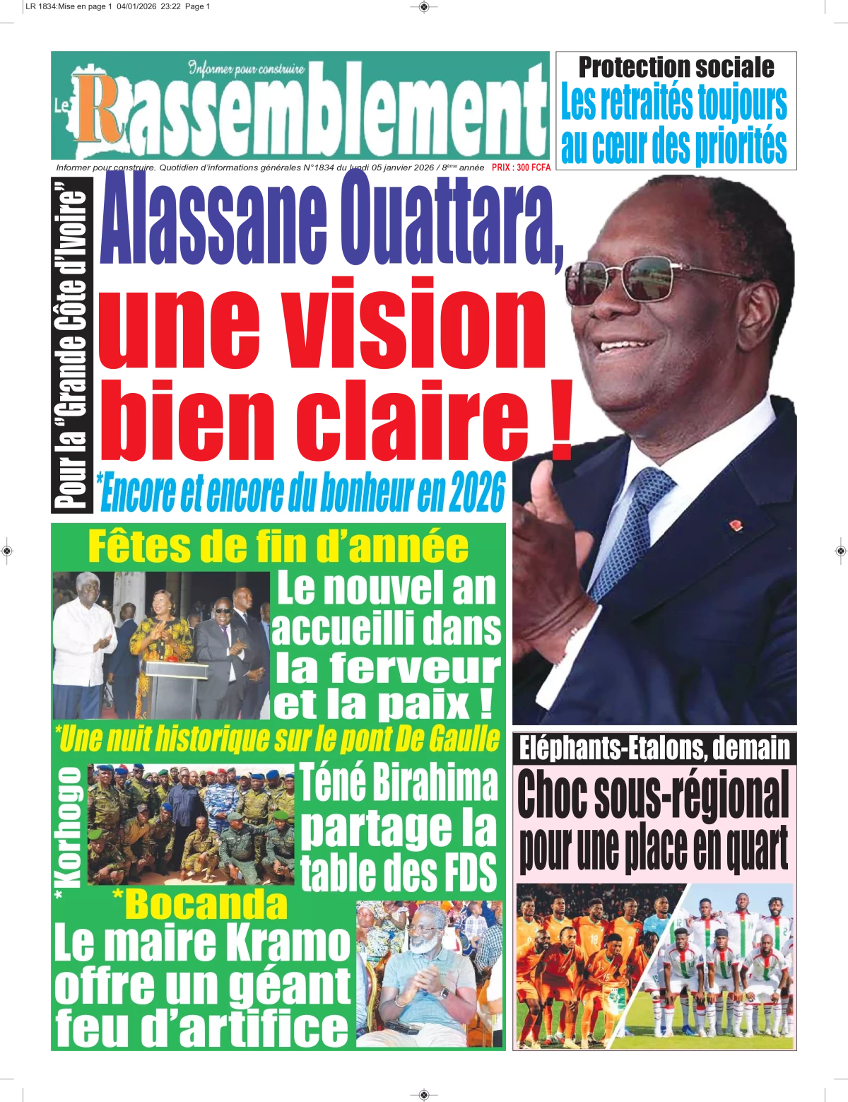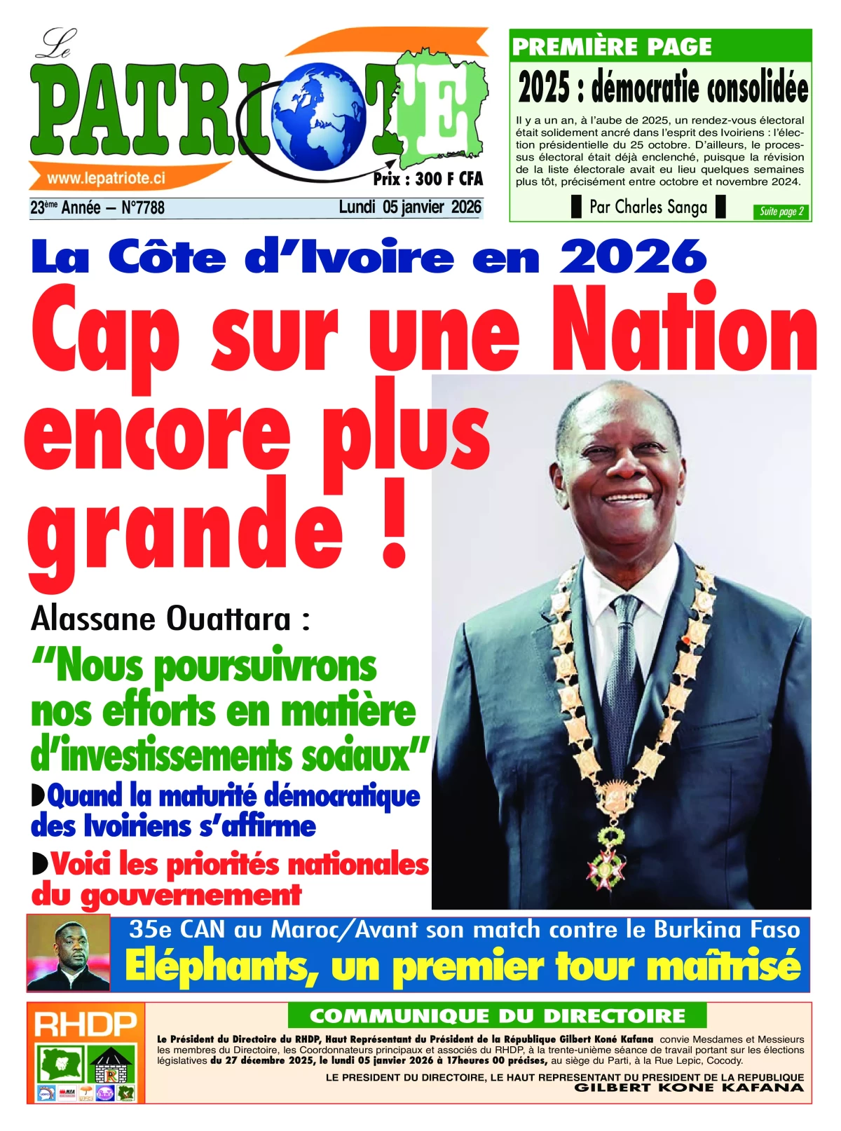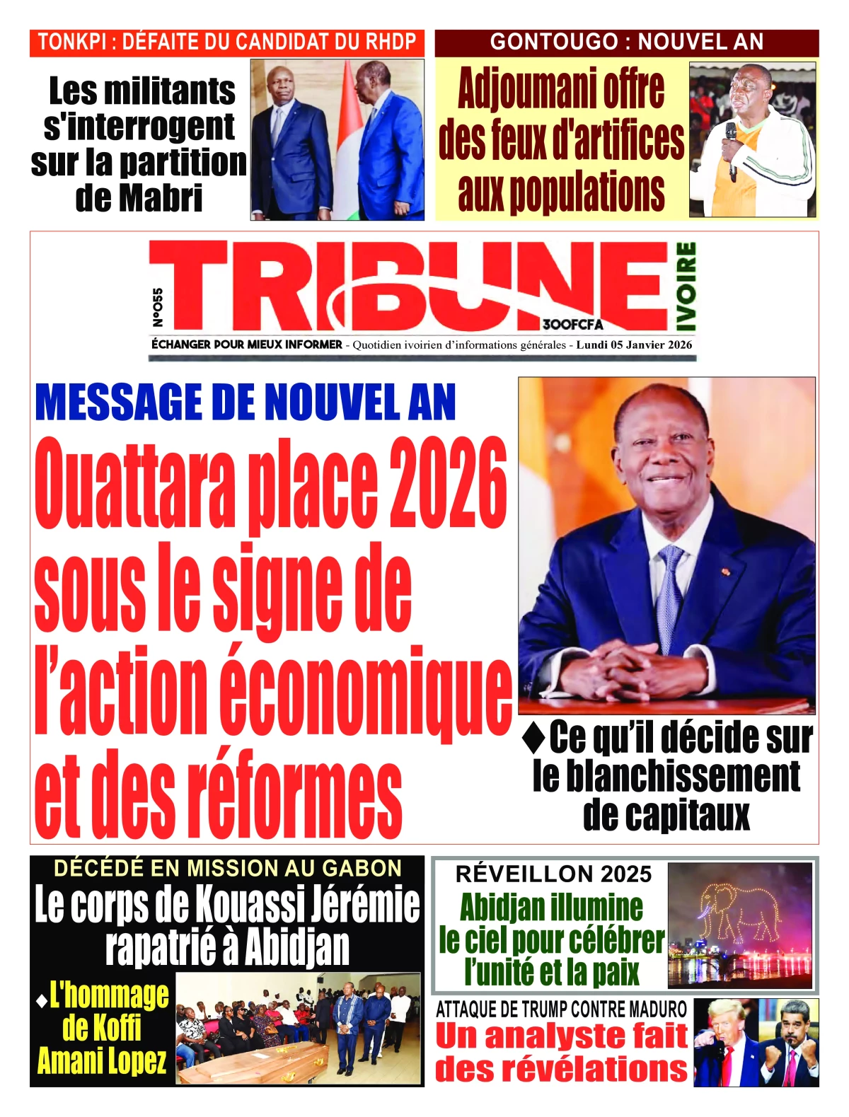 Côte d’Ivoire : les journaux du lundi 05 janvier 2026 sont très nombreux à revenir le discours de Nouvel An du Président Alassane Ouattara, le premier depuis sa réélection en octobre 2025 pour un 4e mandat.