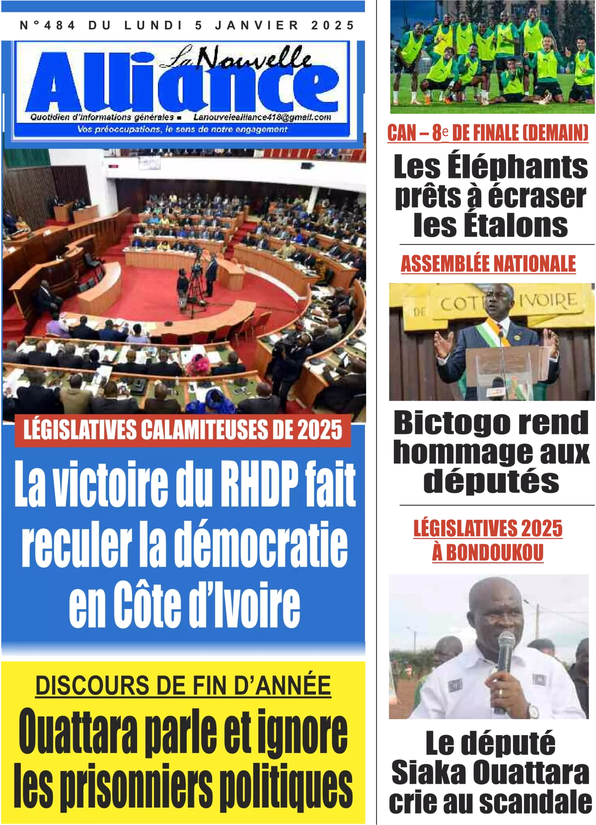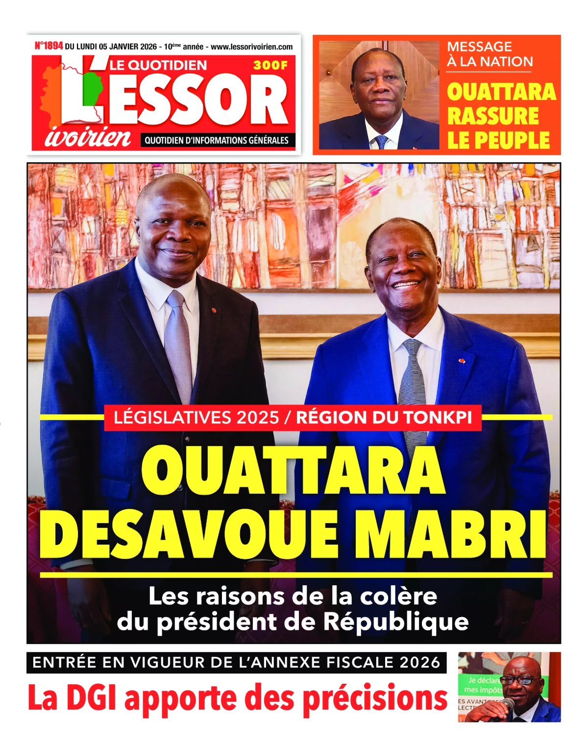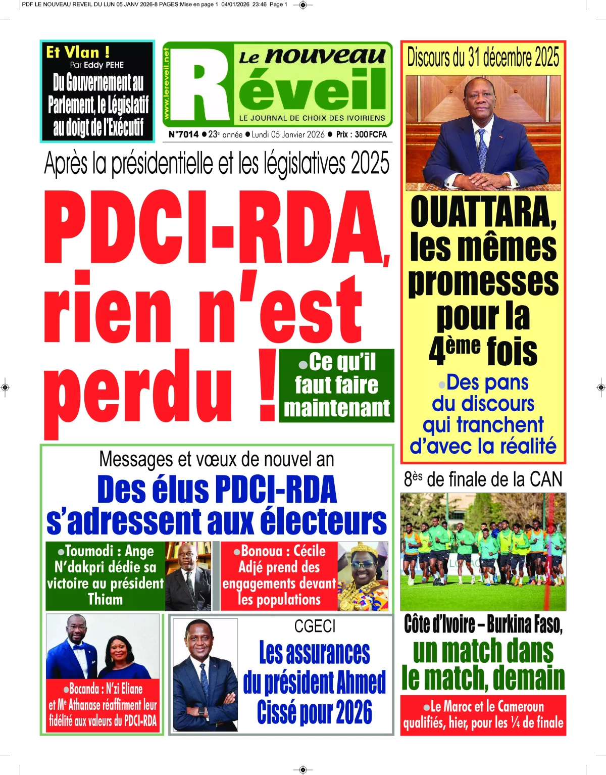 Côte d’Ivoire : les journaux du lundi 05 janvier 2026 sont très nombreux à revenir le discours de Nouvel An du Président Alassane Ouattara, le premier depuis sa réélection en octobre 2025 pour un 4e mandat.