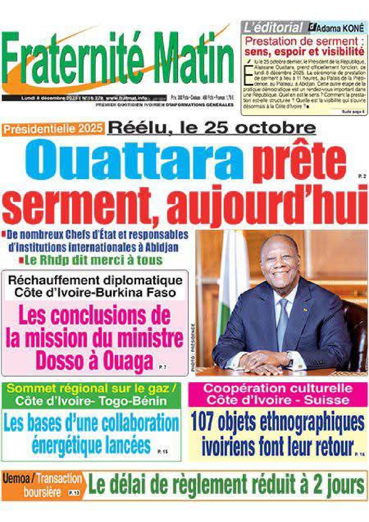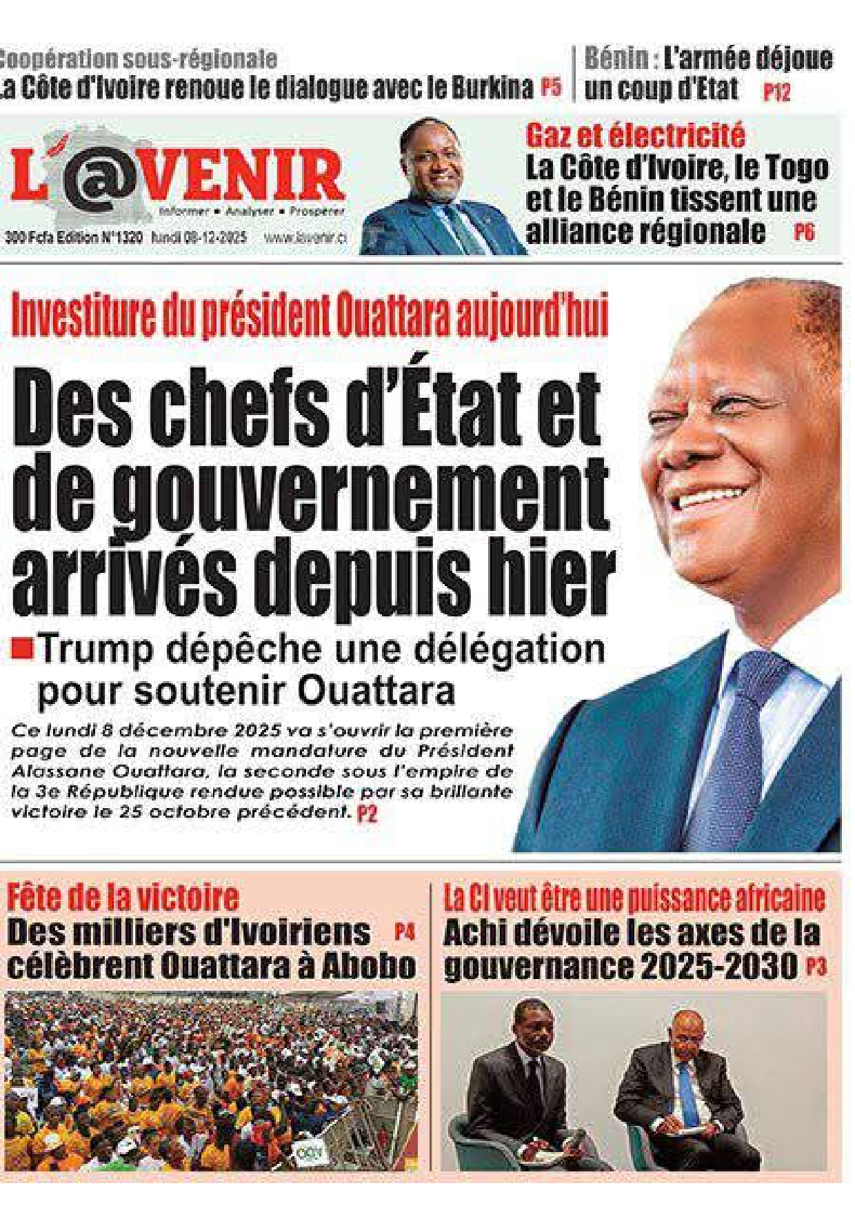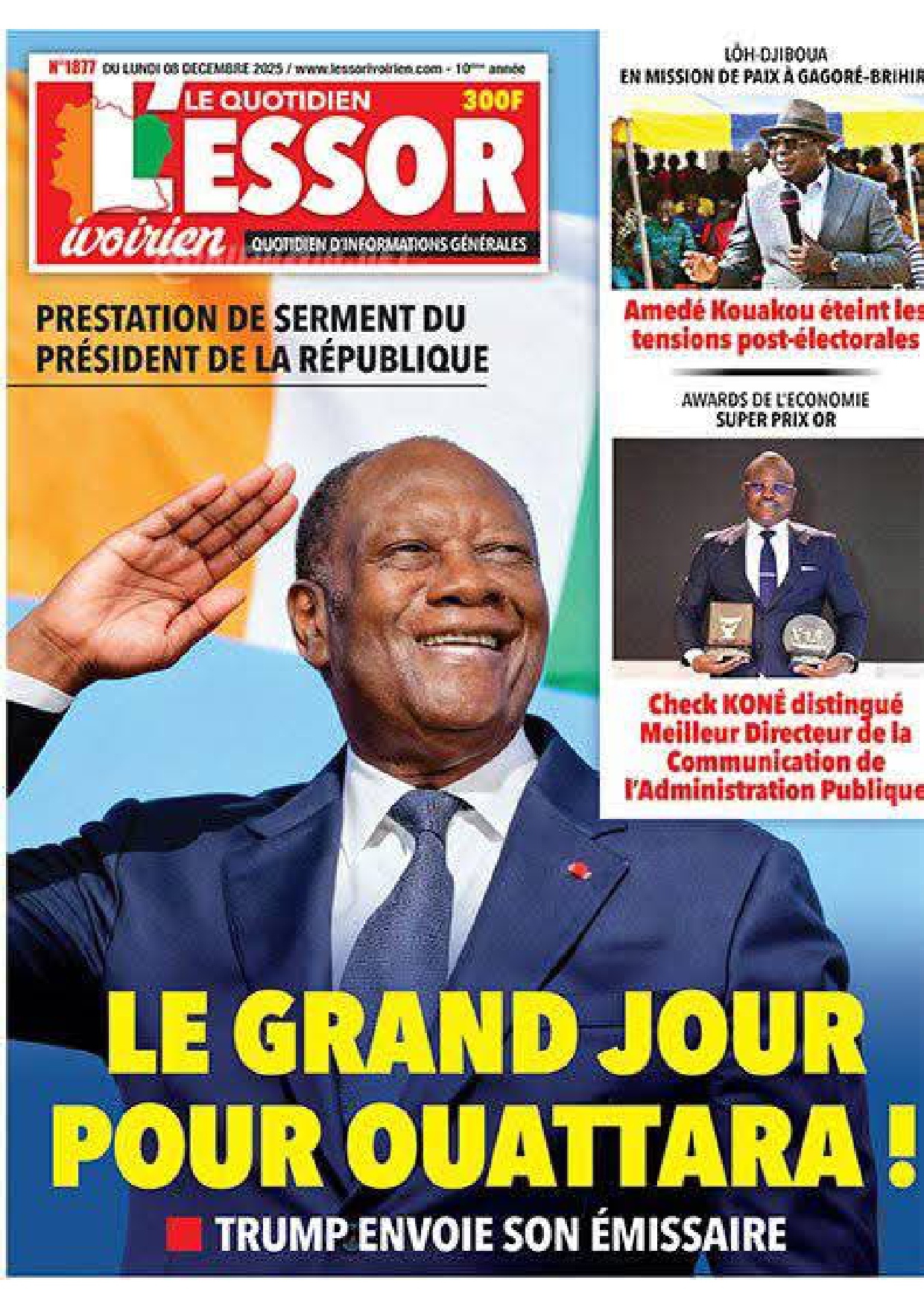 Côte d’Ivoire : les journaux du lundi 07 décembre 2025 met notamment en exergue la prestation de serment du Président Alassane Ouattara pour un 4e mandat, en présence de plusieurs de ses collègues dont le Chef de l’Etat sénégalais Bassirou Diomaye Faye.