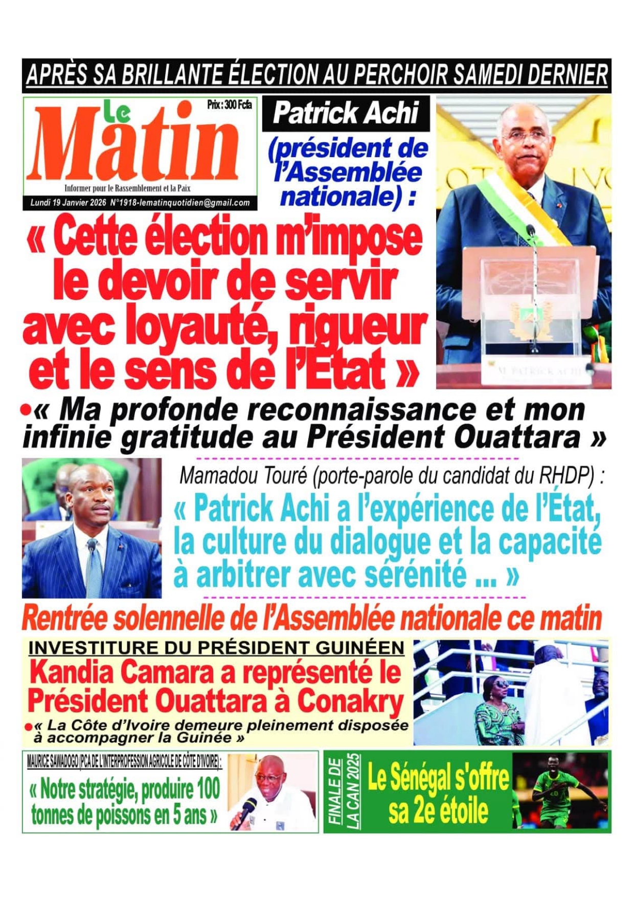 Côte d’Ivoire : les journaux du lundi 18 janvier 2026 reviennent sur l’élection de Patrick Achi à la présidence de l’Assemblée Nationale. Certains titres évoquent aussi les perspectives liées à la nomination par le Président Alassane Ouattara du Vice-président et du Premier ministre.