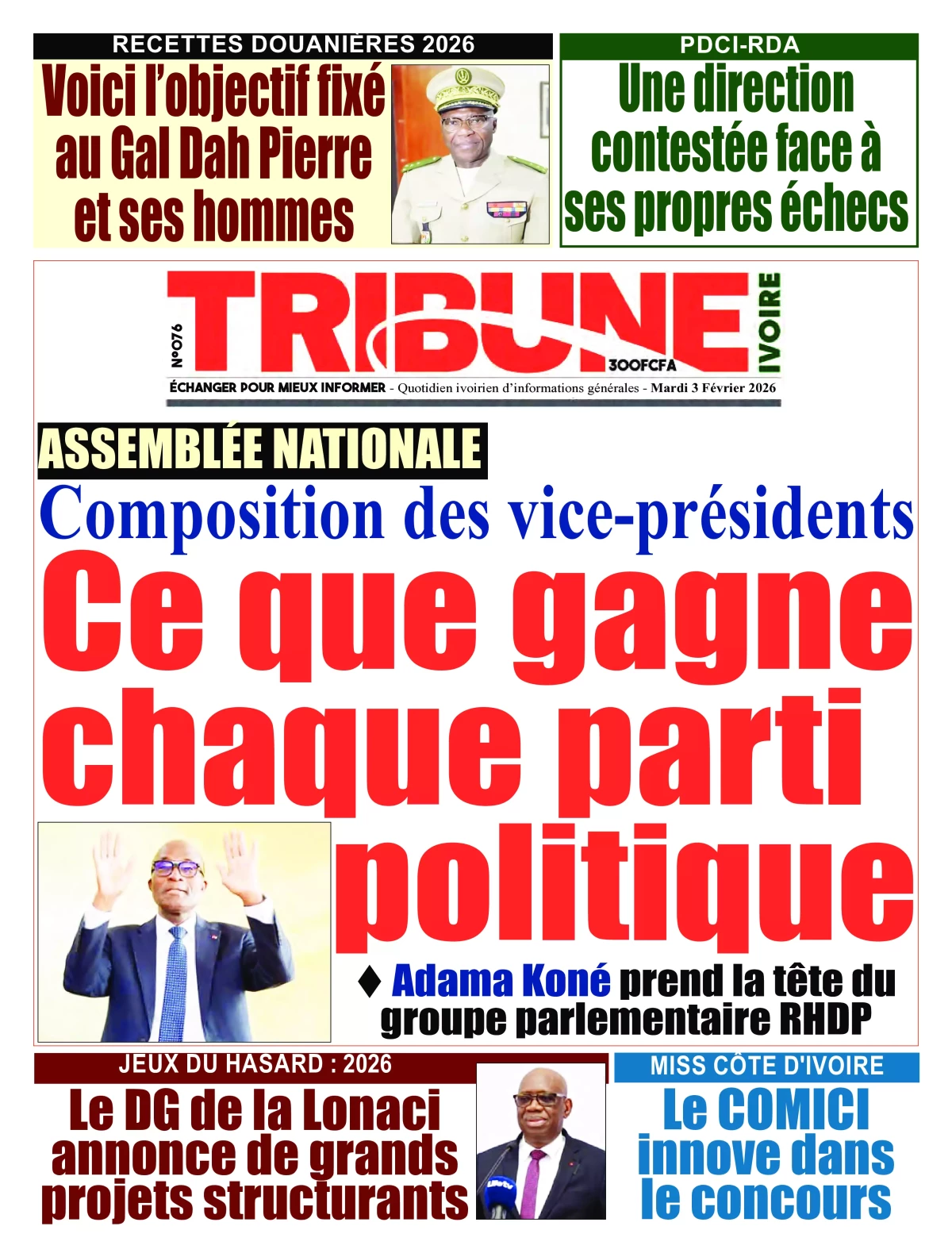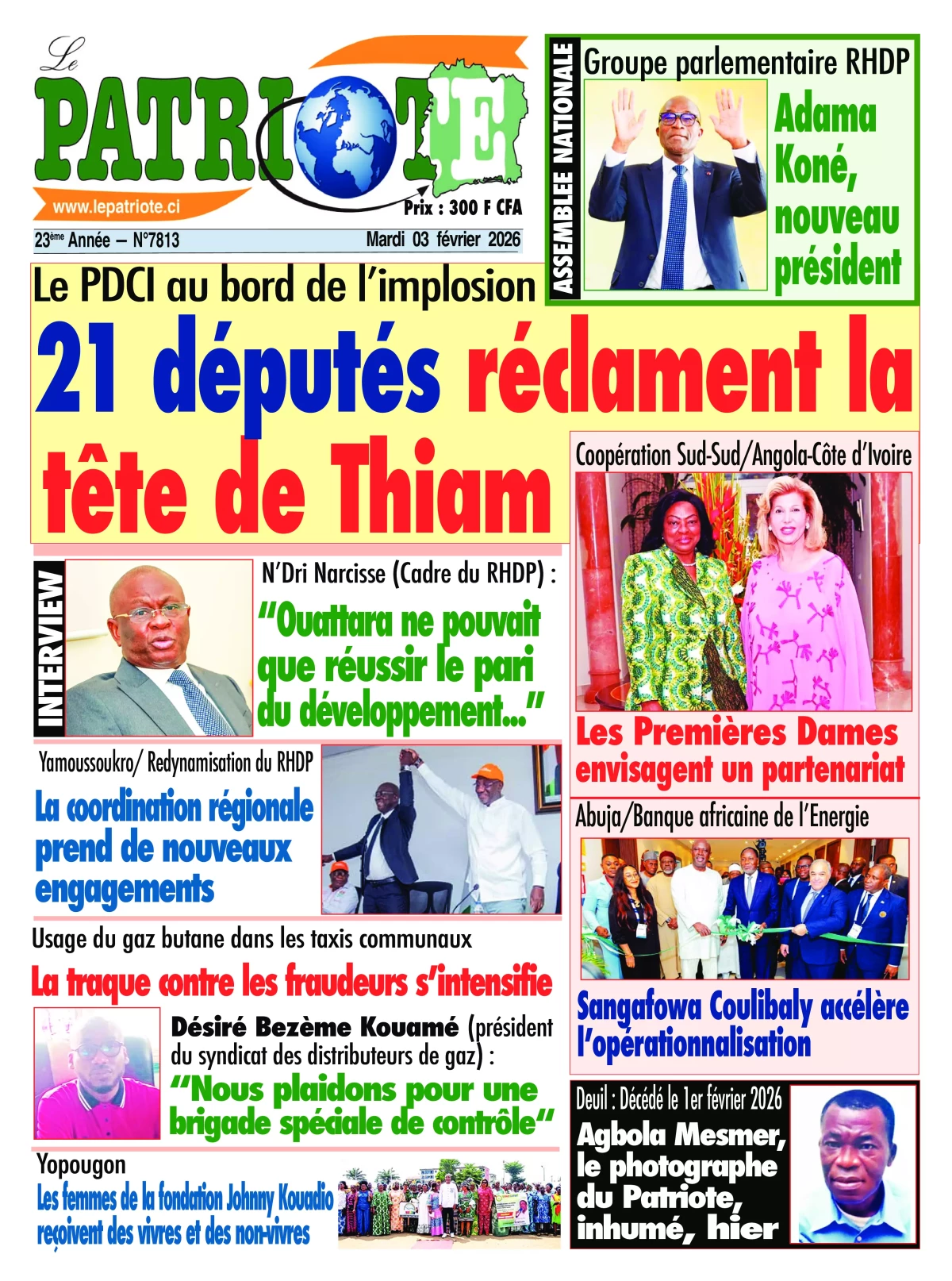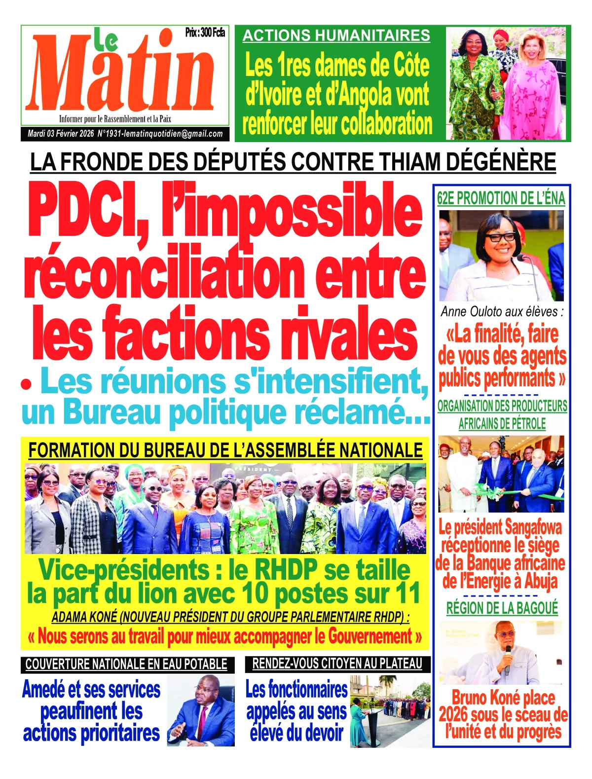 Côte d’Ivoire : les journaux du mardi 03 février 2026 sont fortement politique avec notamment le bruit de bottes au PDCI où des députés réclament la tête de leur président, Tidiane Thiam et la distribution des postes par le RHDP du Président Ouattara à l’Assemblée Nationale.
