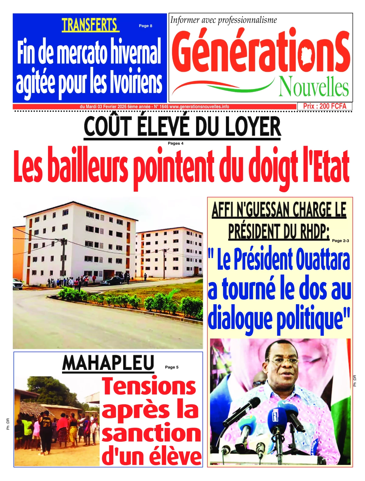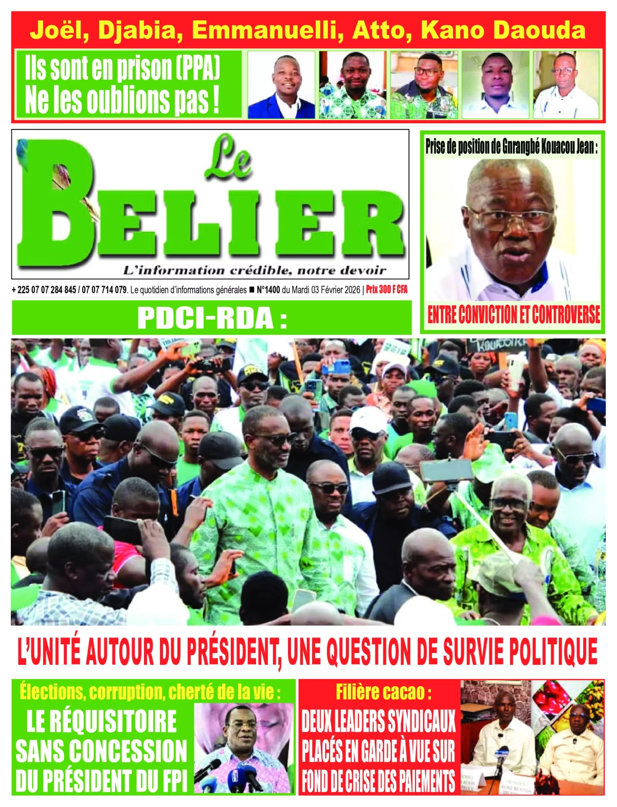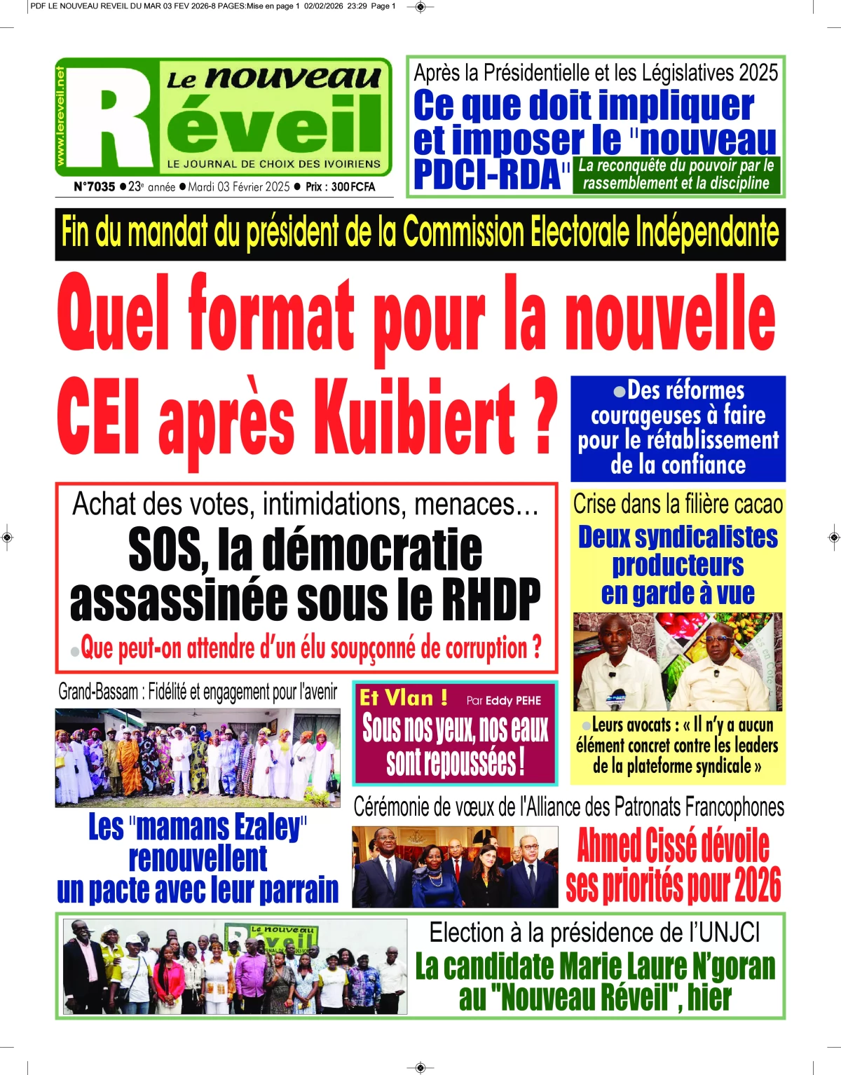 Côte d’Ivoire : les journaux du mardi 03 février 2026 sont fortement politique avec notamment le bruit de bottes au PDCI où des députés réclament la tête de leur président, Tidiane Thiam et la distribution des postes par le RHDP du Président Ouattara à l’Assemblée Nationale.