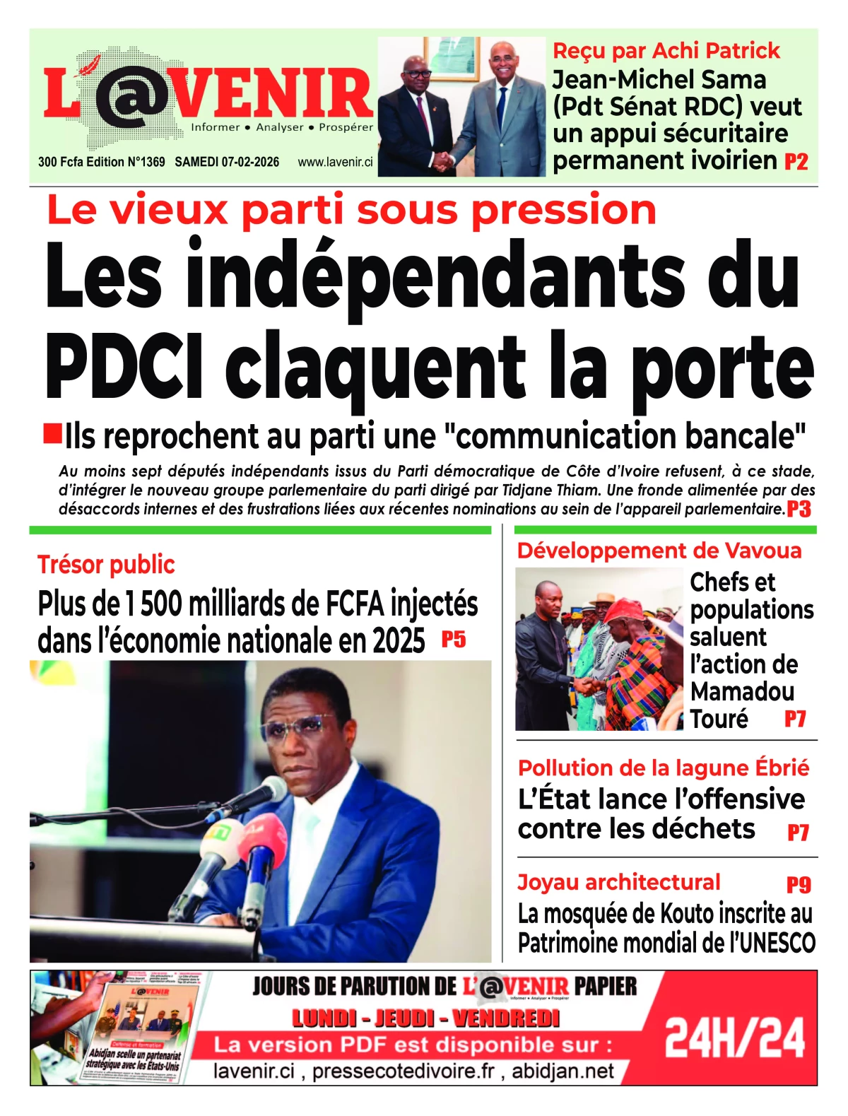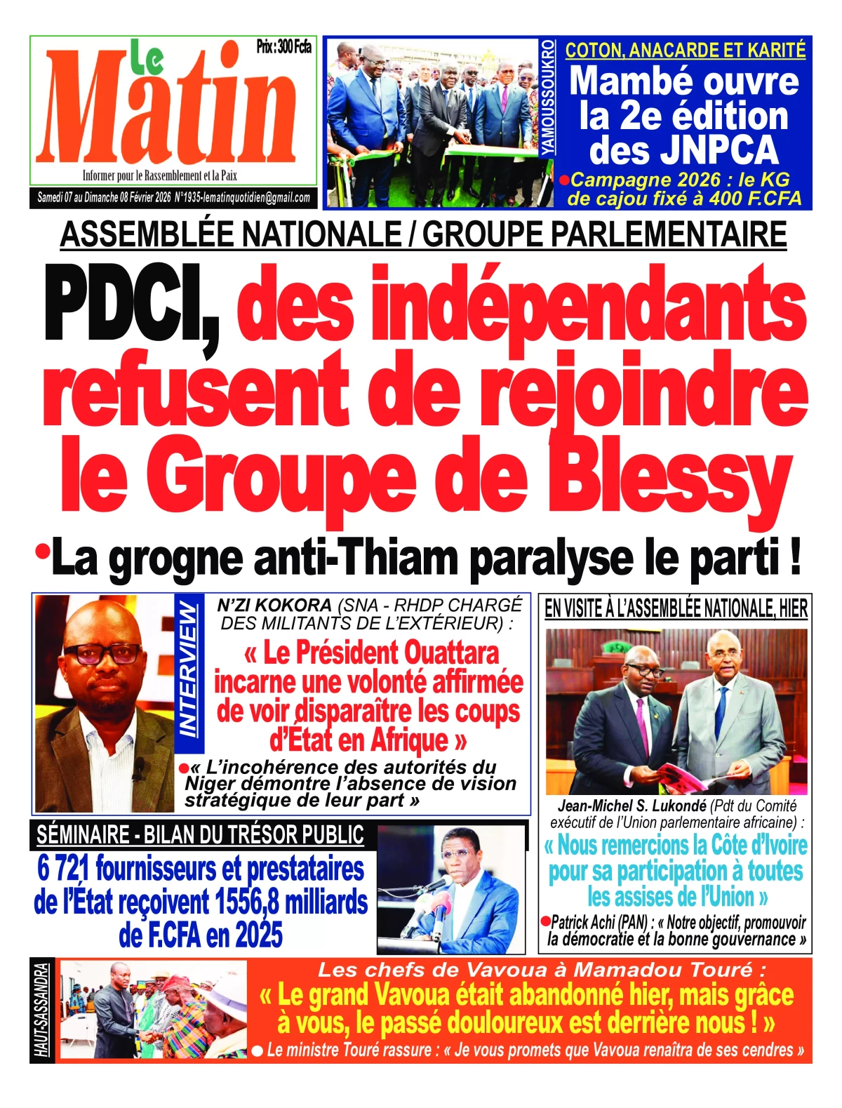 Côte d’Ivoire : les journaux du samedi 07 février 2026 font leur UNE avec, entre autres, les tensions au sein du parti historique PDCI-RDA avec la contestation de plus en plus vive du Président Tidiane Thiam.